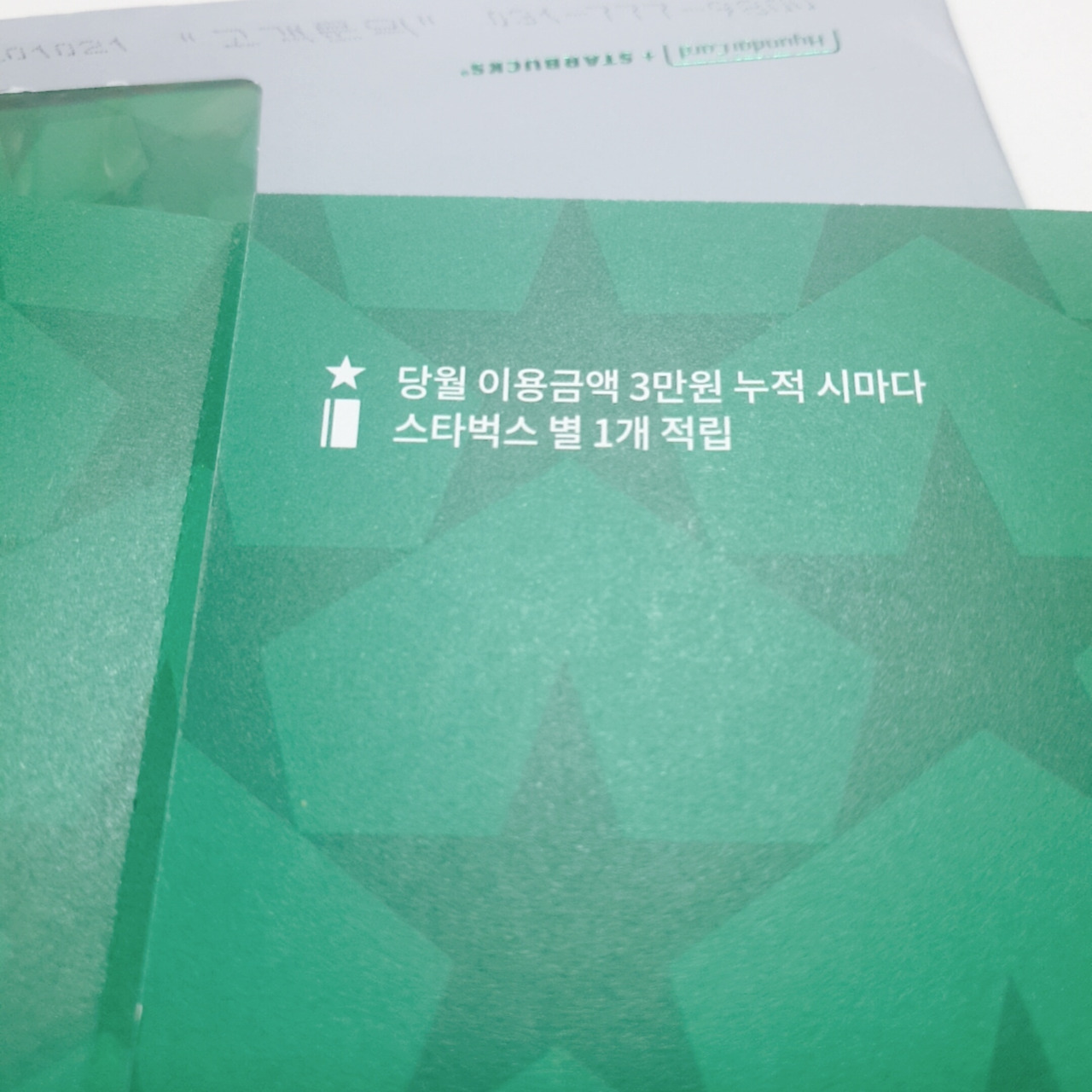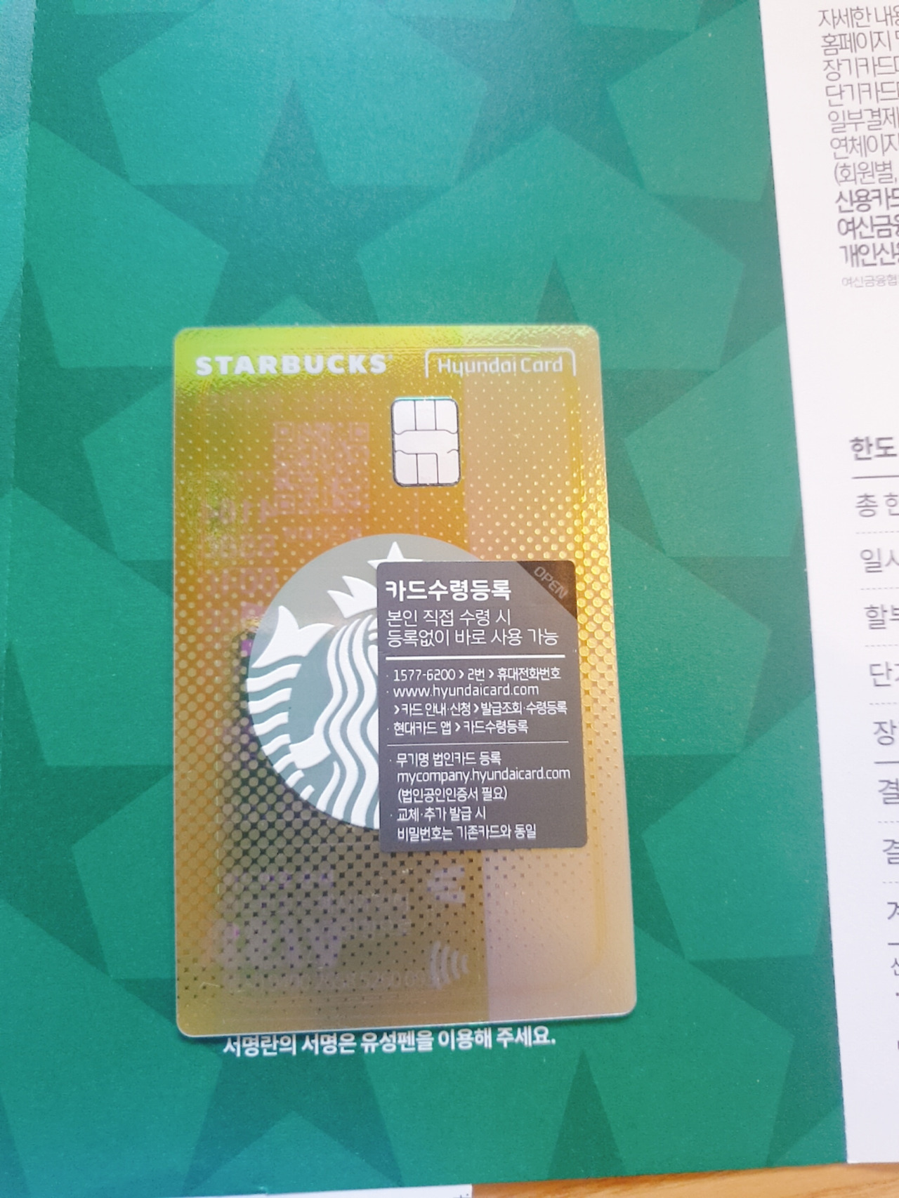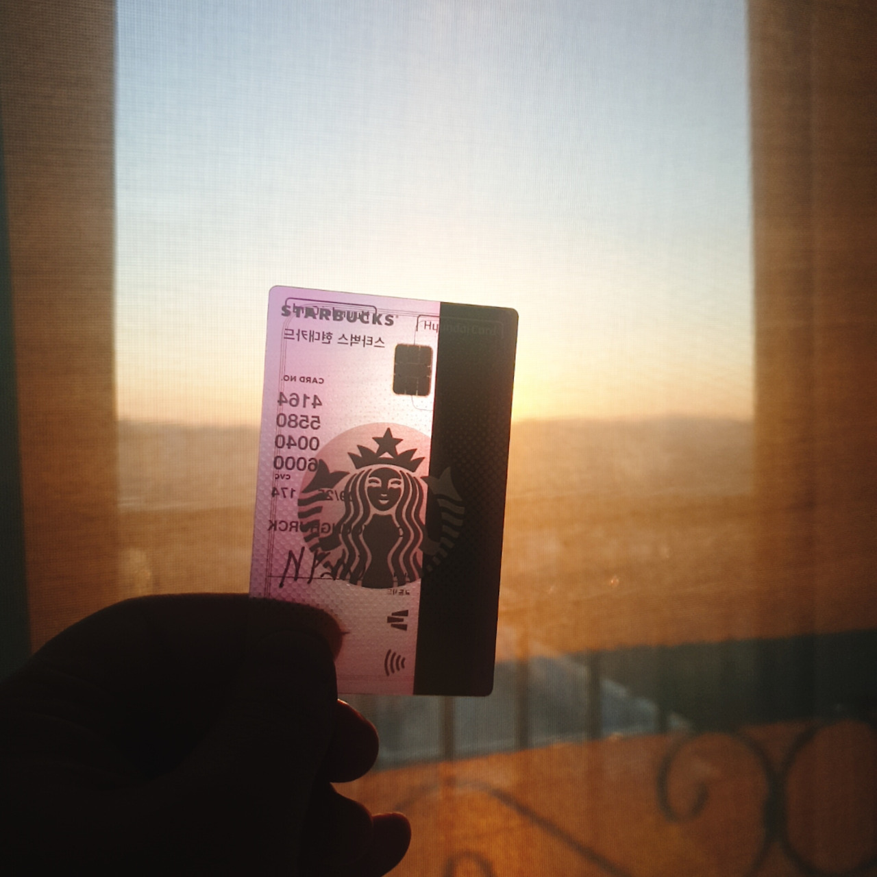 스타벅스의 계절이 다가옵니다.11월이면 다이어리를 위한 프리컨시가 시작됩니다. 그때 적합한 카드랍니다. 3만원에 별하나그리고, 디자인도 멋집니다.최근 스마트폰 기계값 할인 이벤트 할인 카드가 종료되어 신규 카드 알아보는 중에 딱입니다. 굿!