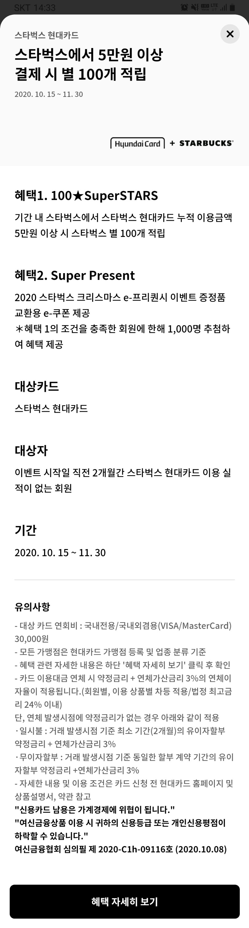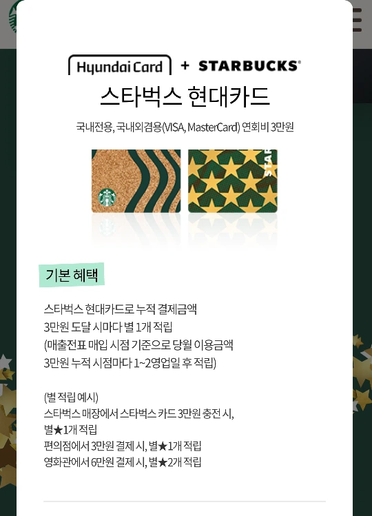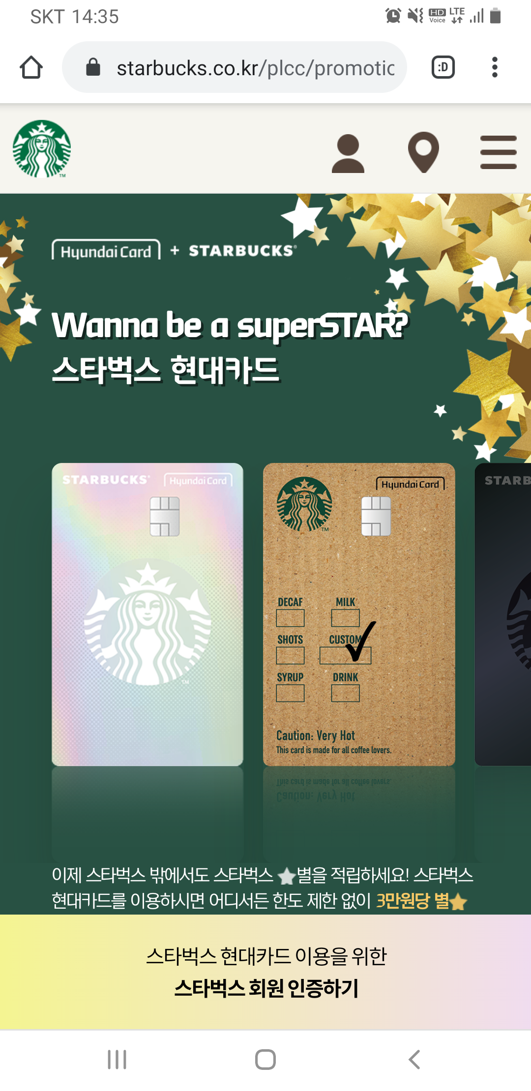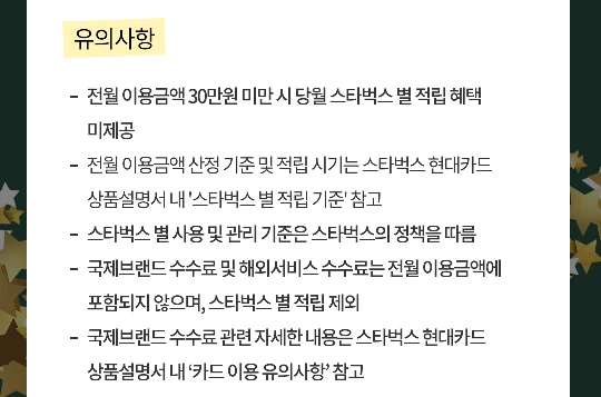 스타벅스의 계절이 다가옵니다.11월이면 다이어리를 위한 프리컨시가 시작됩니다. 그때 적합한 카드랍니다. 3만원에 별하나그리고, 디자인도 멋집니다.최근 스마트폰 기계값 할인 이벤트 할인 카드가 종료되어 신규 카드 알아보는 중에 딱입니다. 굿!