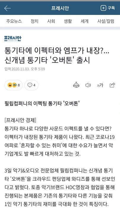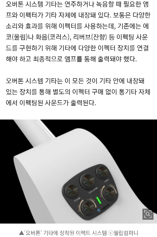필립컴퍼니의 이펙팅 통기타 '오버톤' [프레시안 경제] 통기타 하나로 다양한 사운드 이펙트를 낼 수 있다면? 이펙터가 내장된 통기타 제품이 나왔다. 최근 코로나19 여파로 '혼자할 수 있는 취미