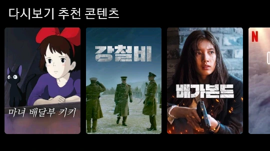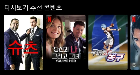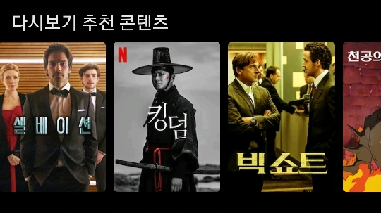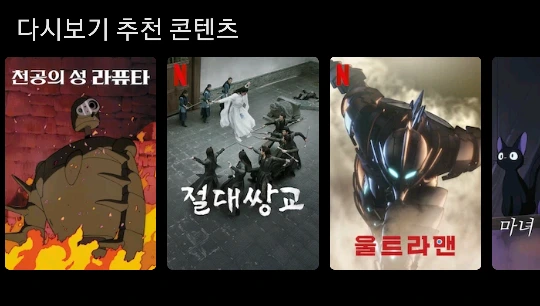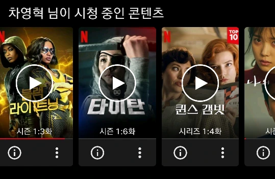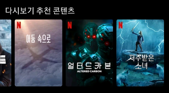 주로 노출되는 메인 페이지에 내가 찜한 콘텐츠, 시청 중인 콘텐츠, 다시 보기 추천 콘텐츠와 그리고 시청기록입니다.