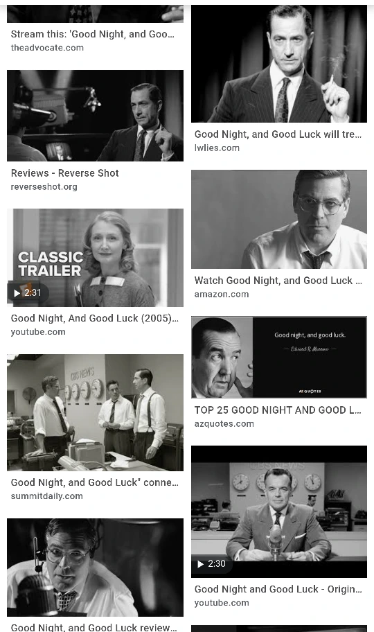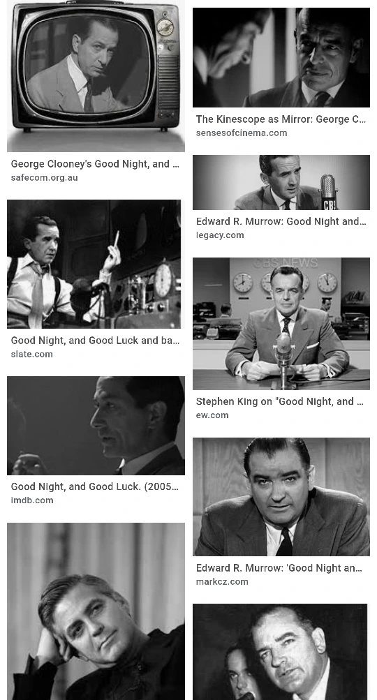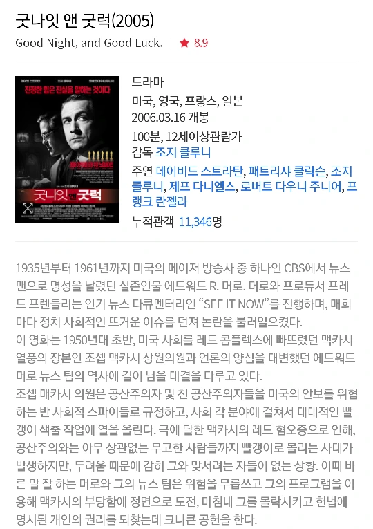 전설적인 TV 뉴스 앵커 에드워드 머로. 상원위원 조지프 메카시가 주도하는 공산주의 색출 열풍과 검열에 정면으로 맞선다.