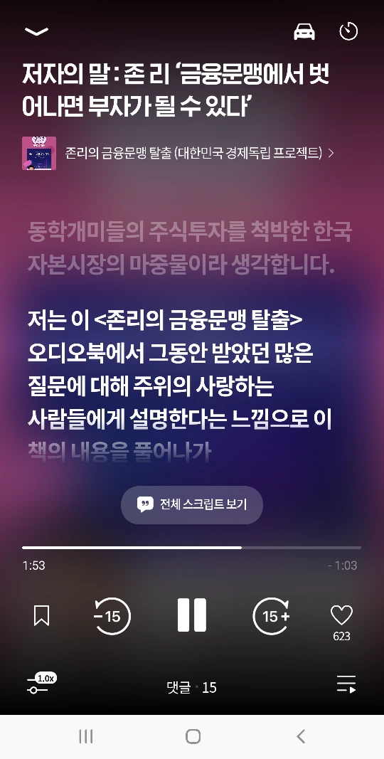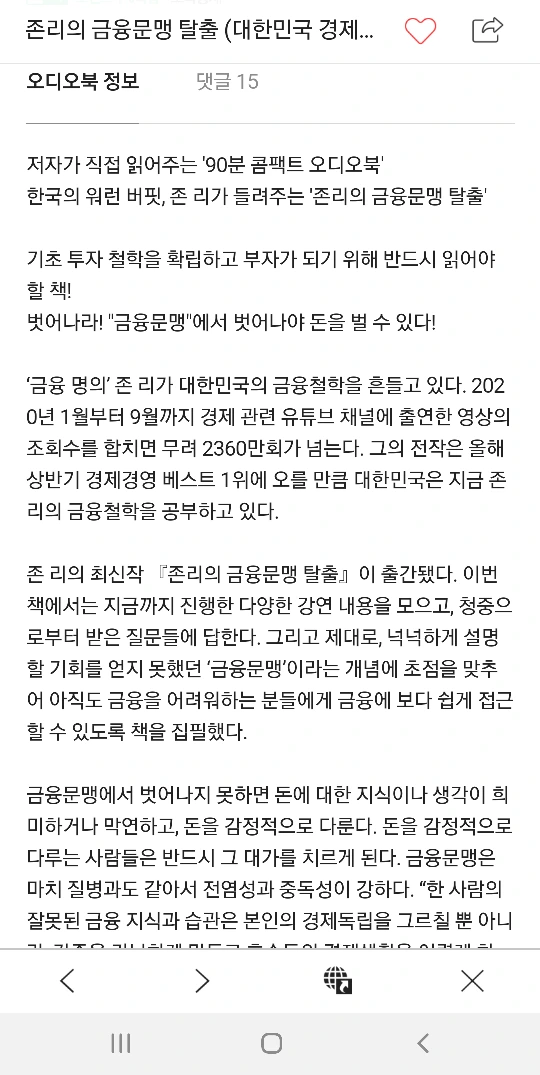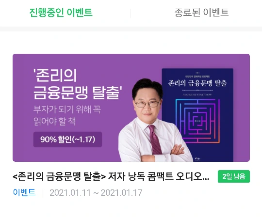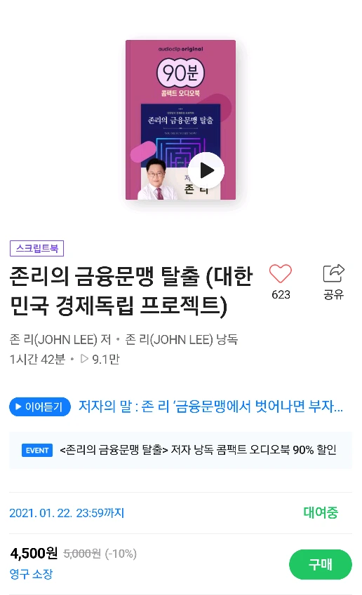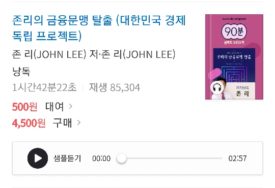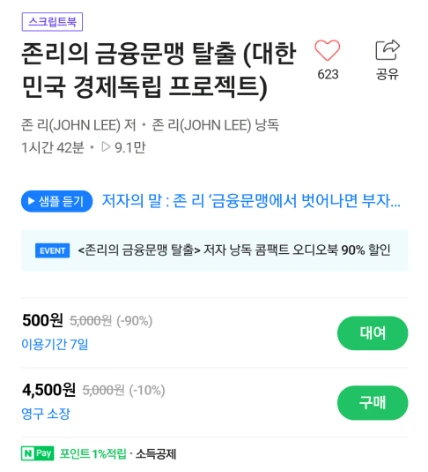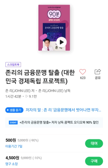 17일까지 오디오클립 이벤트 500원에 대여하고 단숨에 끝까지 다 듣습니다. 예능에도 등장할 만큼 유명인입니다. 그리고 무엇보다 시대가 주식투자를 권하고 있습니다. 저 또한 장기적인 가치투자라는 것에 공감합니다. 돈이 일하게 만드는 겁니다. 어떤 책일까 궁금하기도 합니다. 익숙하지만 낯선 저자의 목소리가 더 귀에 쏙쏙 들어옵니다.