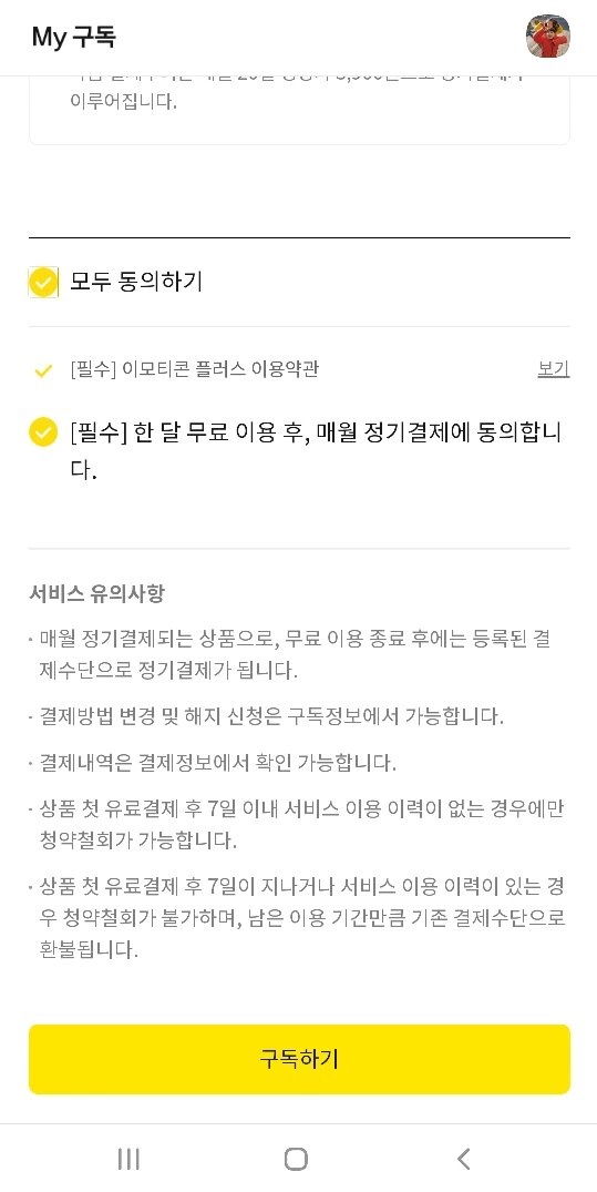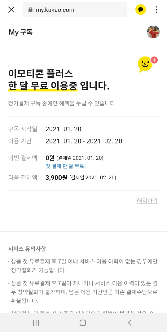 일단 무료로 신청해 봅니다. 요개는 구독 서비스가 대세이기에, 이모티콘은 어쩌면 센스장이 느낌도 있지만 너무 과도하면 식상해질 수도 있을 것 같습니다 그리고 실제로 이모티콘 주고받는 대상자가 몇 안 되는 거 같아서 한 달 판이되지 않을까 생각해 봅니다. 그래도 랜덤은 간편하고 재미납니다.