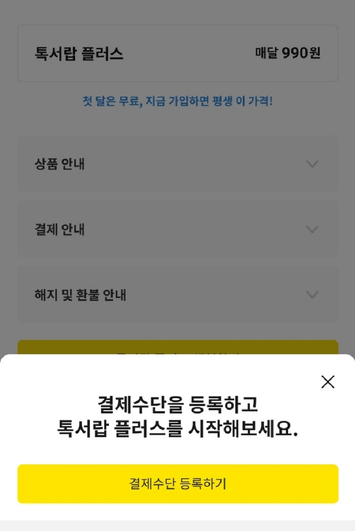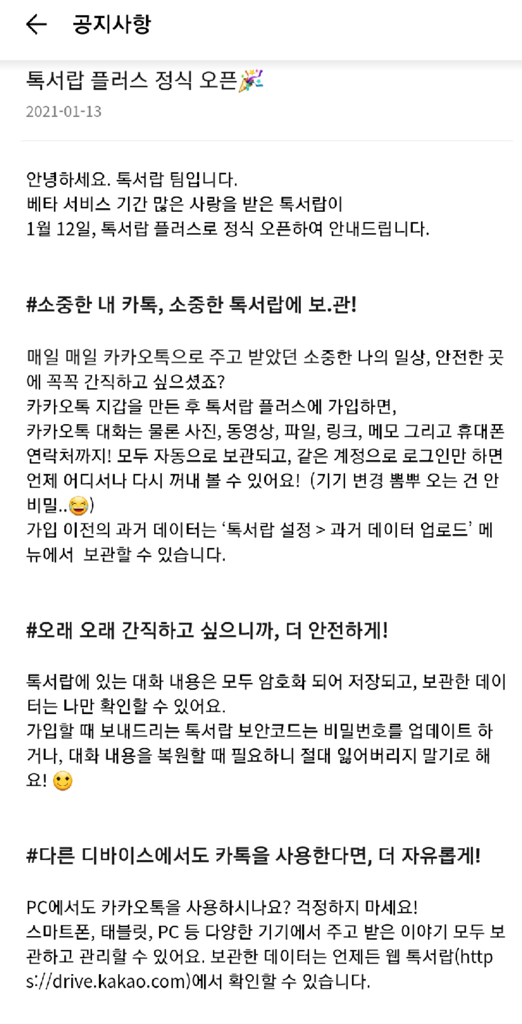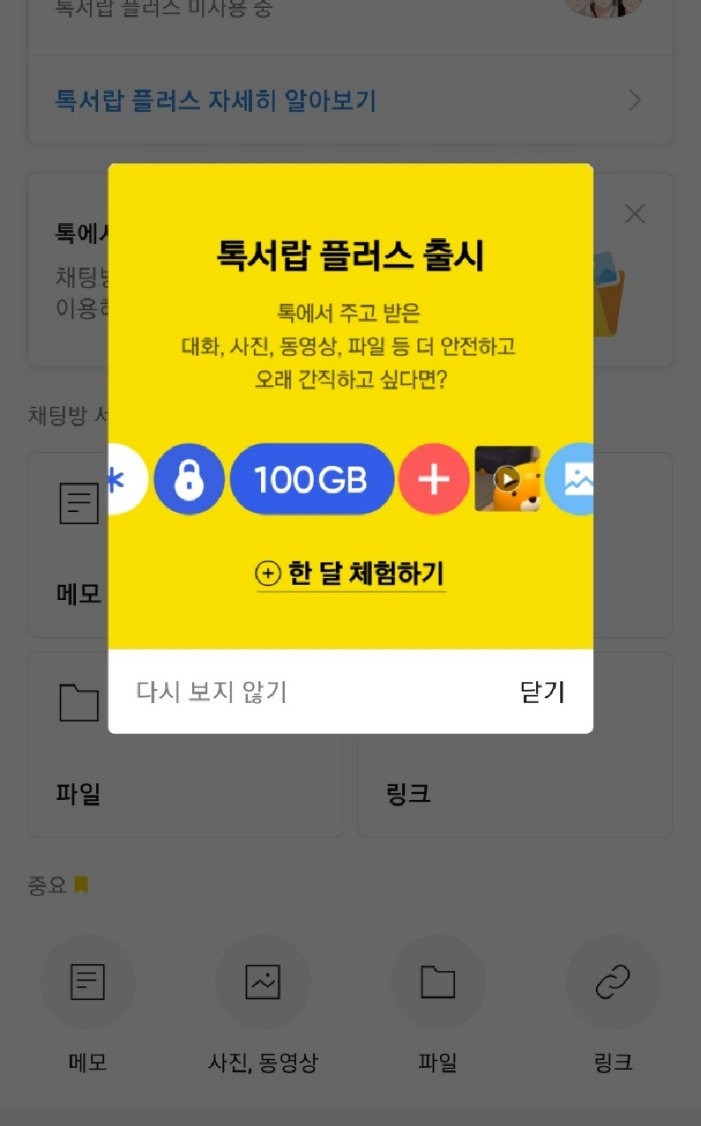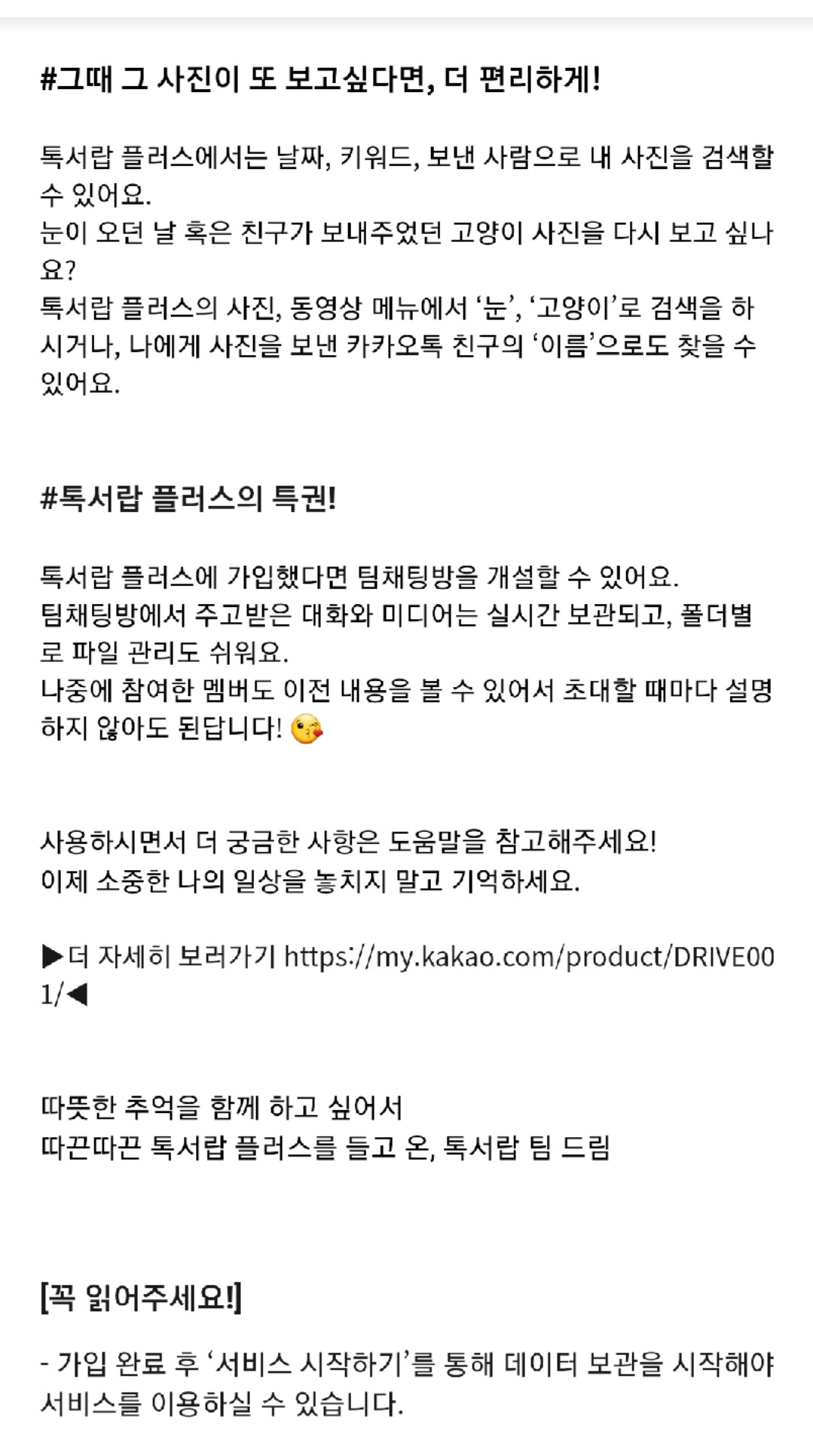 가끔 개별 톡방에서 나오고 나서, 아참~~ 필요한 내용 있었는데! 그때 누가 모라 그랬는데 하고 아쉬움을 달랠 때도 많았는데, 친구가 무조건 써보라고 한다. 한 달 무료고 비용도 부담 없다는 것이다. 솔직히 두 개 중 고민하다 톡서랍보다는 이모티콘 플러스를 선택했는데 톡서랍했다면 기존 카톡방을 고수했을 것이다. 이런 후회 프레임에 서비스를 달리 보게 된다. 서론이 길었다.