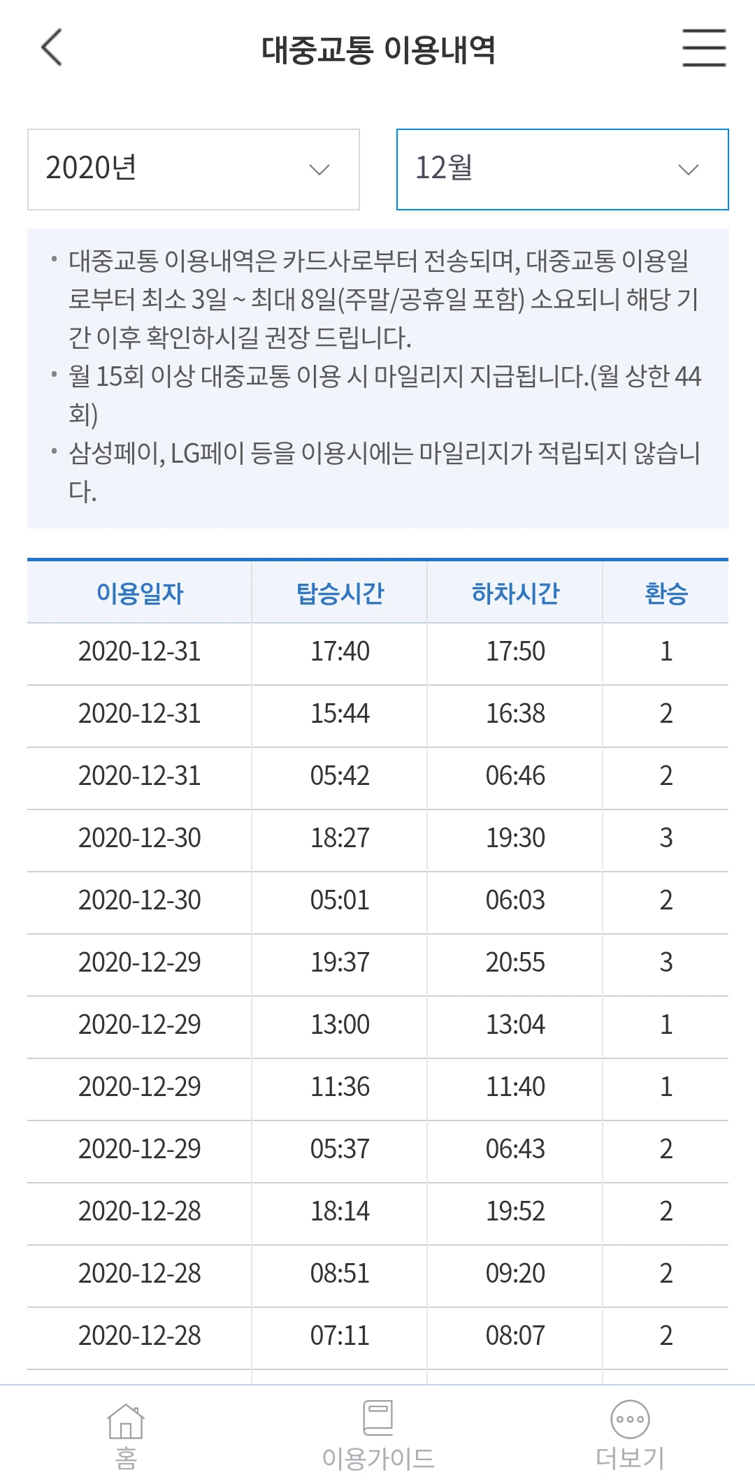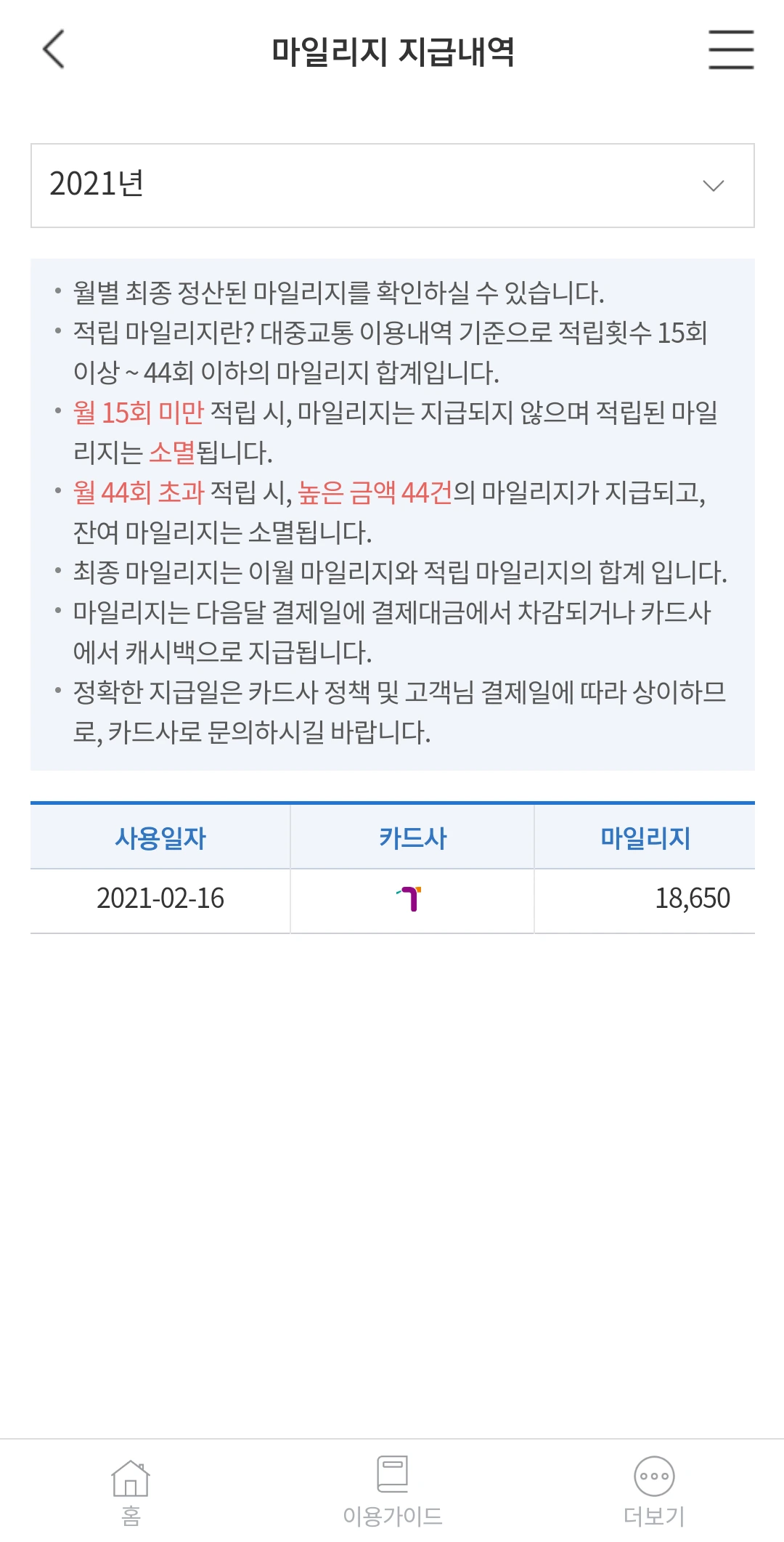 티머니 사용기, 21년 2월에 마일리지가 생각보다 많이 들어왔습니다. 마일리지 기간에 대하여서는 모호하기도 합니다. 12월 중간부터 시작했으니 한 달 반으로로 봐야 할 것 같습니다.