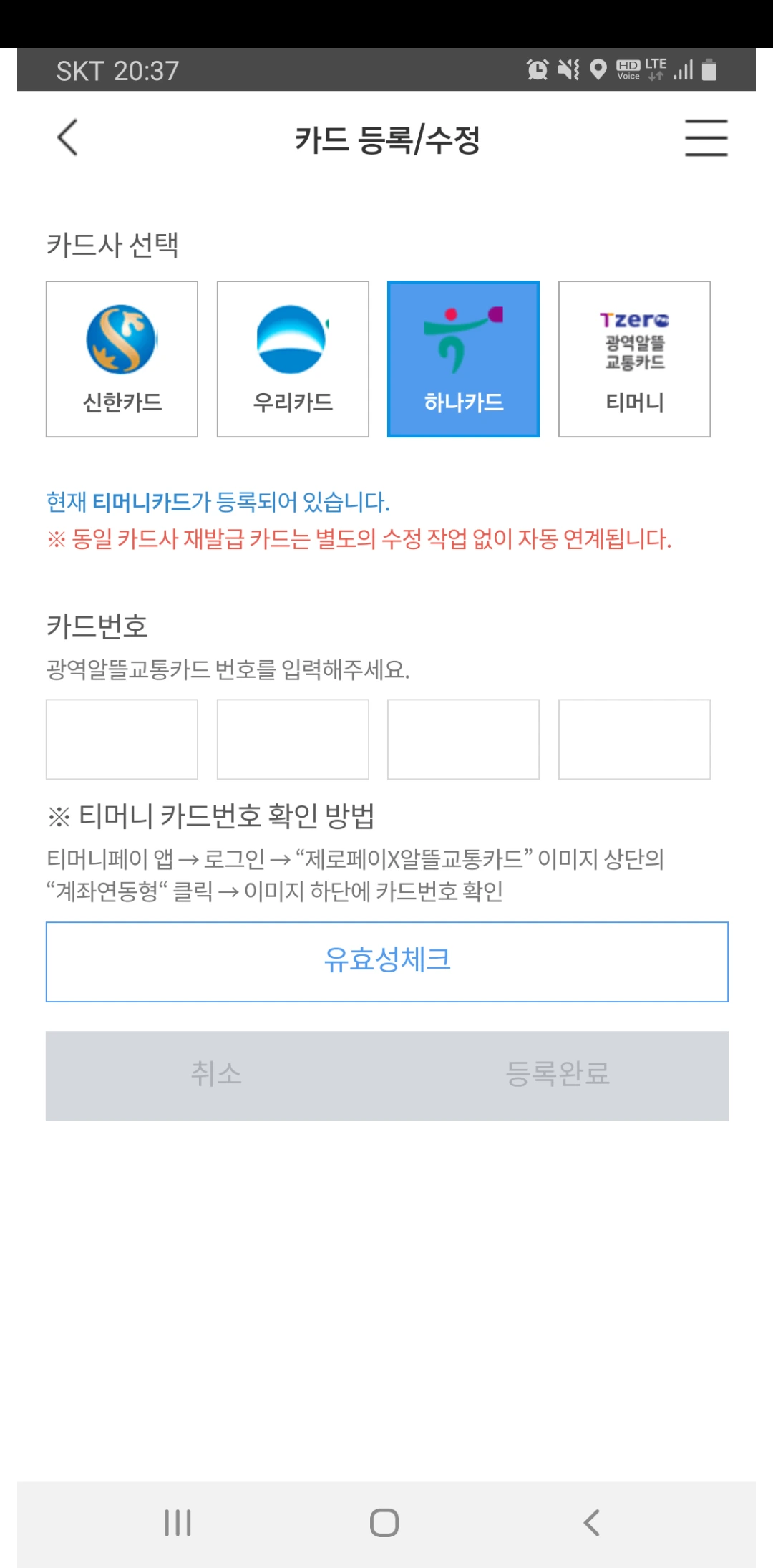 처음에는 몰랐는데, 광역알뜰교통앱 등록 중 유효성 체크에서 확인이 되었습니다.