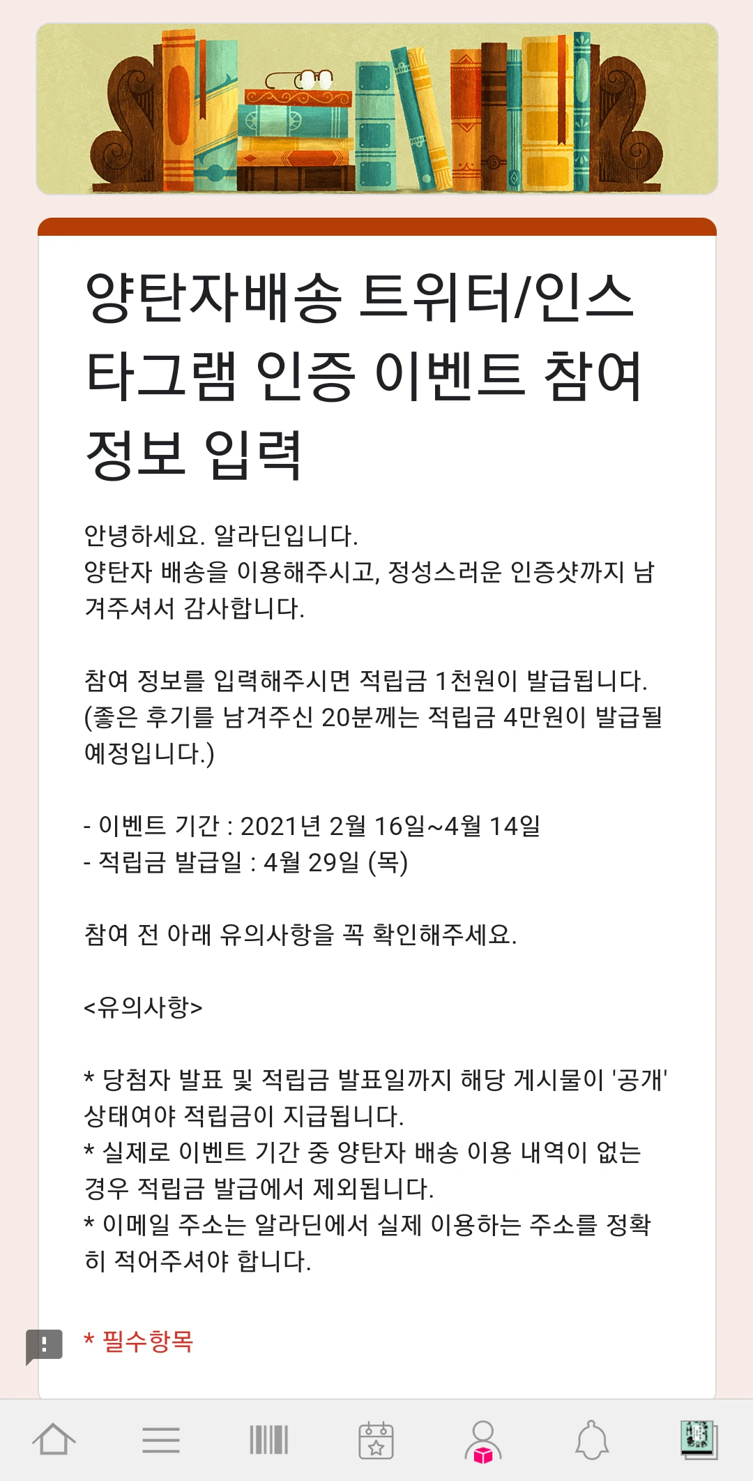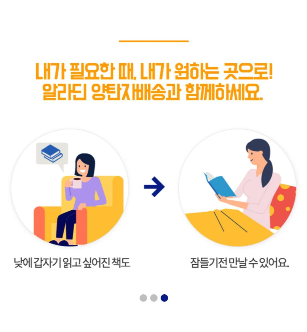 하지만, 알라딘은 책도 많고 항시 5만 원 이상 구매하기에, 그리고 앱에 들어가 보니 양탄자배송 만족도 설문조사도 바로 합니다. 베타 서비스라서 그런지 앞으로 몇 번 더 써볼 생각입니다.
