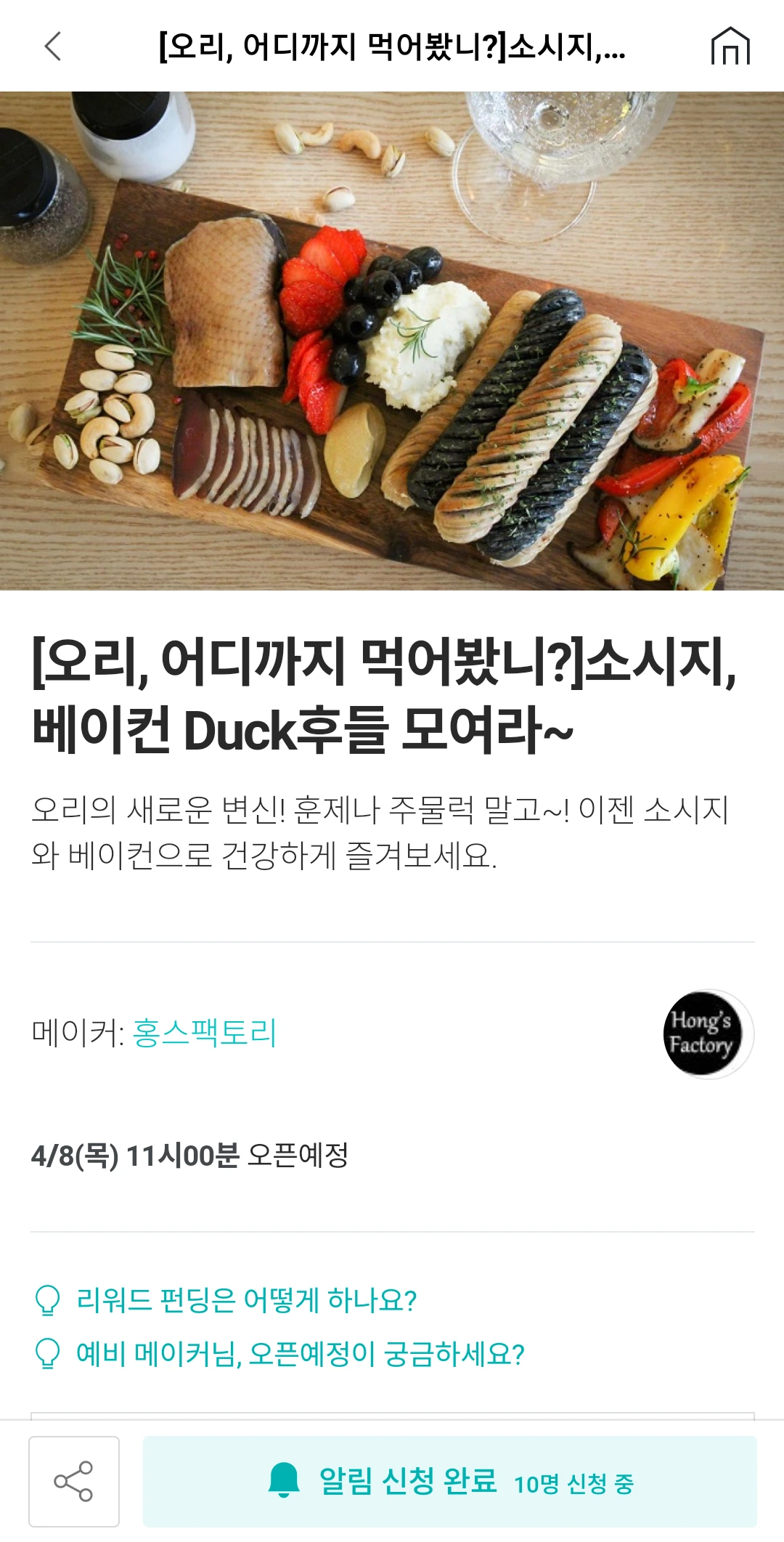 오리 소시지 기대가 됩니다. 풀세트로 펀딩 할 예정입니다. 펀딩 아이템 하나 더 추가 예정입니다.