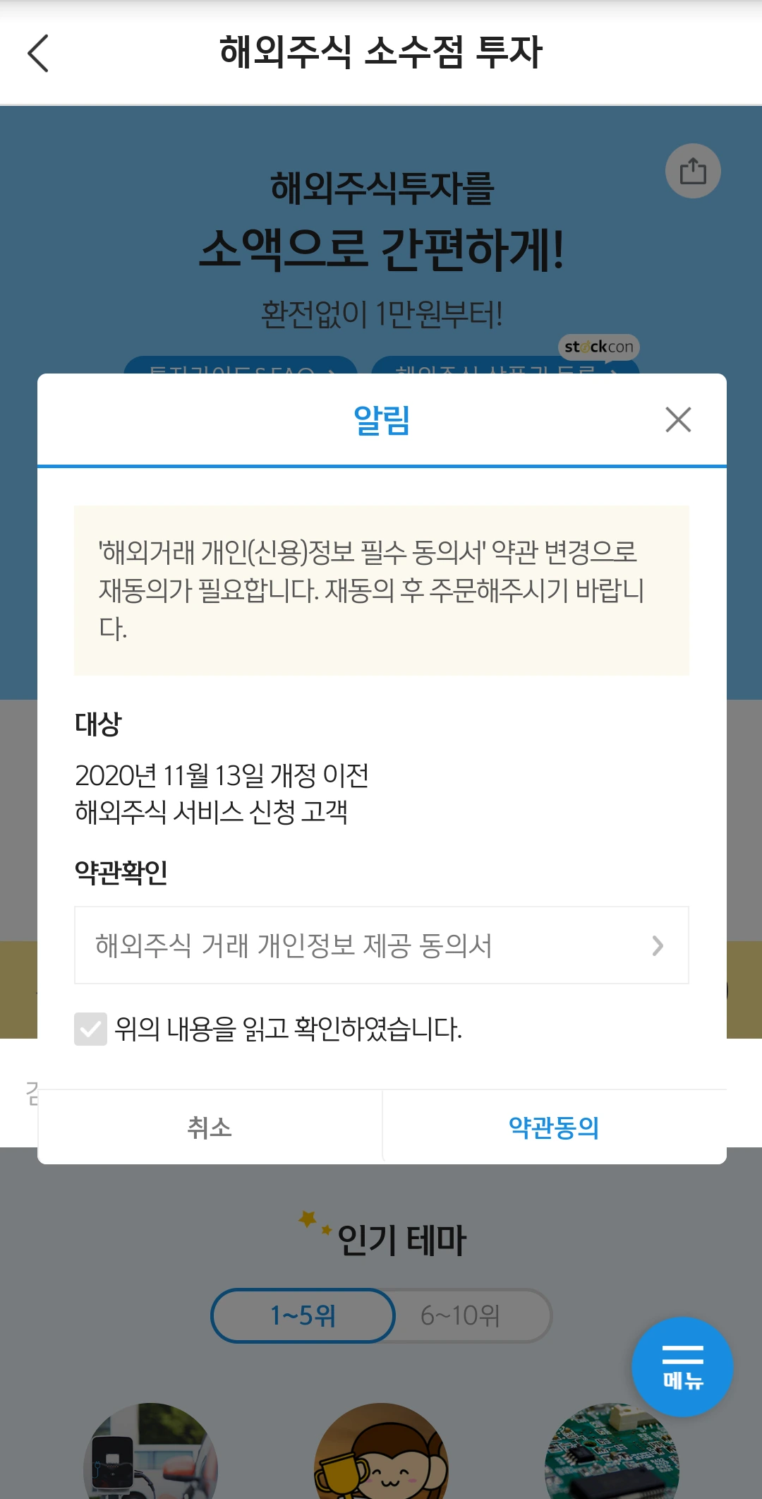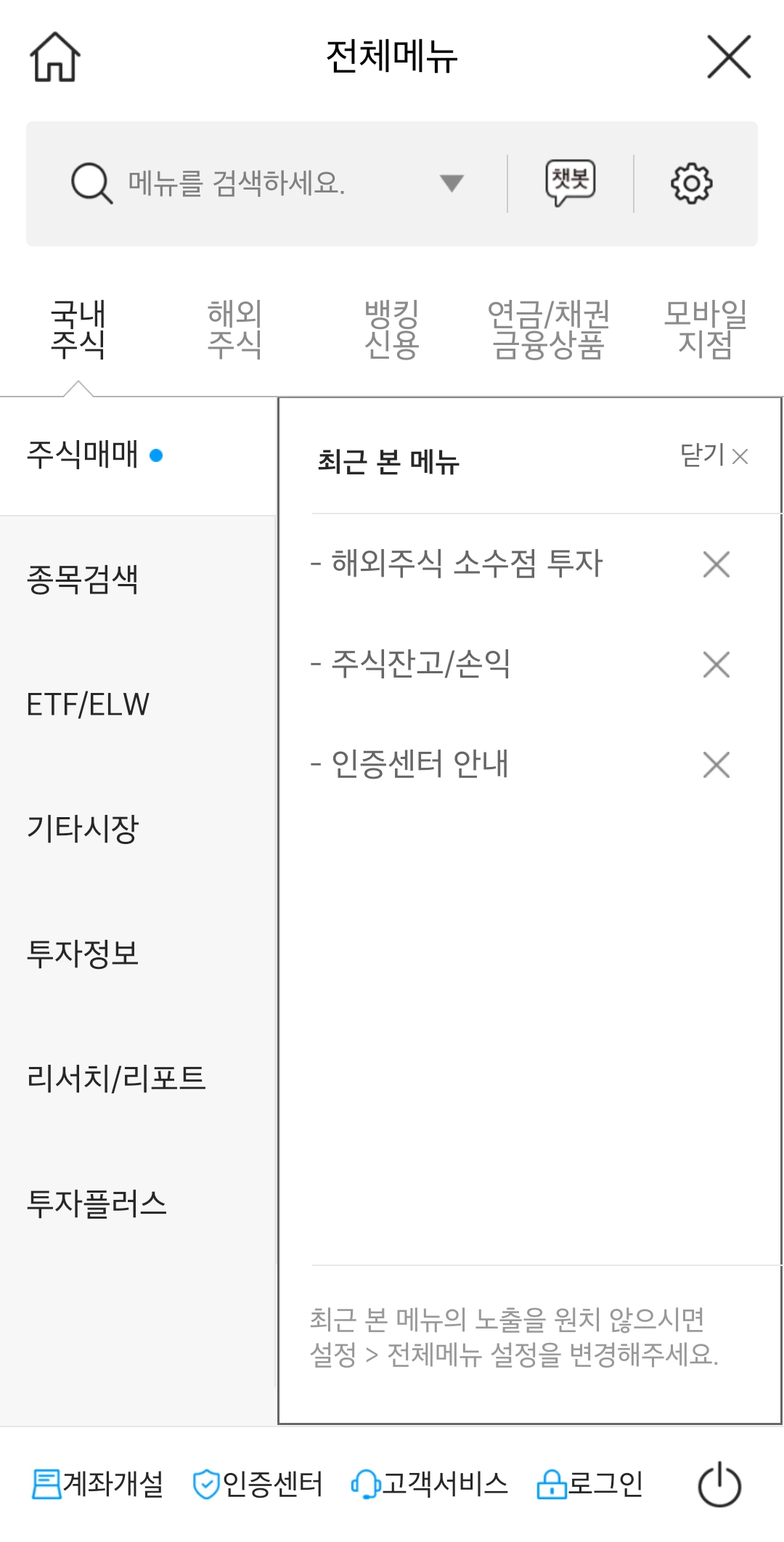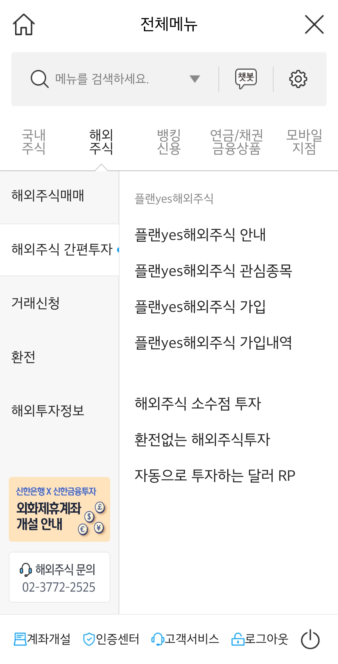 전체 메뉴의 해외주식 간편 투자, 최근 본 메뉴에 해외주식 소수점 투자입니다.