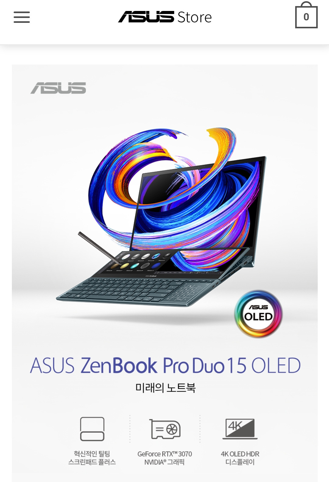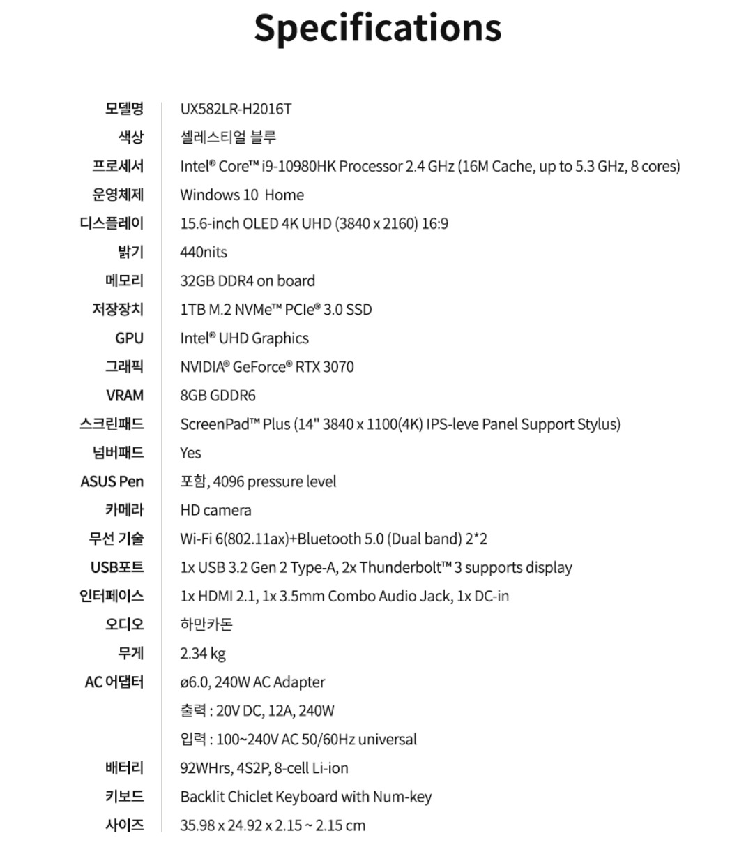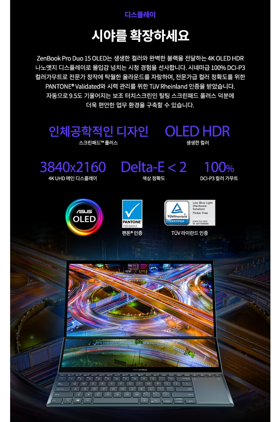 ZenBook PRO DUO - UX582<span>UX582LR-H2016T</span> | kr.store.asus.com 색상 셀레스티얼 블루 디스플레이 4K UHD 3840×2160// OLED CPU Intel Core i9-10980HK 메모리 32GB DDR4 on board 그래픽 NVIDIA GeForce RTX 3070 운영체제 Windows 10 Home…
