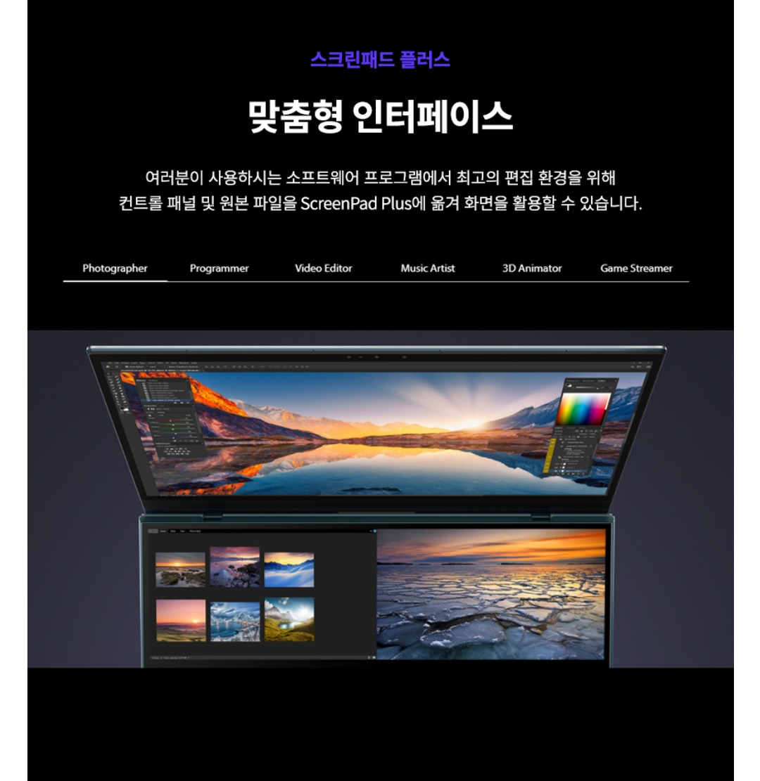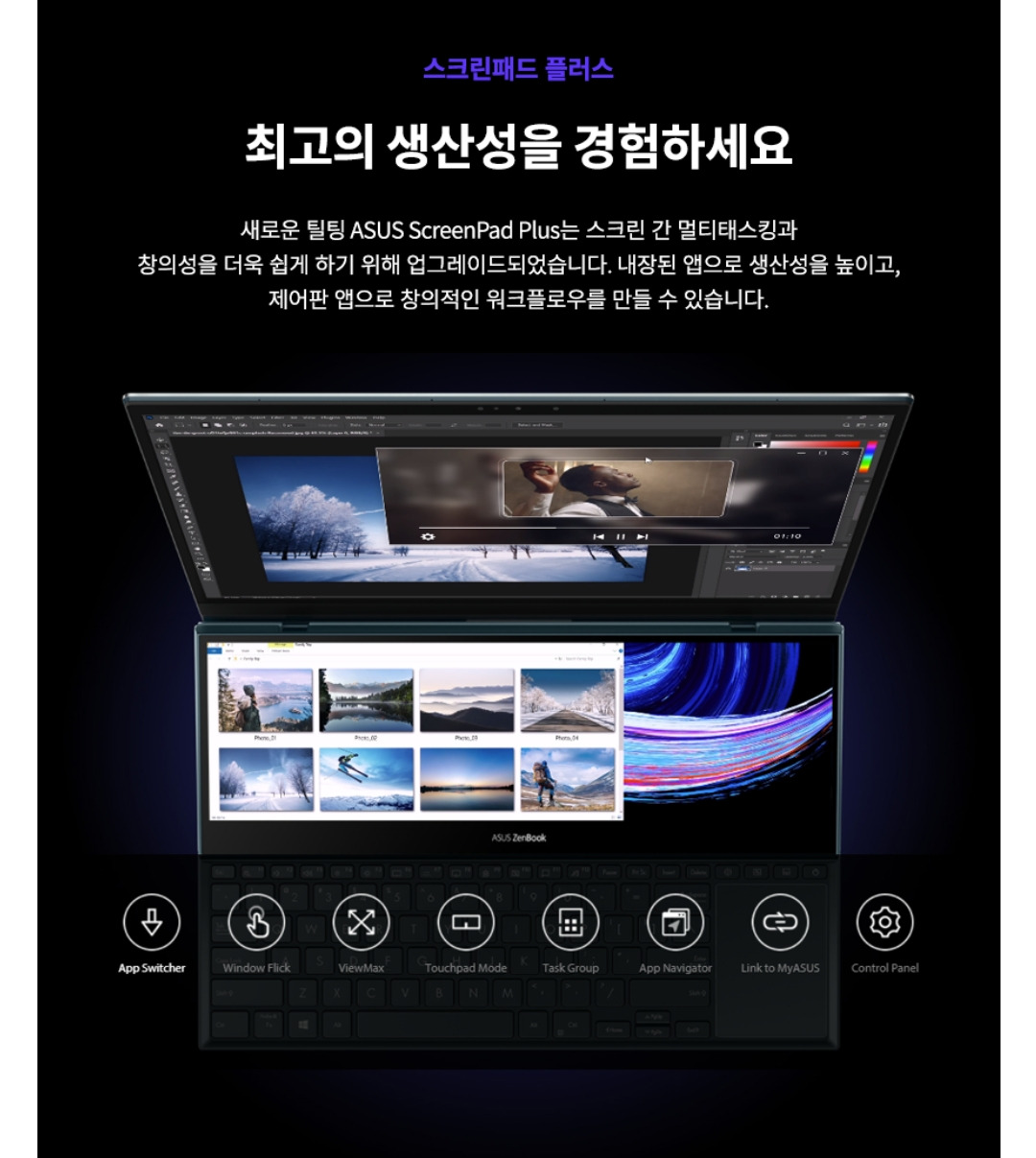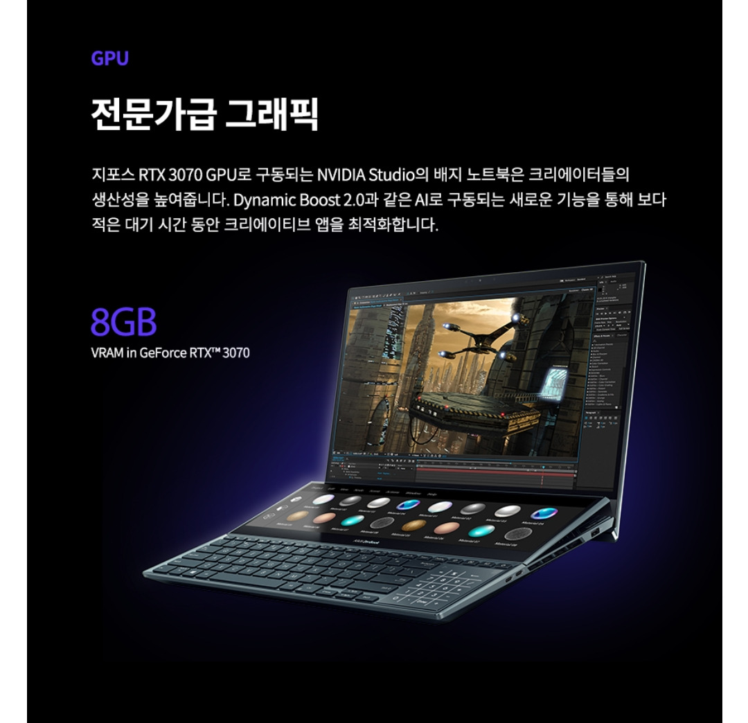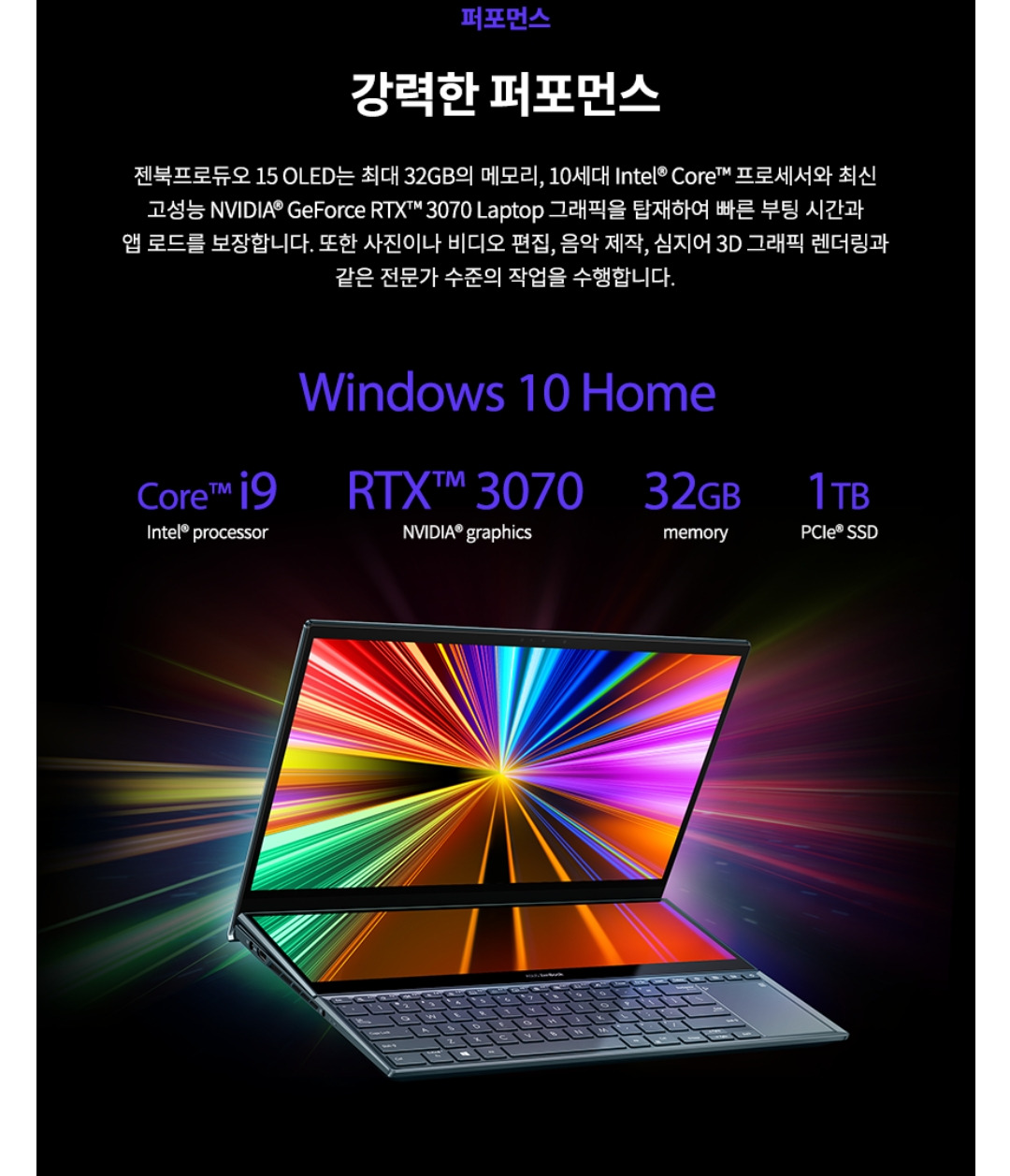 ZenBook PRO DUO - UX582<span>UX582LR-H2016T</span> | kr.store.asus.com 색상 셀레스티얼 블루 디스플레이 4K UHD 3840×2160// OLED CPU Intel Core i9-10980HK 메모리 32GB DDR4 on board 그래픽 NVIDIA GeForce RTX 3070 운영체제 Windows 10 Home…