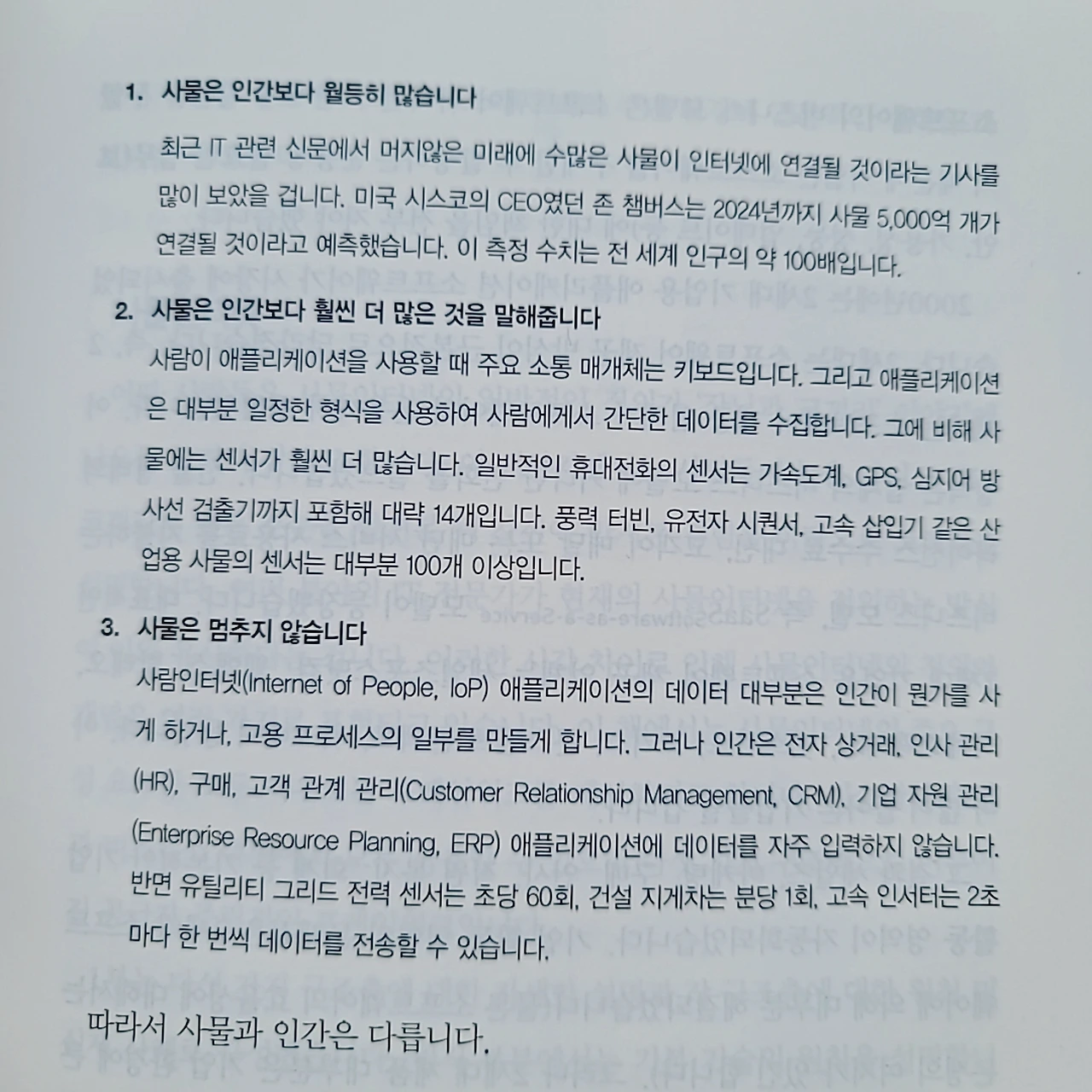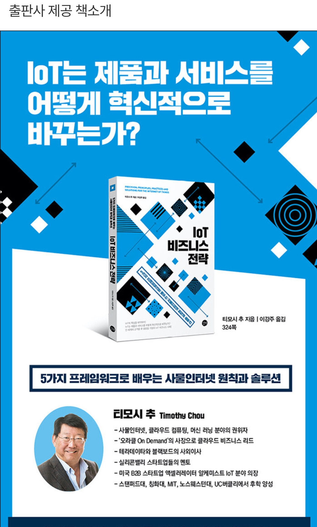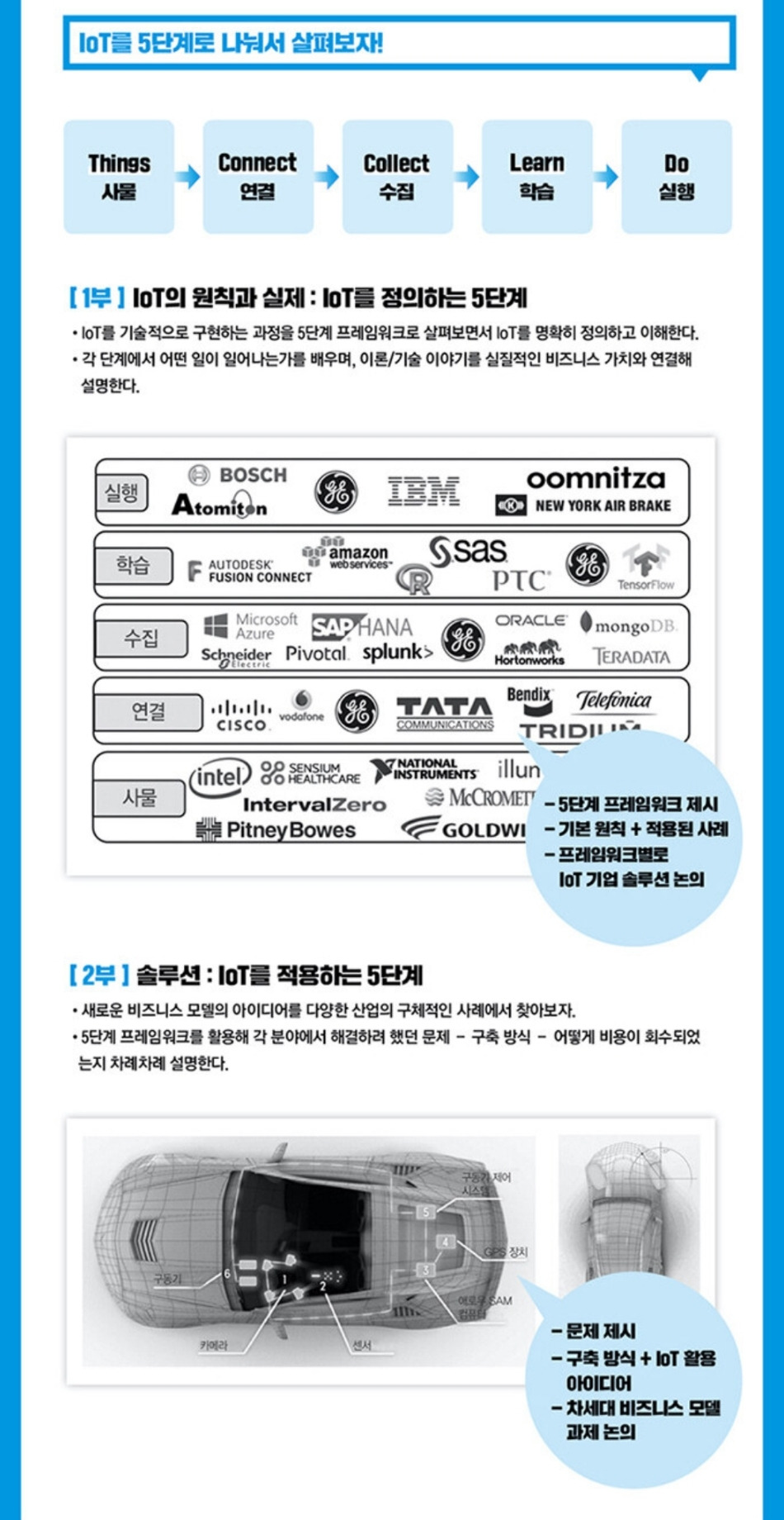 사물-연결-수집-학습-실행이라는 프래임워크로 사물인터넷을 풀어내니 어떤 부문이 필요하고 어떻게 수집되어 흘러가고 어떤 결과로 반영되는지를 그릴 수가 있게 됩니다. 기존에 개념에만 머물러 있던 사물인터넷과는 다르기도 합니다. 그래서 단계를 통해서 업무의 비즈니스의 전략도 도출이 가능해 보입니다. 관련분야가 아니거나 디바이스 등등 정밀한 수집정보들이 낯설어서 이해가 되지 않는 부문은 과감하게 스킵하고 관심 있는 영역 중심으로 읽는 것도 좋아 보입니다.