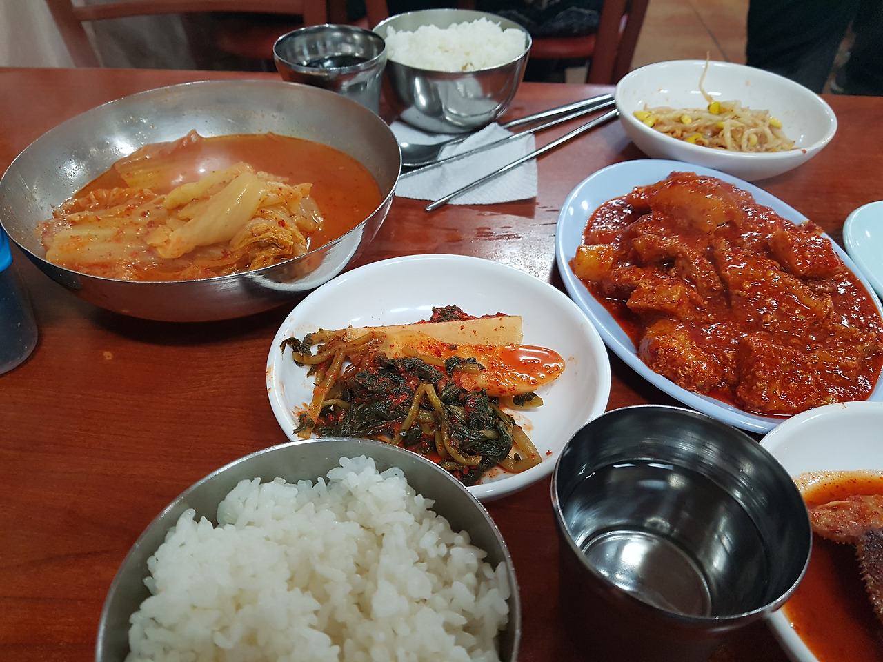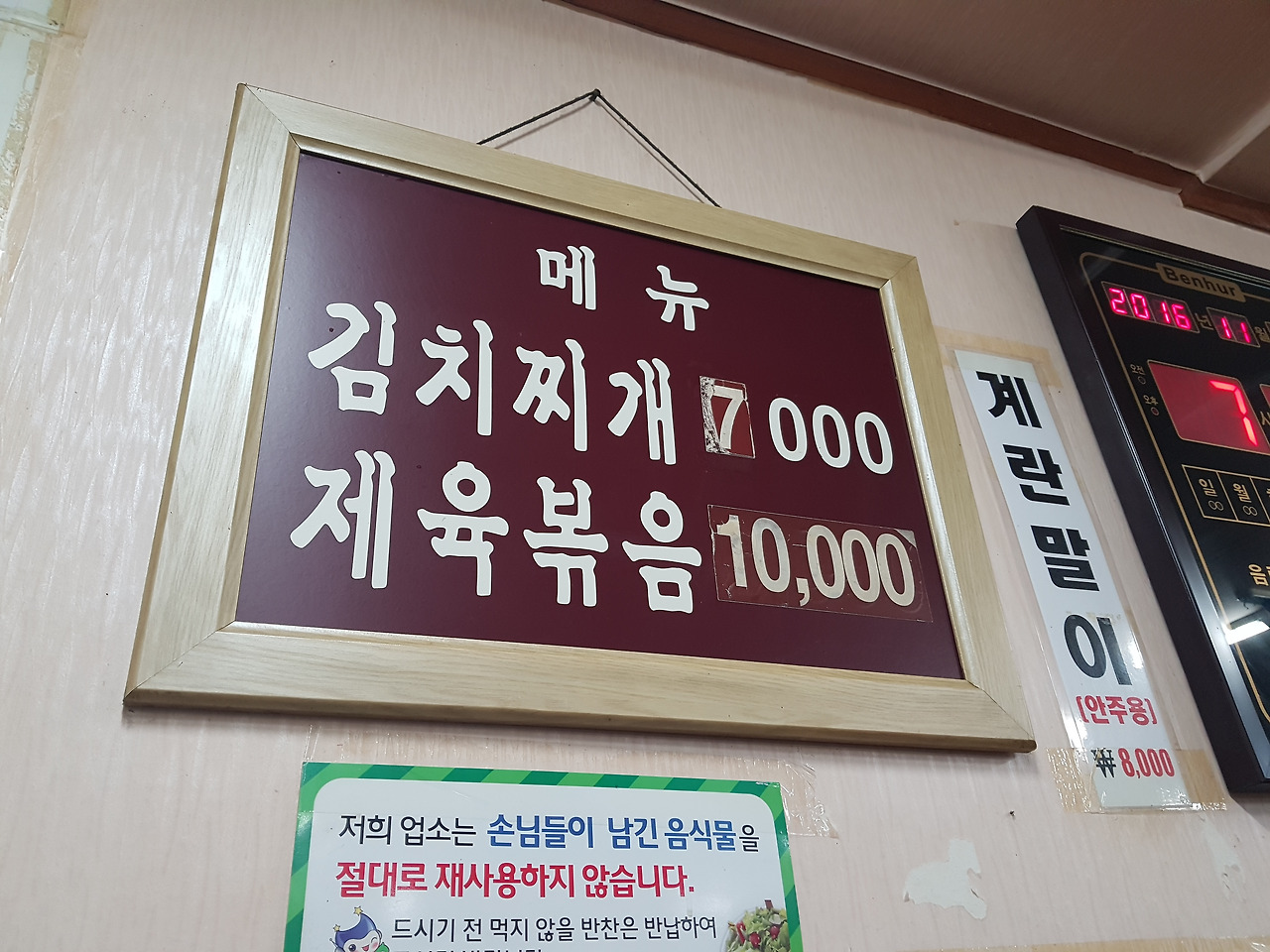 기본 메뉴이다. 김치찌개와 제육볶음 거기에 계란말이 사이드 메뉴가 있다.