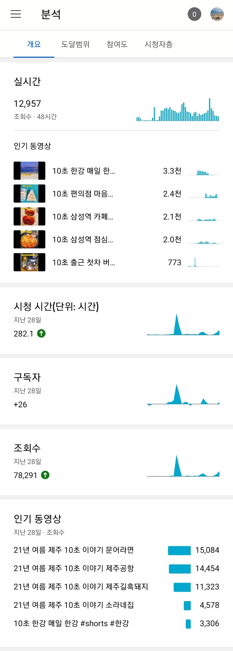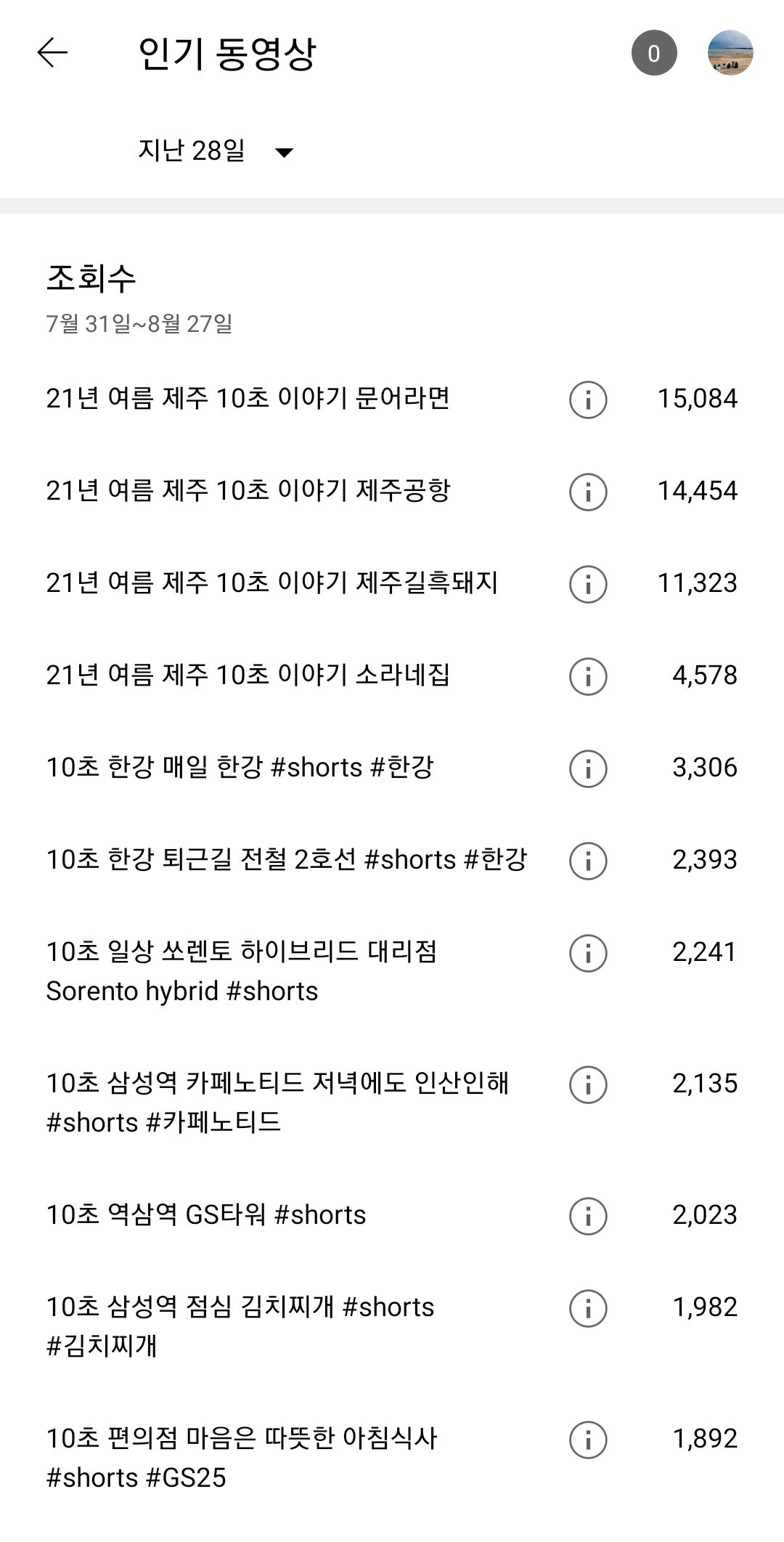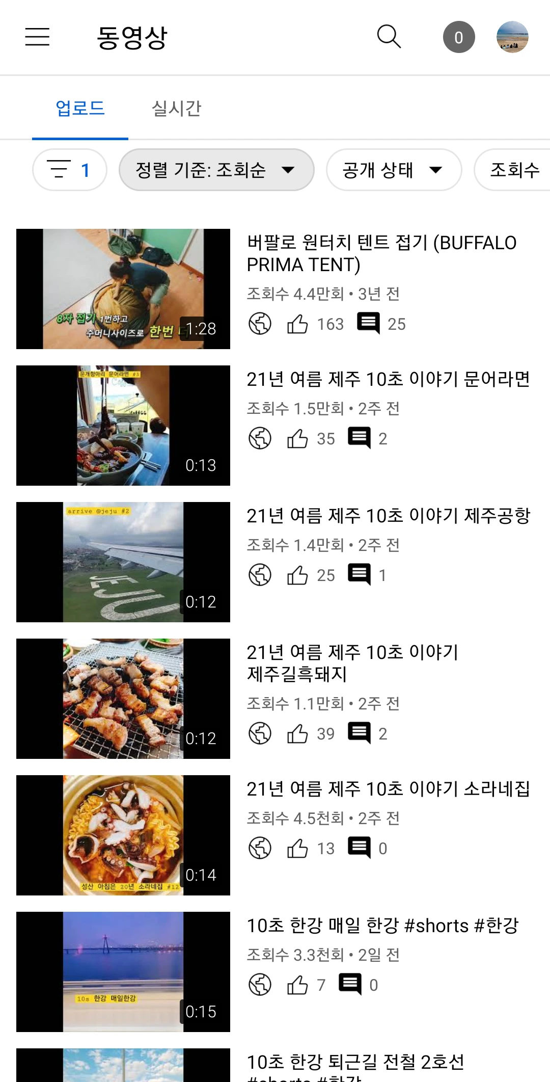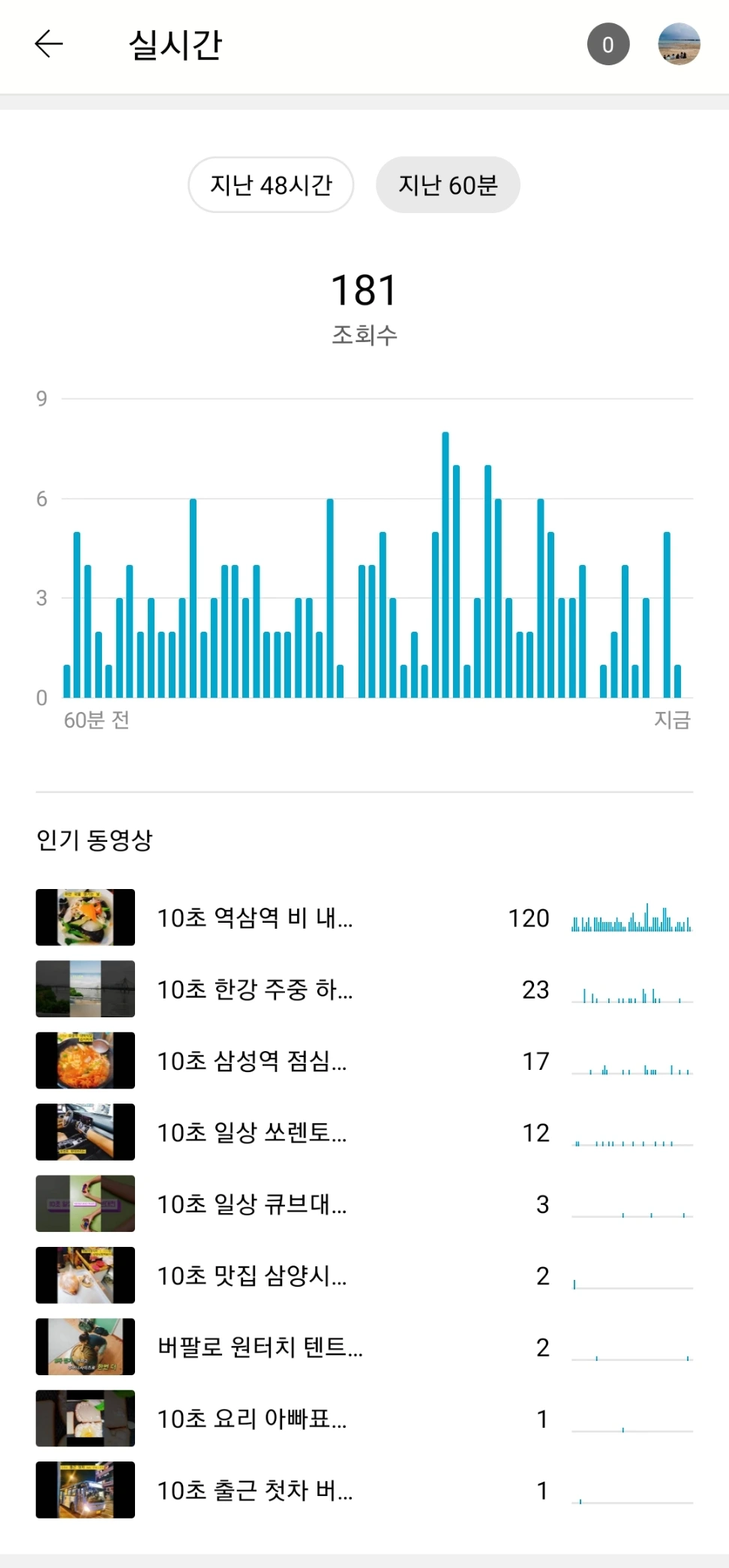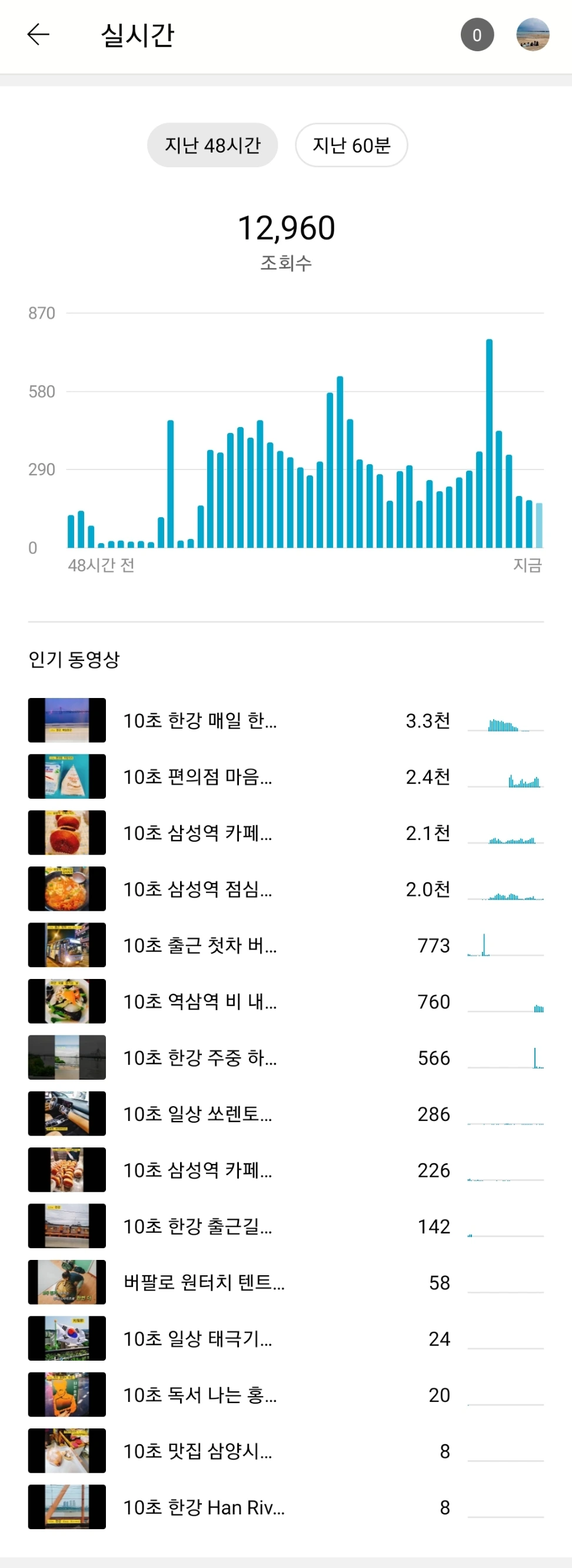 그러다 보면 어떤 콘텐츠가 조회수가 높은 지를 알 수 있을 겁니다. 출근길 한강 영상 조회수가 높기는 합니다.