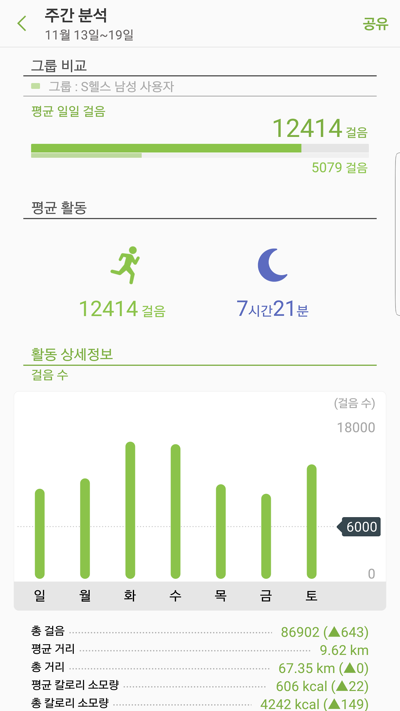 실제로 나의 기어핏2을 보면, 농구로 운동을 한 날은 13,000걸음이 찍혀있고, 외근으로 농구를 못하거나 주말에는 6,000걸음이라는 통계가 집계되어 있다.
