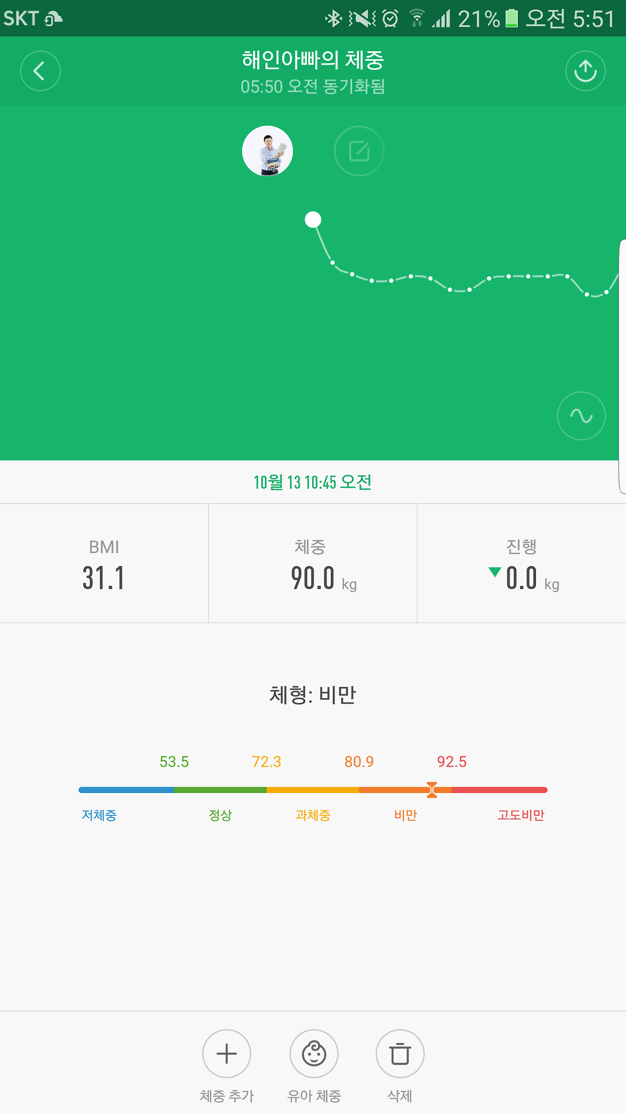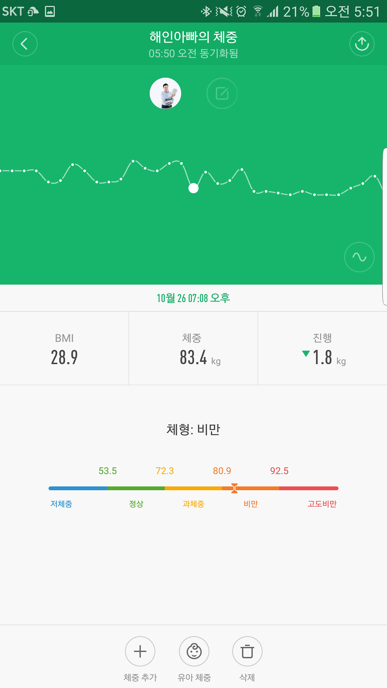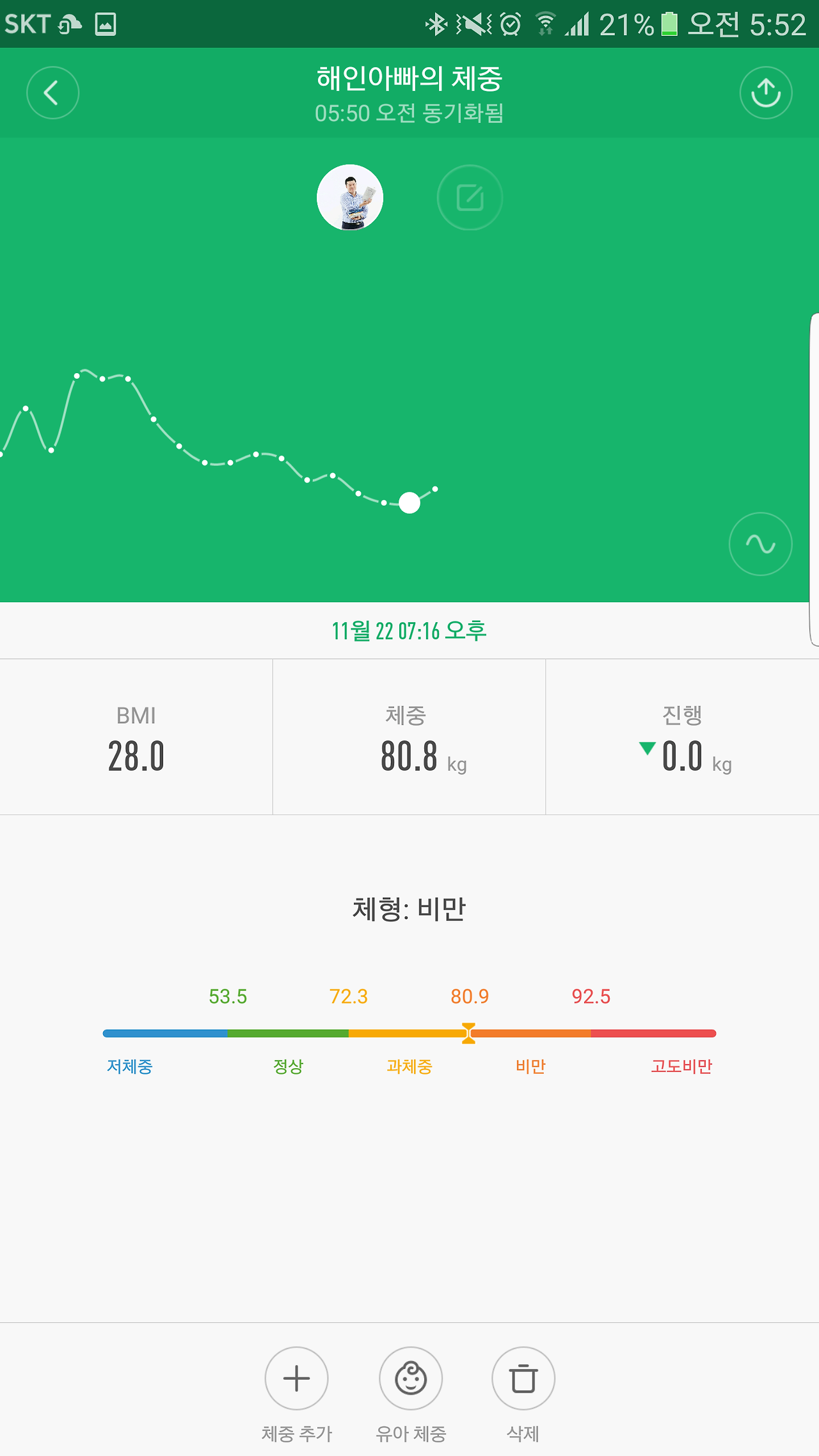 노트7의 저주(?)로 앱을 다시 깔아서 시작은 내가 임의로 기입하였다. 물론 최대한 적게 나오려고 퇴근하고 저녁먹기 전이나 새벽에 일어니서 몸무게를 확인하였다.
