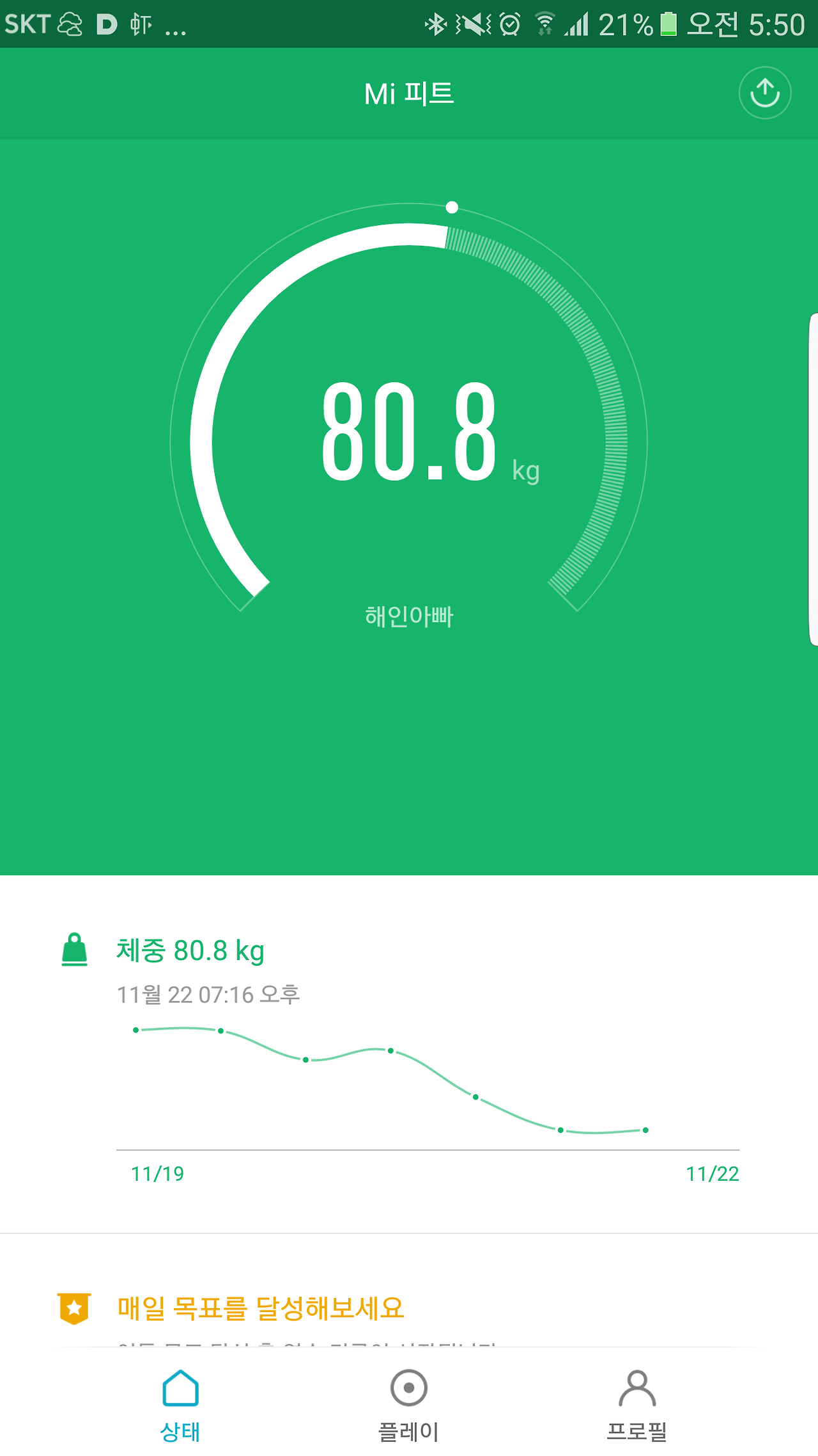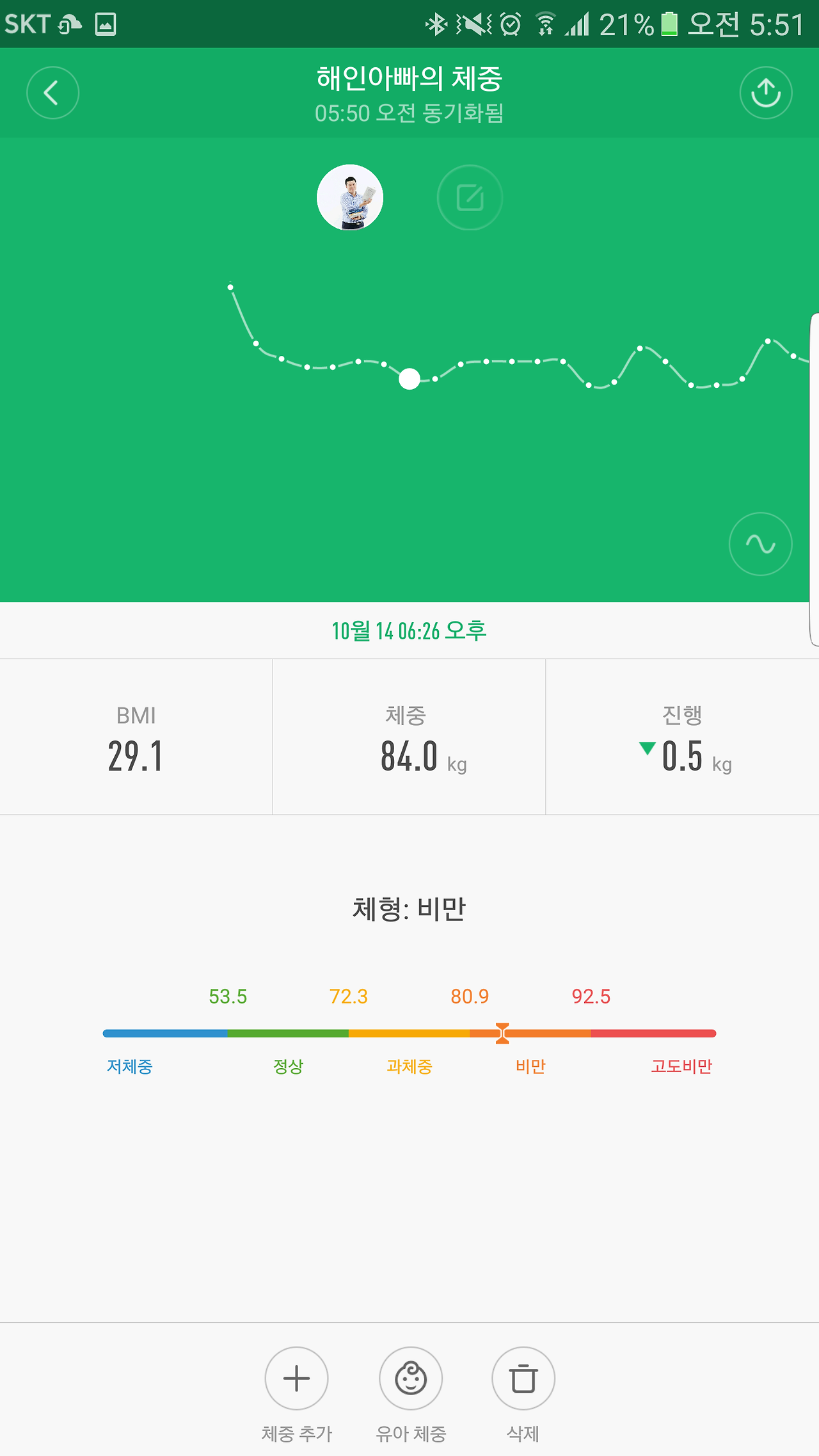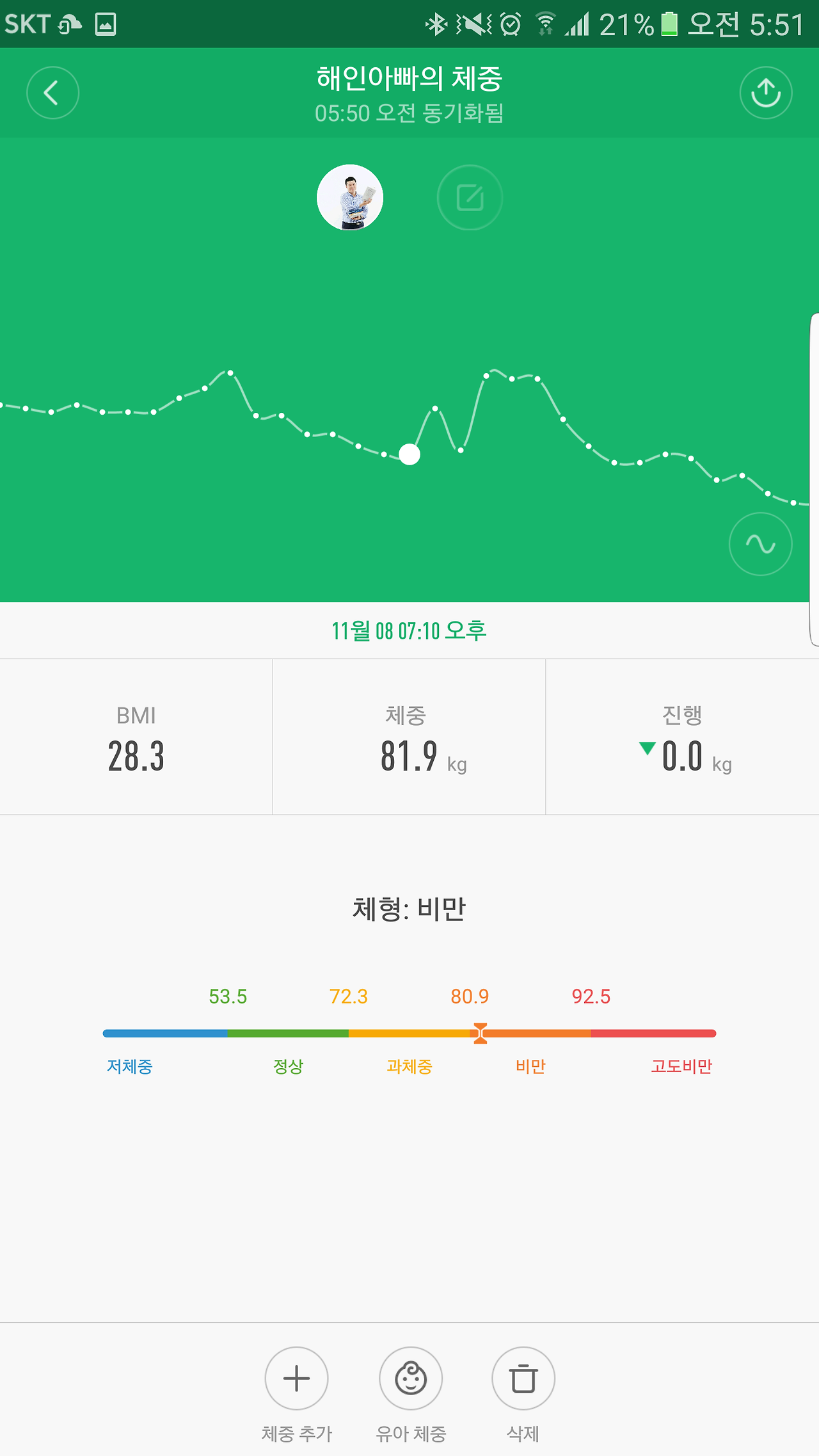 노트7의 저주(?)로 앱을 다시 깔아서 시작은 내가 임의로 기입하였다. 물론 최대한 적게 나오려고 퇴근하고 저녁먹기 전이나 새벽에 일어니서 몸무게를 확인하였다.