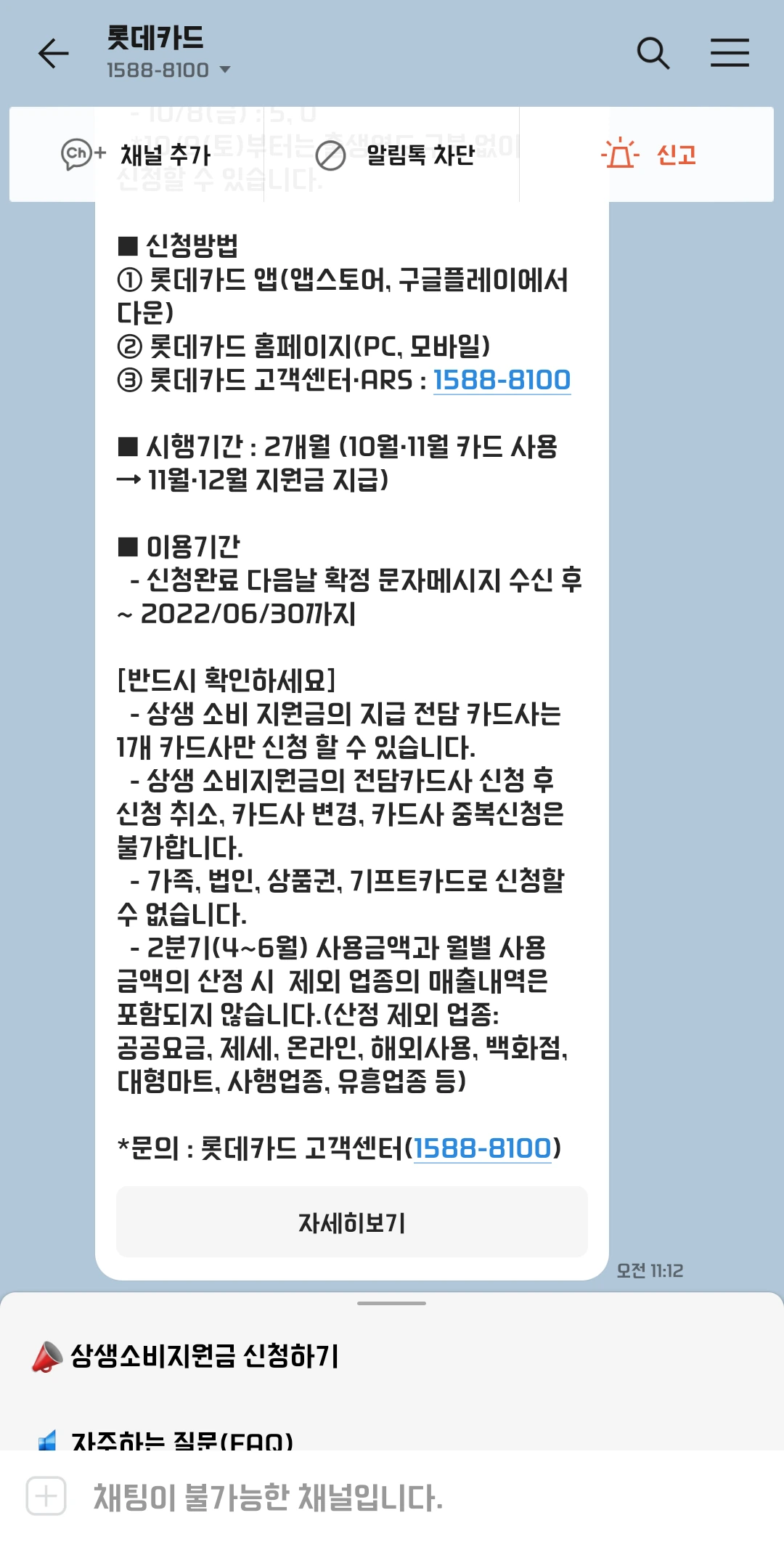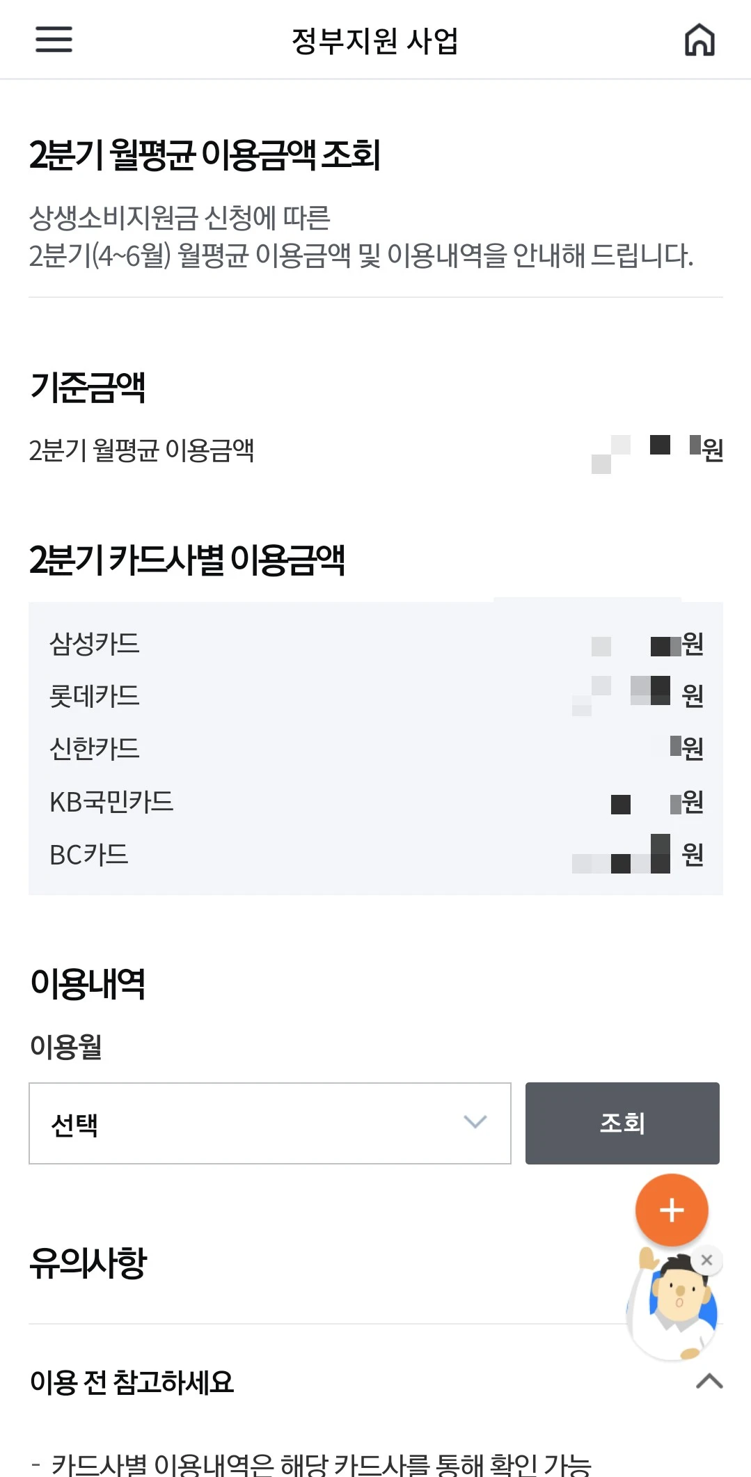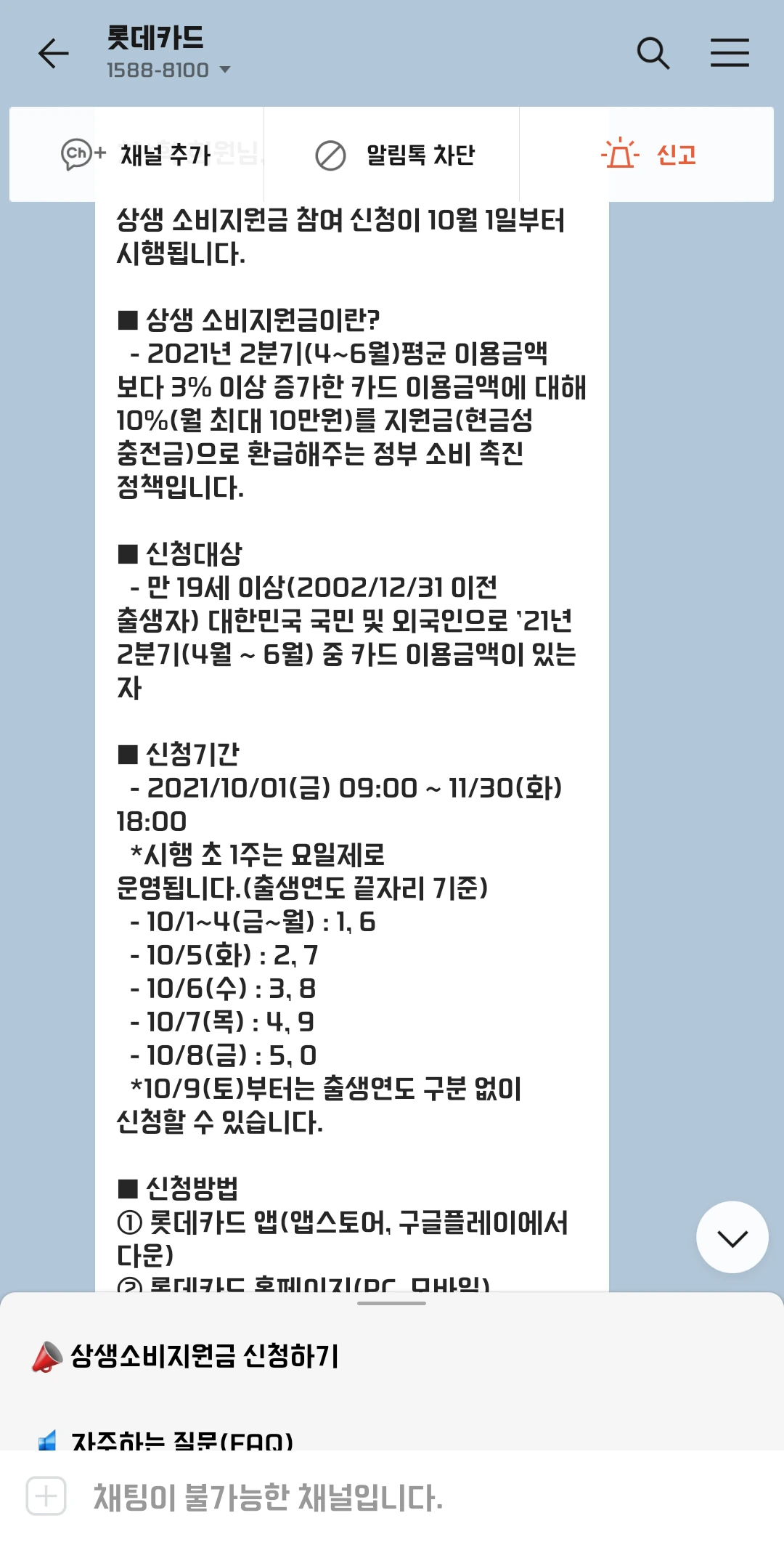 [반드시 확인하세요] - 상생 소비 지원금의 지급 전담 카드사는 1개 카드사만 신청할 수 있습니다. - 상생 소비 지원금의 전담 카드사 신청 후 신청 취소, 카드사 변경, 카드사 중복신청은 불가합니다. - 가족, 법인, 상품권, 기프트카드로 신청할 수 없습니다. - 2분기(4~6월) 사용금액과 월별 사용 금액의 산정 시 제외 업종의 매출내역은 포함되지 않습니다.(산정 제외 업종: 공공요금, 제세, 온라인, 해외사용, 백화점, 대형마트, 사행업종, 유흥업종 등)