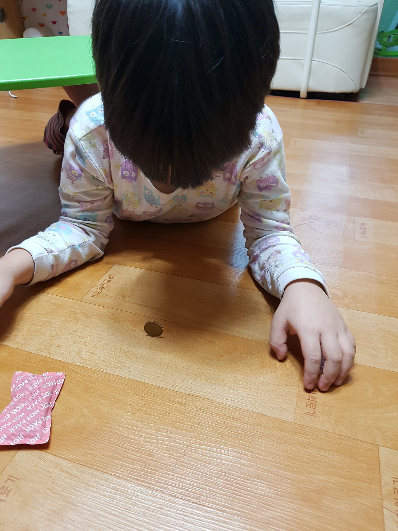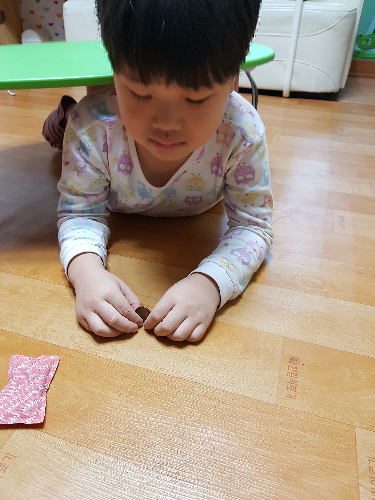 결국 둘째는 책상에서 시도하다가 자리를 바꿔서 초집중하게 된다. 6살 에너지가 차고 넘치는 사내아이들에게 양날의 검 같은 놀이였다. 흥분을 가라앉히고, 차분하게 초집중하면서 동전을 세우면 나름 성취감도 있을 것이다. 물론 동전을 세웠을때 이야기다.