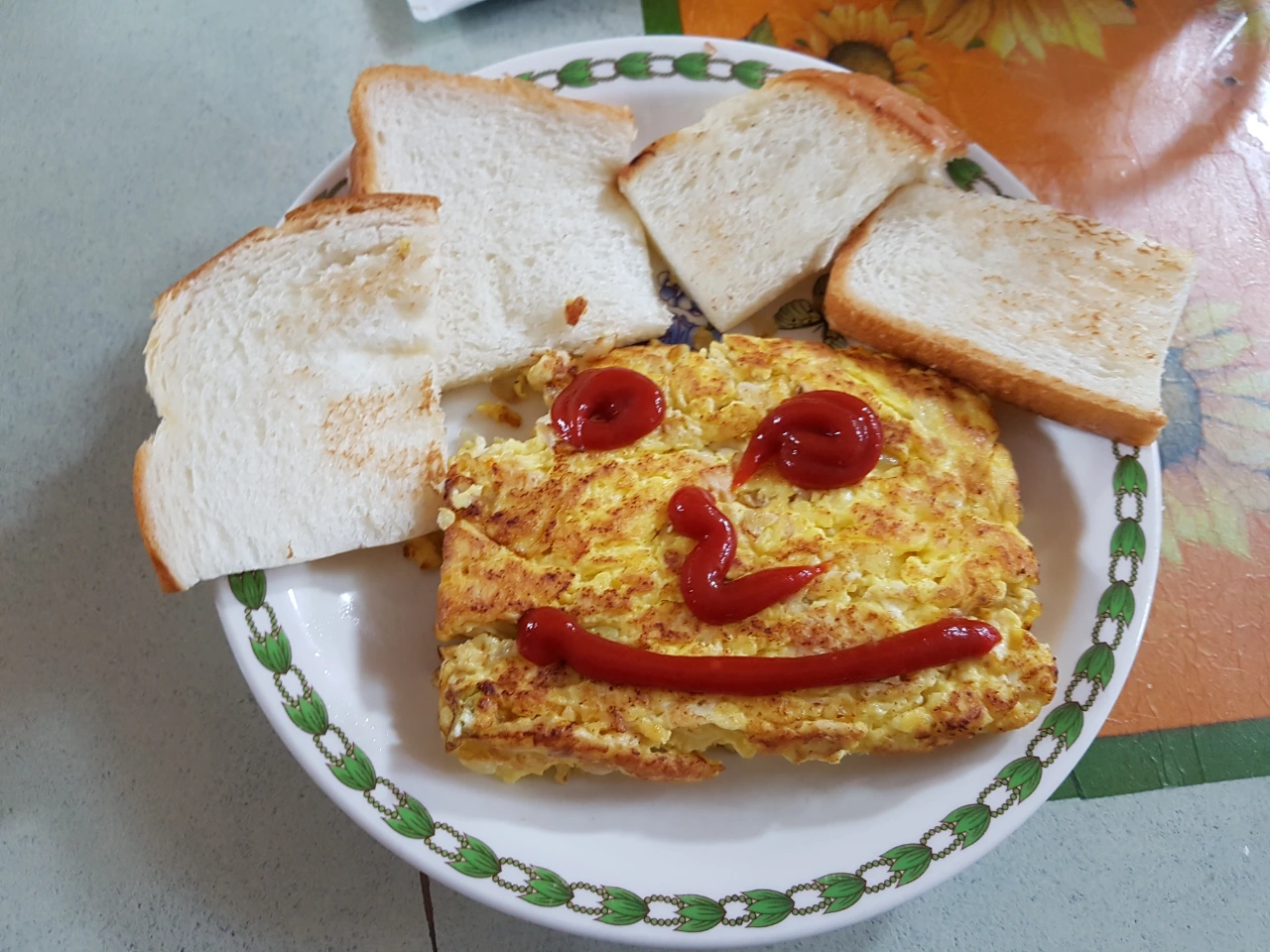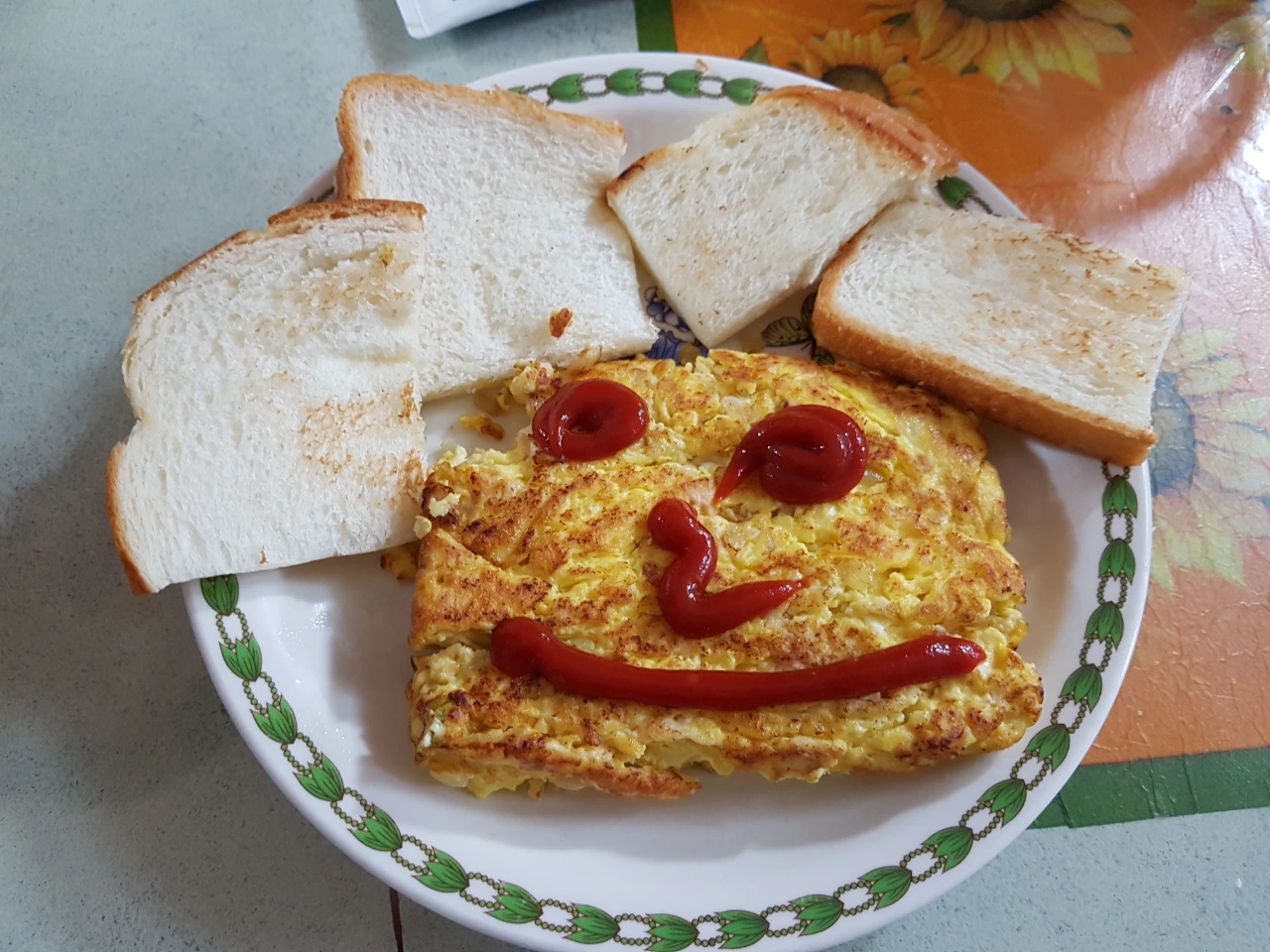 데코 : 아빠의 장점은 맛보다는 액션이나 의미 부여다. 역시 케찹이 짱이다. 유용한 펜인 것이다. 거의 초등학생 수준의 작품이 완성된다. 식빵은 머리 그리고 눈 코 입 고객들은 만족한다. 그럼 됐지 몰 더 바라겠냐?