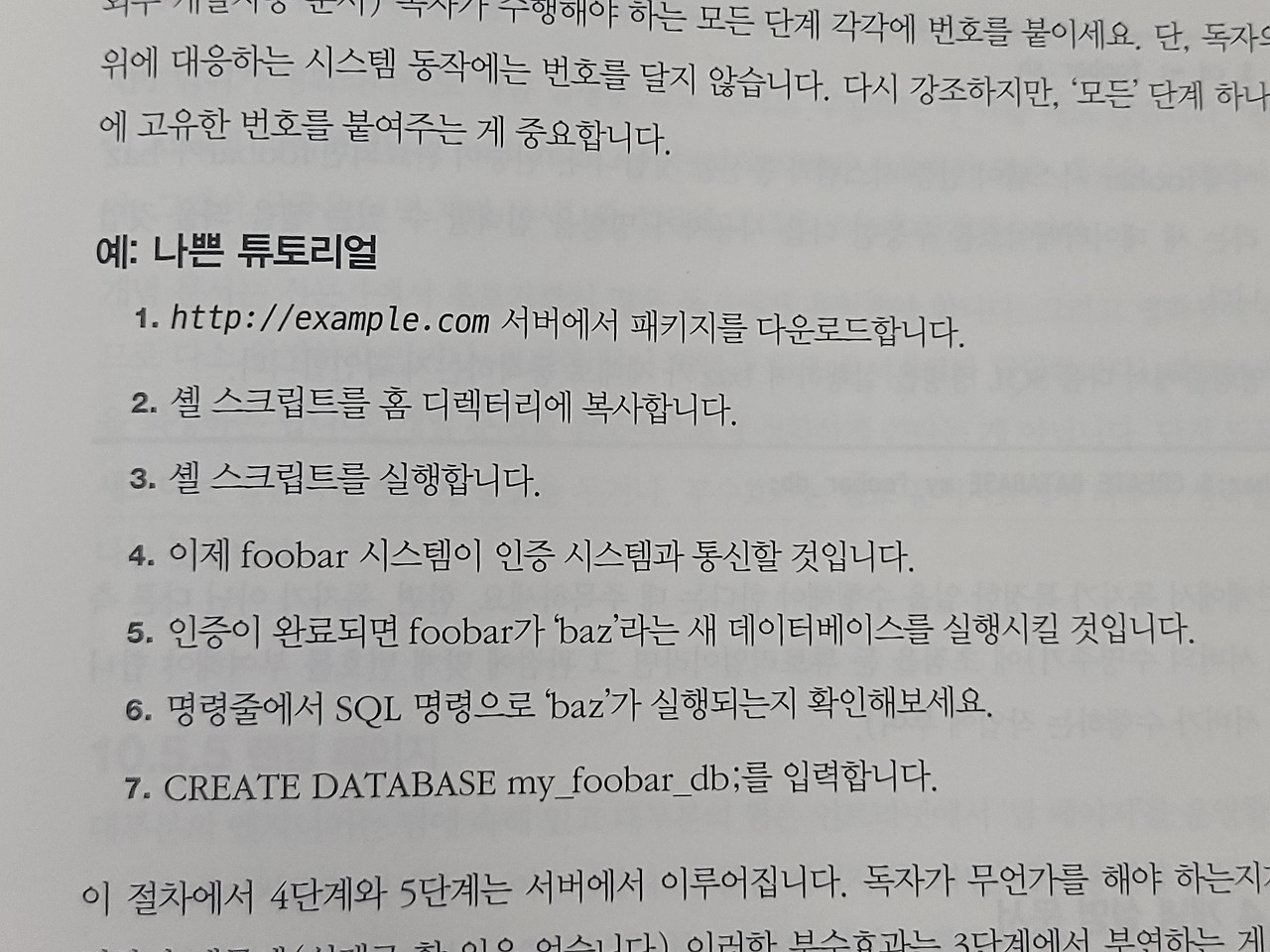'무엇'은 문 성 목적을 알려줍니다. '이 문서는 Frobber 서버를 테스트 환경에서 구동하기 위해 설계된 튜튜 리얼입니다'처럼 말이죠. 때로는 '무엇'을 작성하는 것만으로 문서를 적절하게 구성하는 데 도움이 됩니다. 예를 들어 '무엇'과 연관이 없는 정보가 적혀 있다면 해당 내용을 별도 옮기라는 신호입니다.