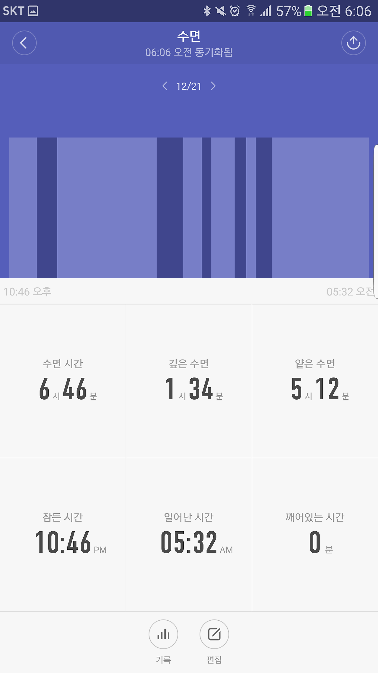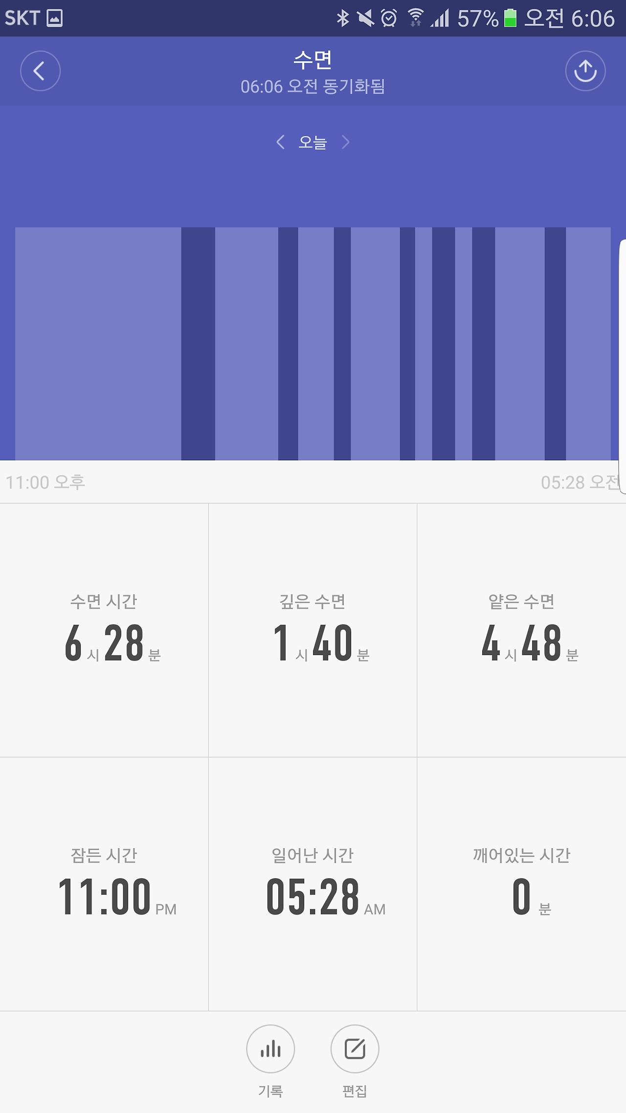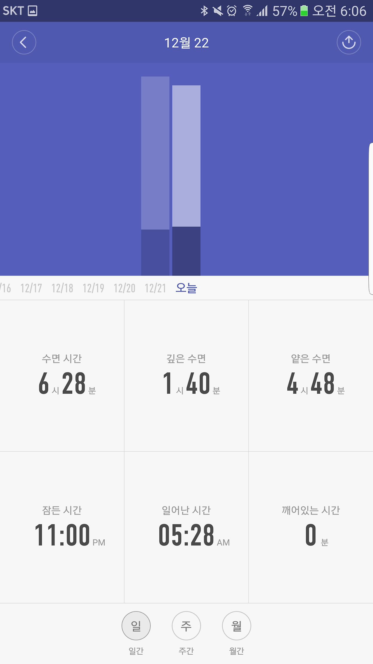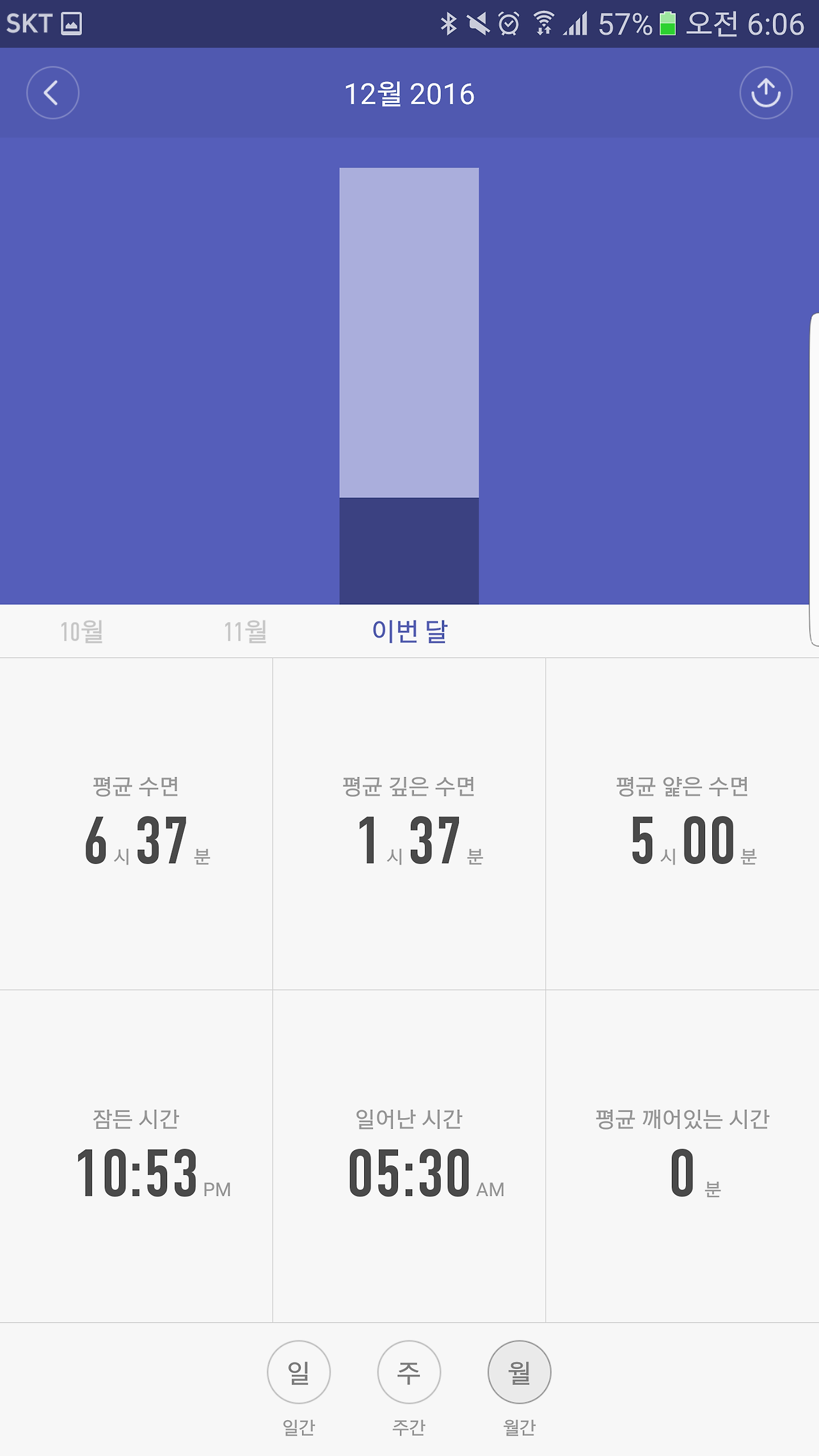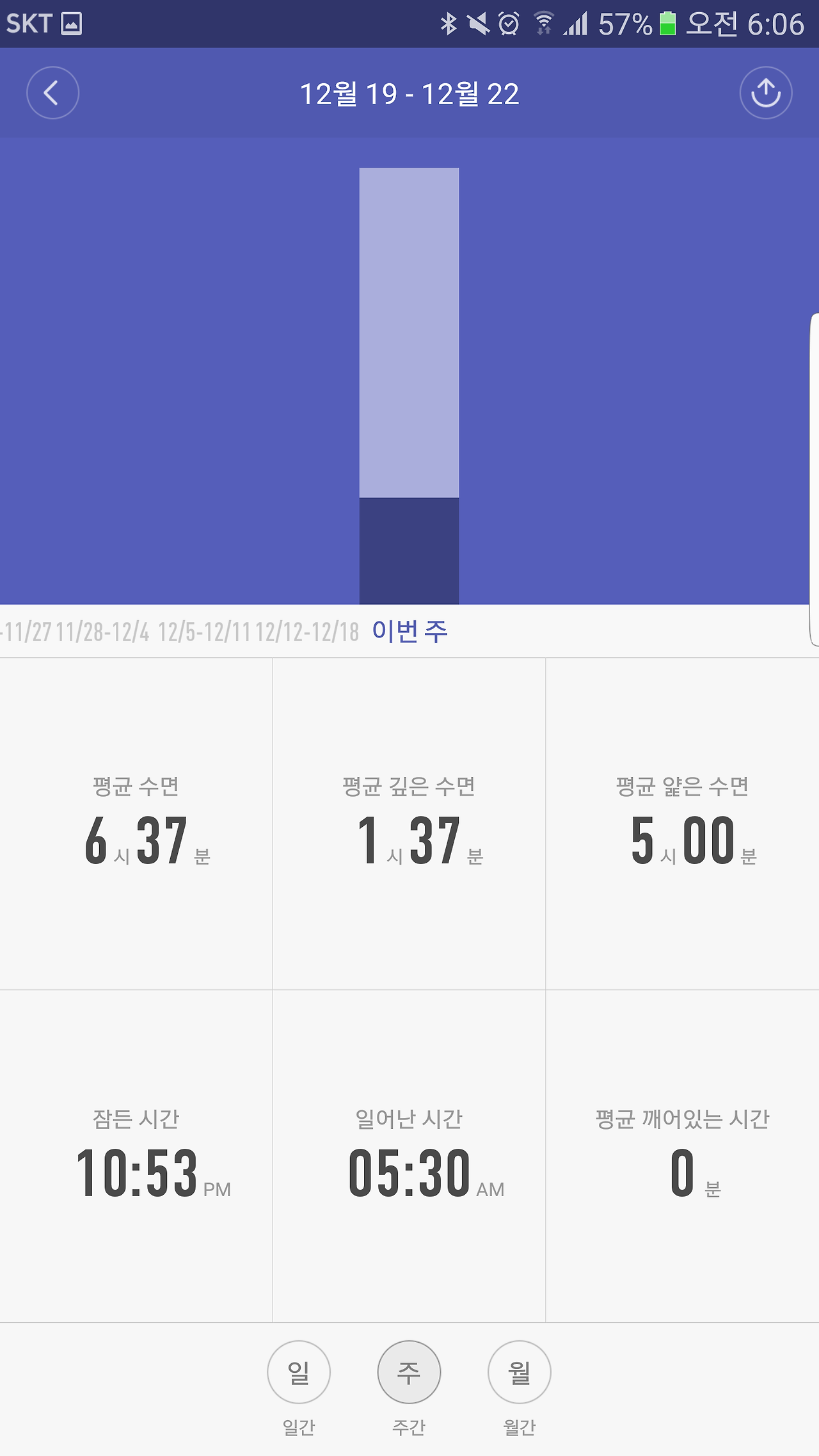 수면정보는 수면시간정보로 깊은수면과 얕은수면 잠든시간 일어난 시간으로 구분 된다. 잠든 시간은 기억이 나지 않아도 깨어난 시간은 얼추 맞다고 본다. 알람을 멈추려고 일어난 시간이기 때문이다. 역시 기록을 누르면 일/주/월 통계를 볼 수 있다. 아직 정보가 쌓이지 않아서 주간정보나 월간보고의 형태가 평균인지는 알 수가 없다.
