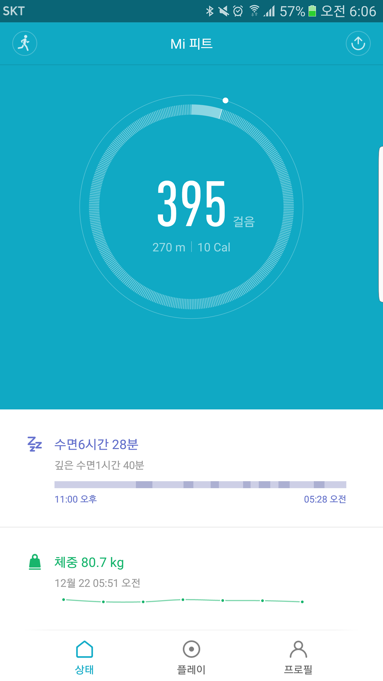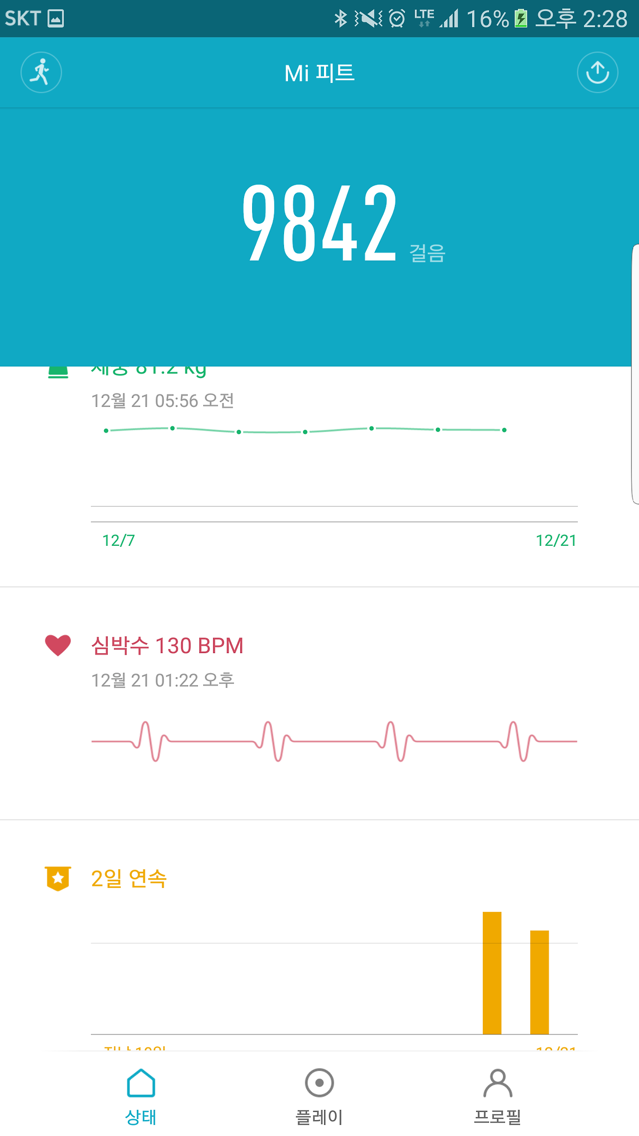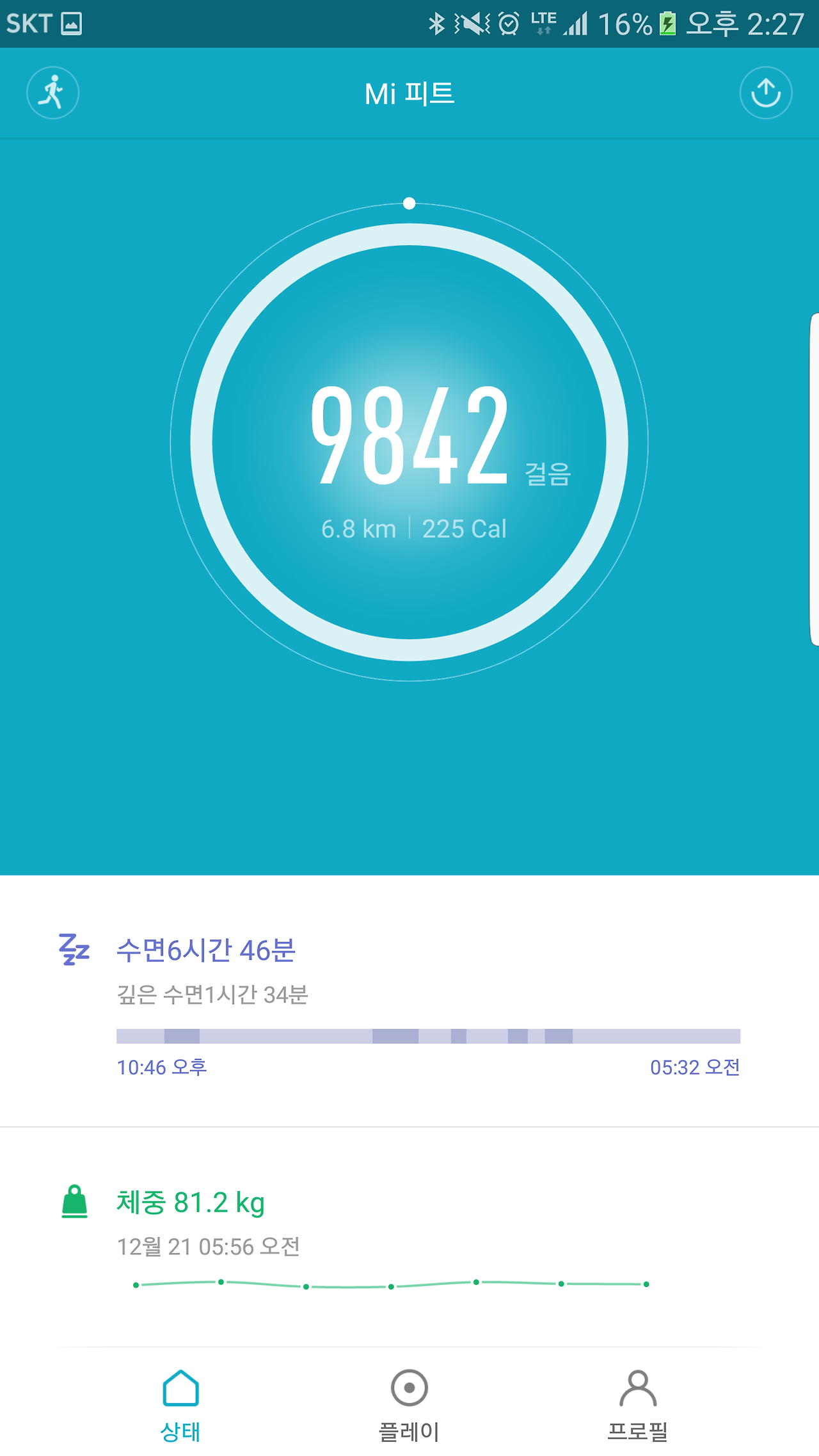 상태에서는 기본 정보가 제공된다. 미스케일을 쓸 때는 체중정보가 디폴트로 보였는데, 미밴드2 연동을 한 후로는 걸음정보가 기본으로 상단에 셋팅이 된다.