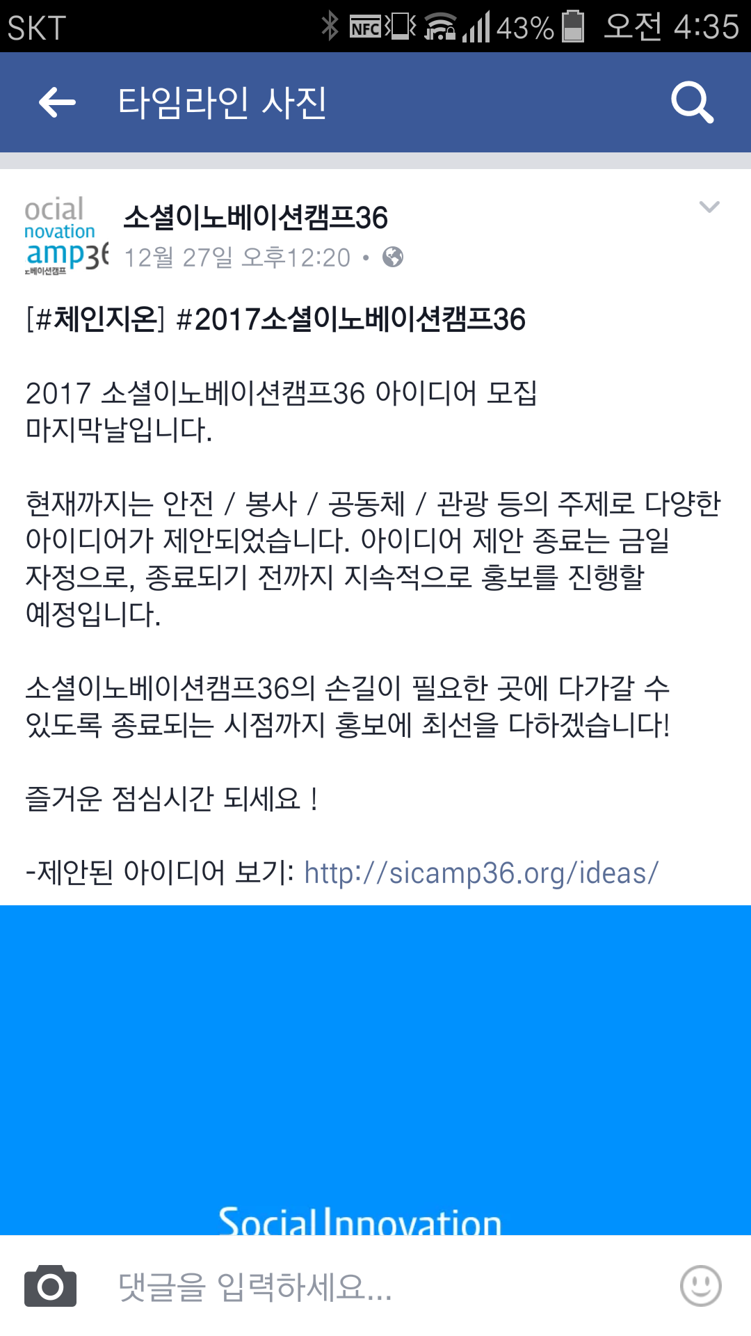 SNS를 통하여 접한 소셜이노베이션캠프36 아이디어 접수 정보이다. 27일 어제가 아이디어 마감이였는데 콸콸콸 쏟아지는 아이디어를 주체하지 못하고 쓸어 담아본다.