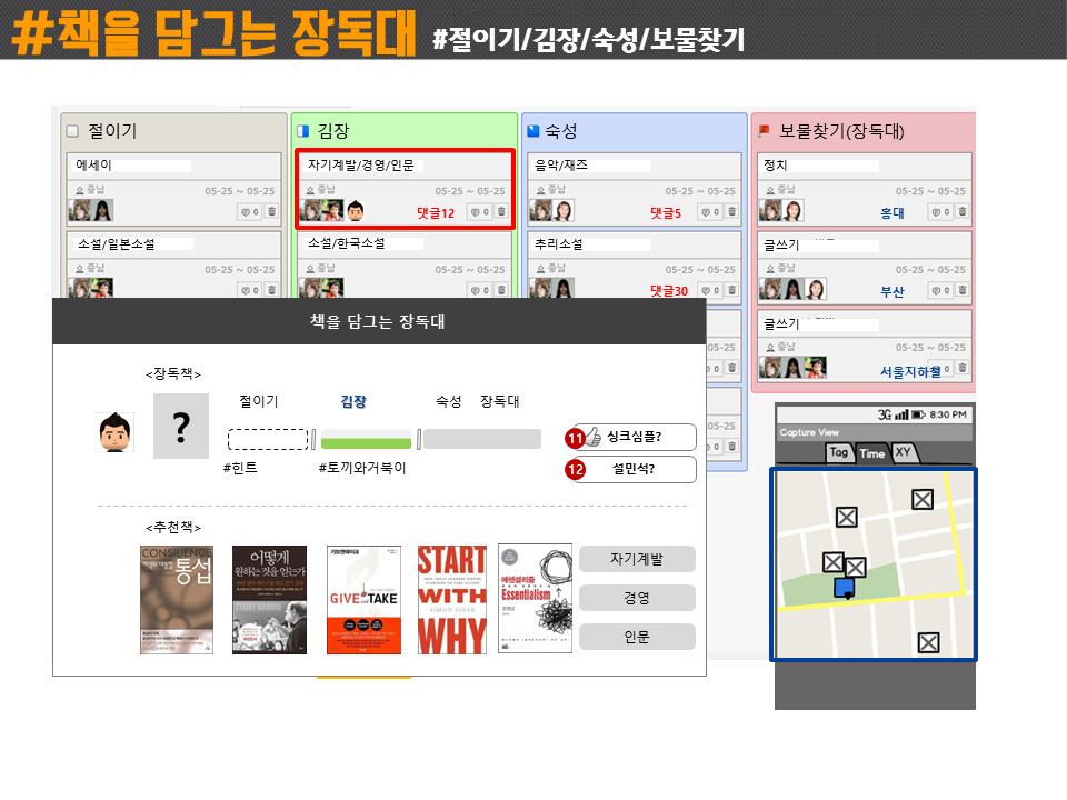 5권 책을 추천하면 나와 유사한 장르의 독서유형 사람이 절이기/김장/숙성 단계별로 리스트업된다. 그리고 특정 장독을 선택하면 해당 사람의 추천책과 책에 대하여 간단히 설명한 내용이 하단에 나온다. 상단에는 그 사람이 읽고 있는 책이 ?로 표시되며, 책에 대한 느낌이 키워드로 표시가 된다.그럼 내가 그 책을 댓글로 유추해 본다. 그리고 댓글다는 사람들끼리 질문하면서 책 제목를 찾아간다.