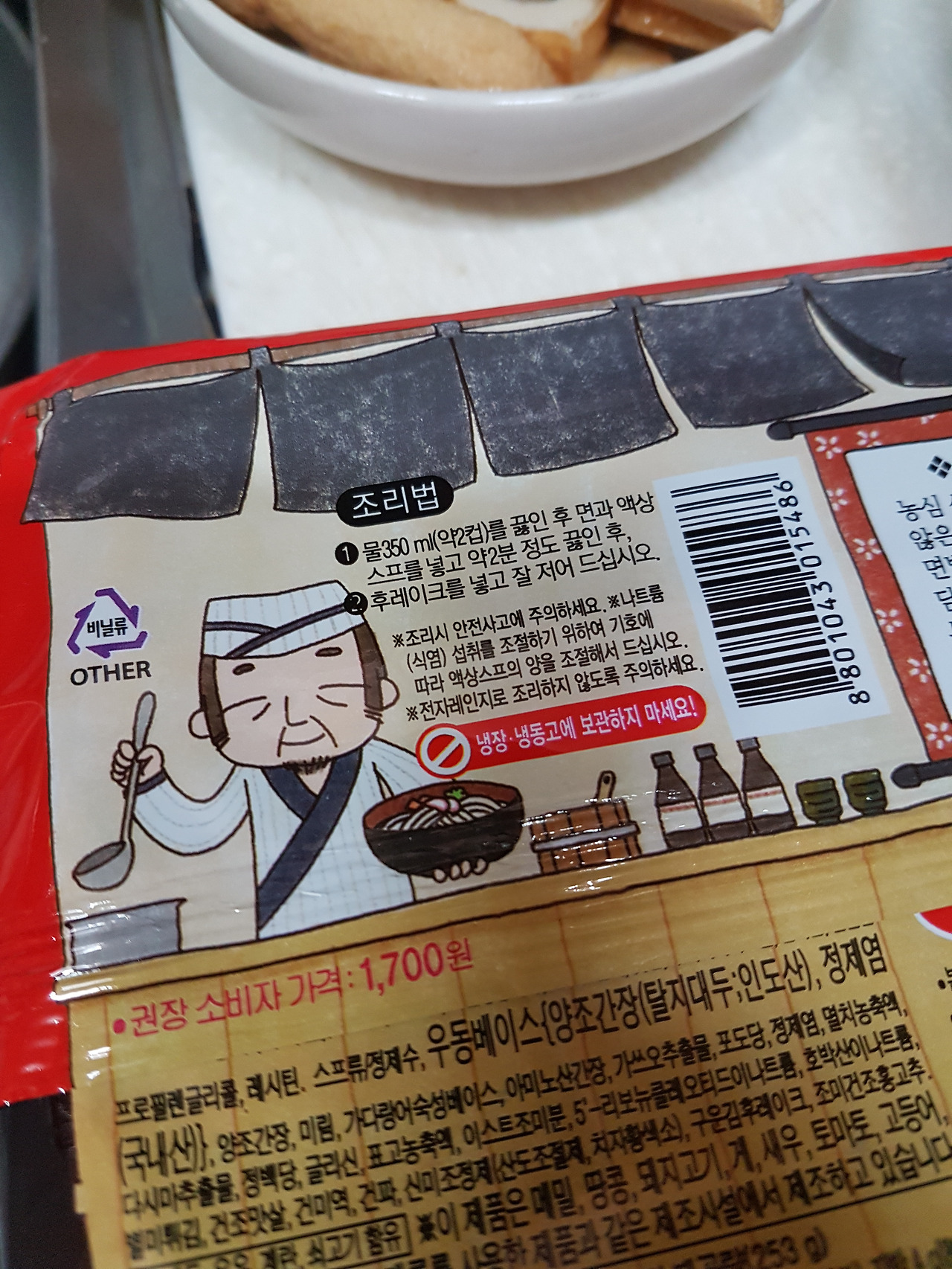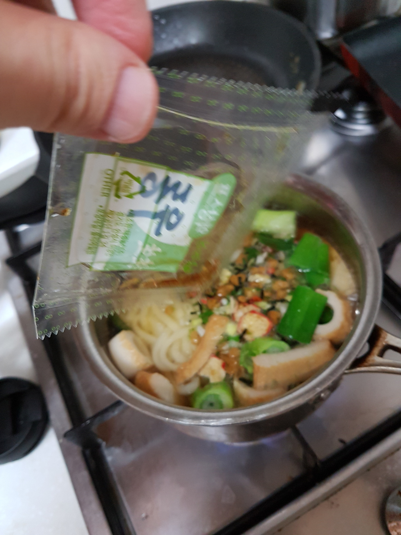 역시 가위로 어삭 어삭 대충 끊어놓은 파는 나름 국물을 보완하기 보다는 그냥 무의식적으로 넣게되는 필수항목이다. 대대적으로 라면에 넣는 급관에거 유래 된 것이다.