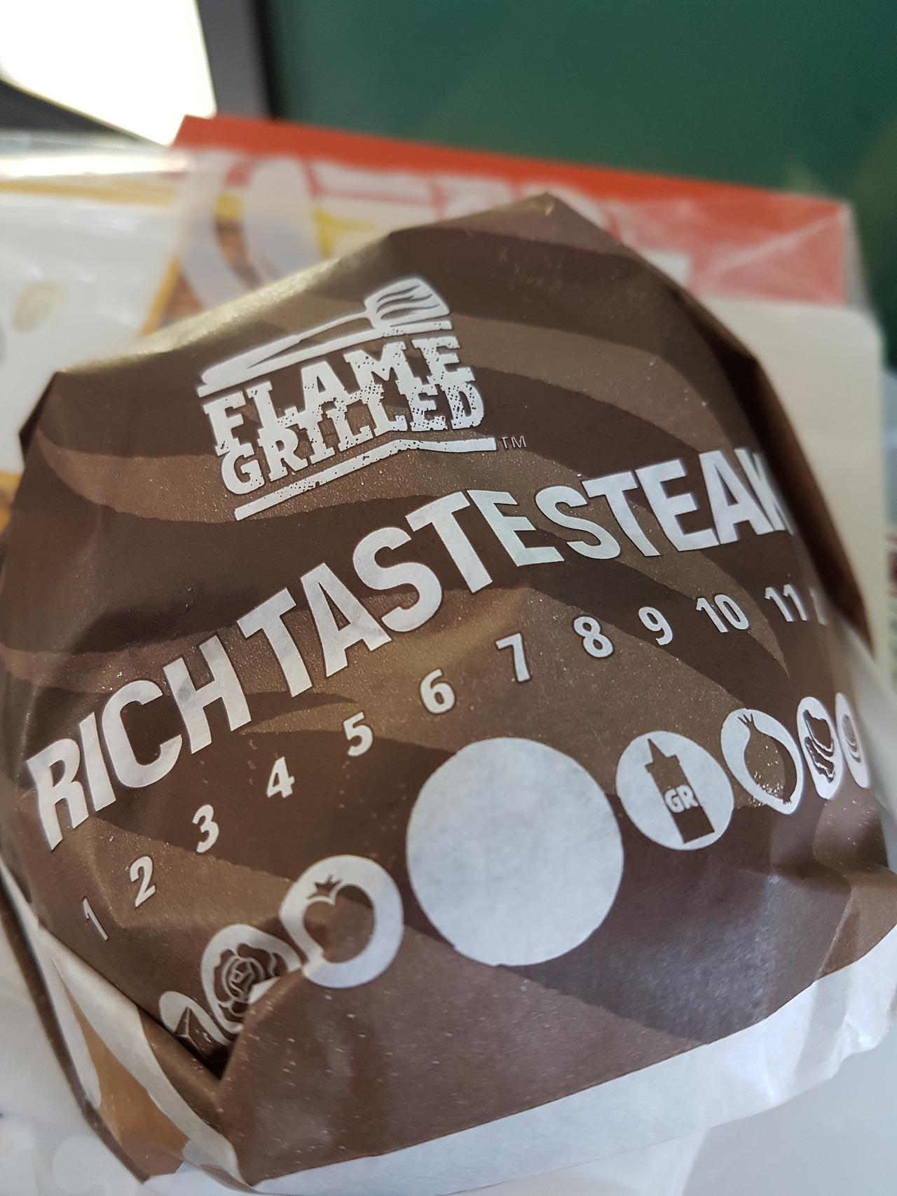기차안이다. 포장해 온 봉투에서 햄버거를 꺼낸다. 리치테이스트스테이크버거란다.