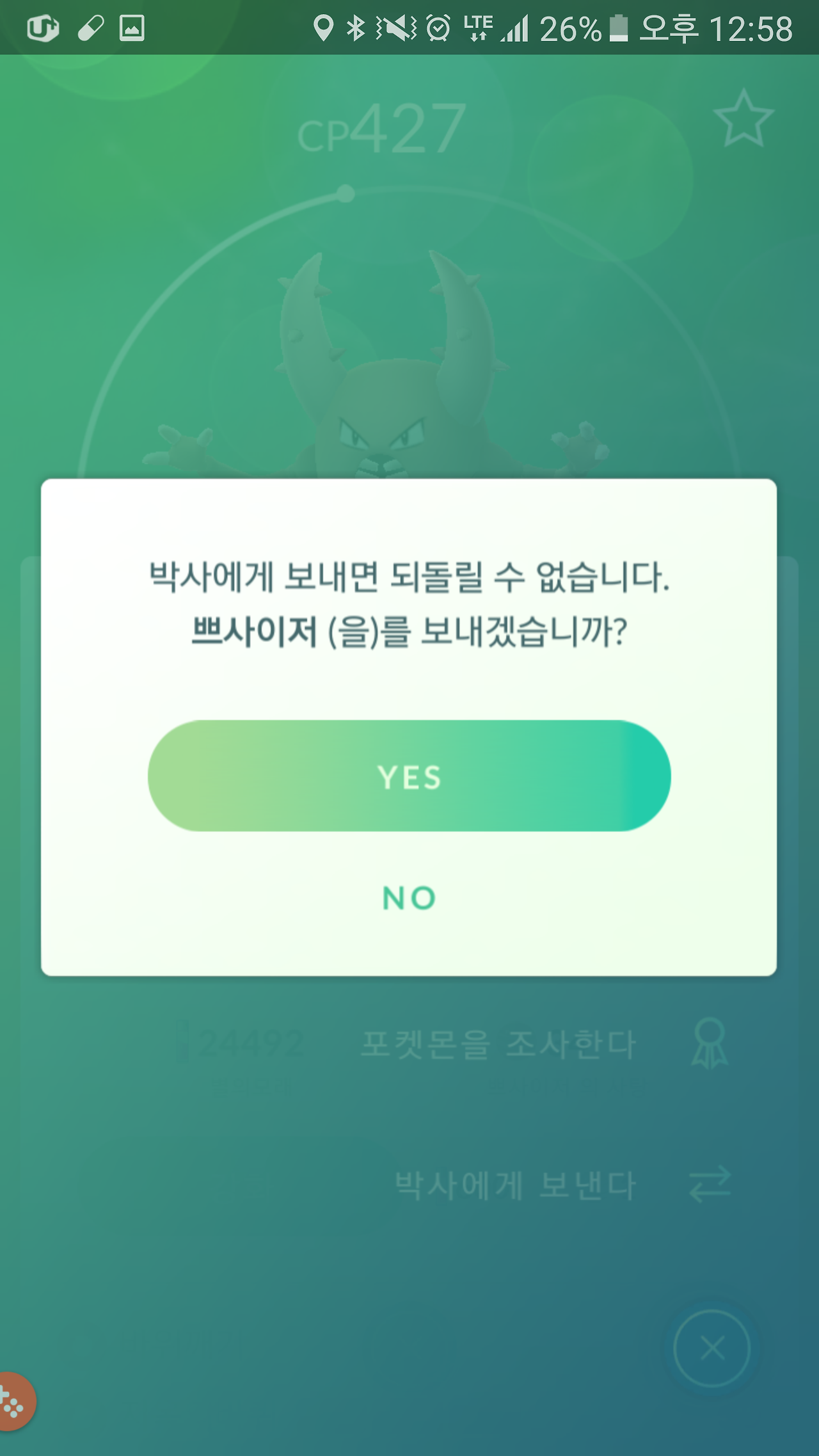 몬스터를 누르고 있으면 몬스터가 선택으로 활성화되고 하단에 박사에게 보낸다의 메세지가 뜬다.