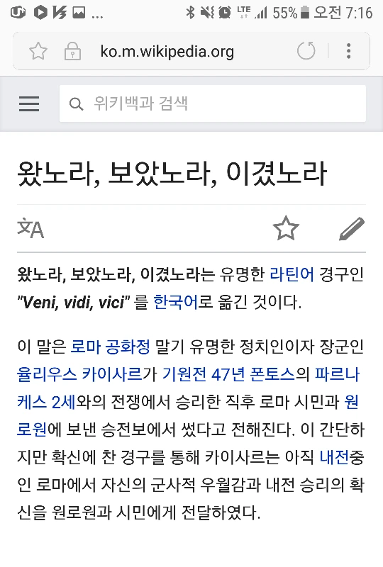 우리가 잘아는 율리우스 카이사르가 원로원과 시민들에게 군사적 우월함과 내정 승리을 전한 말이다.