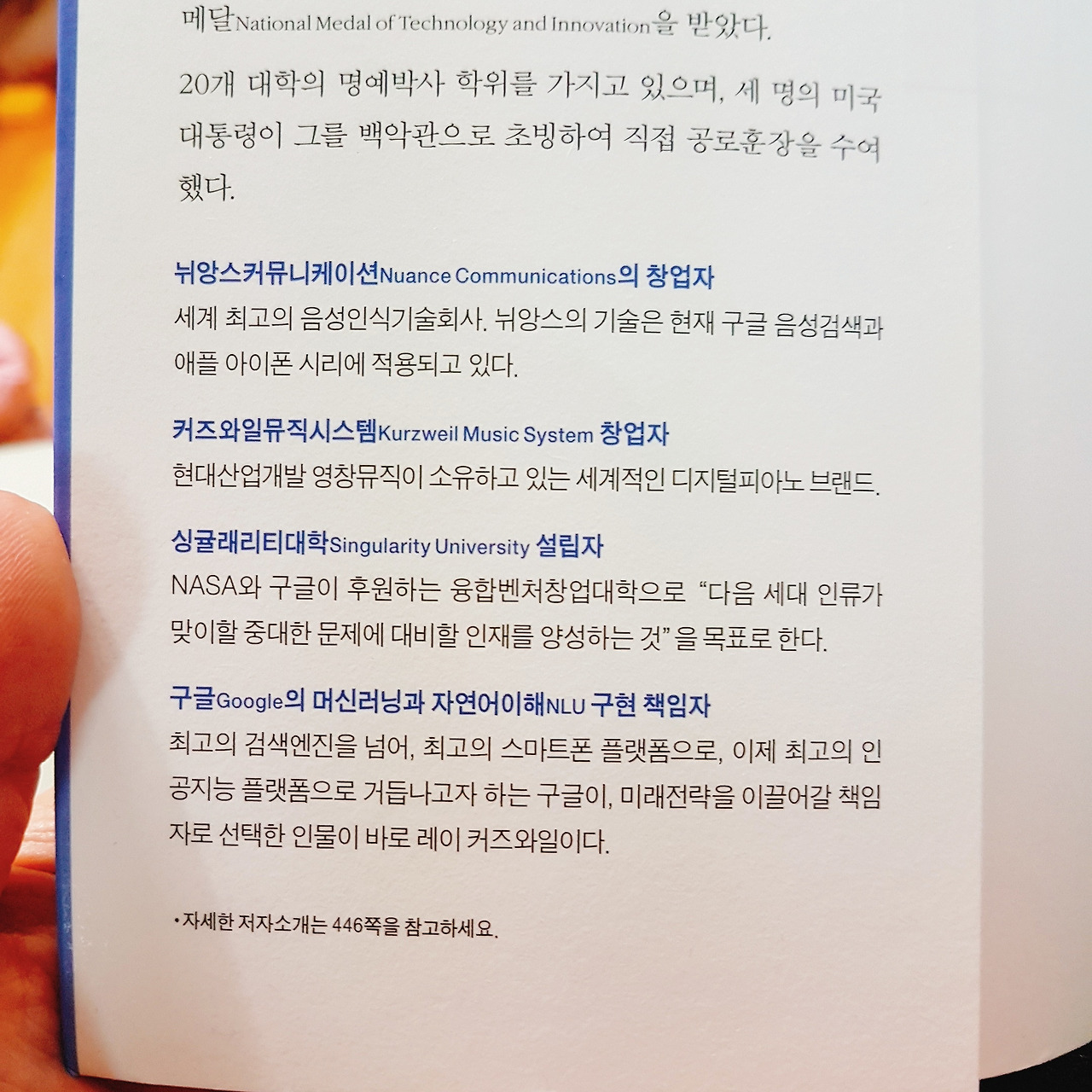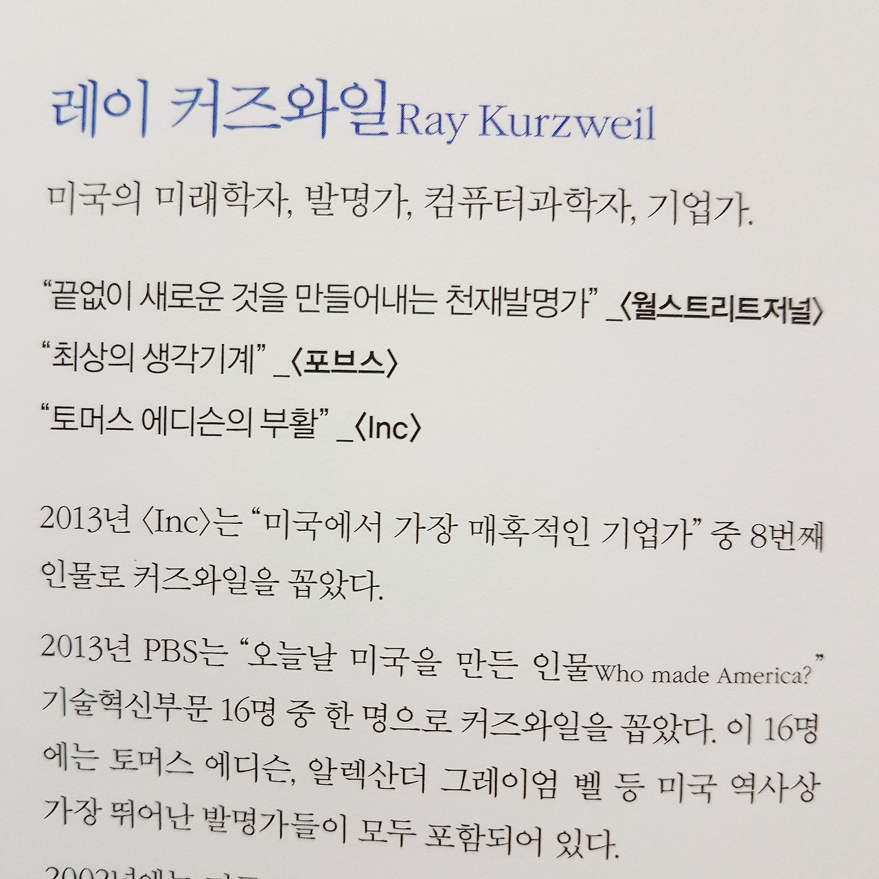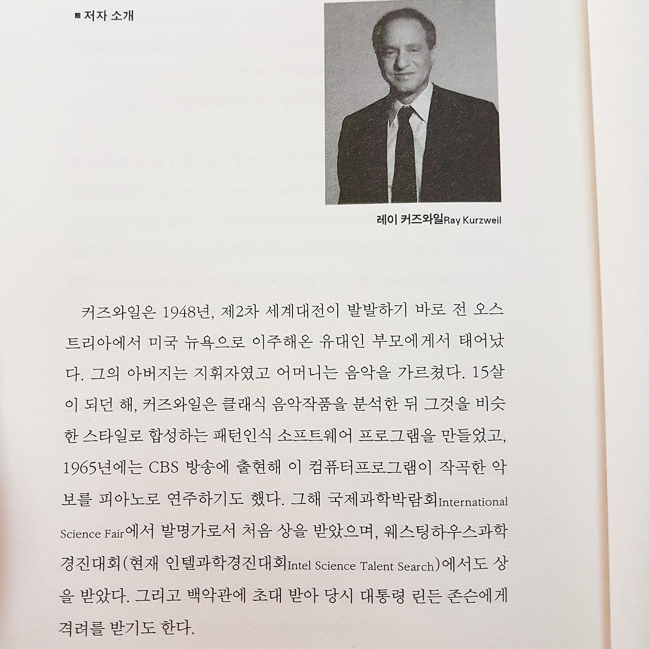 다시 찾아보니 레이 커즈와일박사는 상당히 유명한 사람인 것이였다. 오늘날 음성인식의 대명사라는 뉘앙스커뮤니케이션도 그의 처음에 개발한 항목에서 시작된 것이다. 그는 다방면에서 뿐만 아니라, 디지털피아노, 신디사이저를 붐업 시킨 사람이라고 볼 수 있는 것이다.