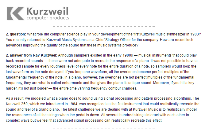 2. 질문 : 1983 년 Kurzweil 최초의 음악 신디사이저를 개발할 때 컴퓨터 과학이 어떤 역할을 했습니까? 최근 Kurzweil Music Systems의 최고 전략 책임자 (COO)로 돌아 왔습니다. 최근의 기술 발전으로 인해 이러한 음악 시스템에서 생산되는 사운드의 품질이 어떻게 개선되고 있습니까?