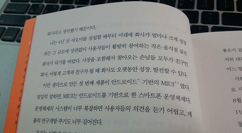 P10) 나는 4년 전 샤오미를 설립할 때부터 미래에 회사가 얼마나 크게 성장하든 그 규모에 상관없이 사용자들이 활발히 참여하는 작은 음식점 같은 회사가 되기를 바랐다. 사장을 포함해서 찾아오는 손님들 모두가 친구인 회사. 이렇게 고객과 친구가 될 때 회사도 오랫동안 성장, 발전할 수 있다.