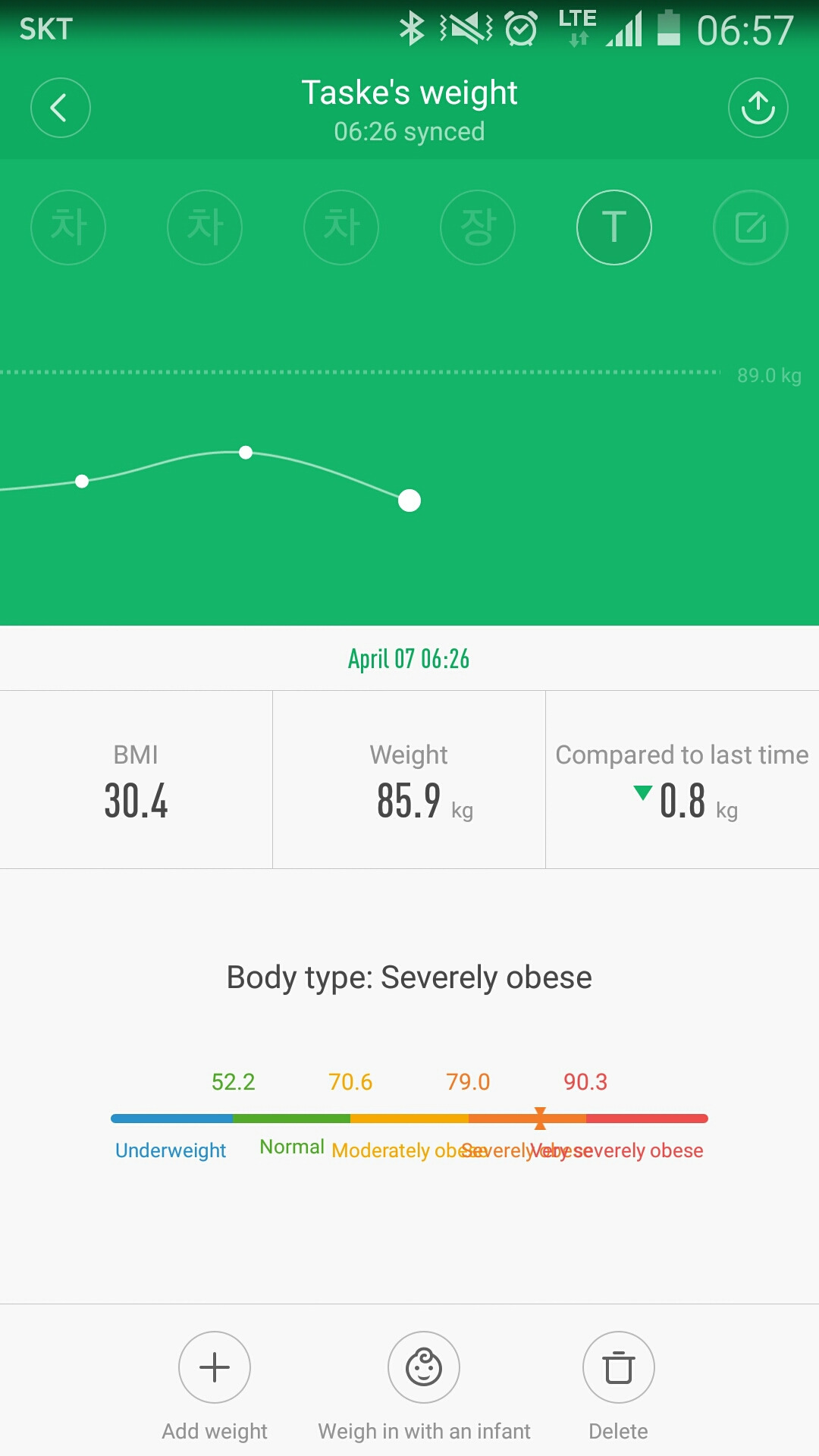 이제는 일상이 된 출근 전 체중 확인, 그리고 앱을 실행시켜 나의 어마무시한 체중을 적재한다. 물론 나의 식구들의 정보도 저장되어 있다. 그나마 나의 몸 상태를 확인할 수 있는 적정한 가격의 체중계 패키지다.