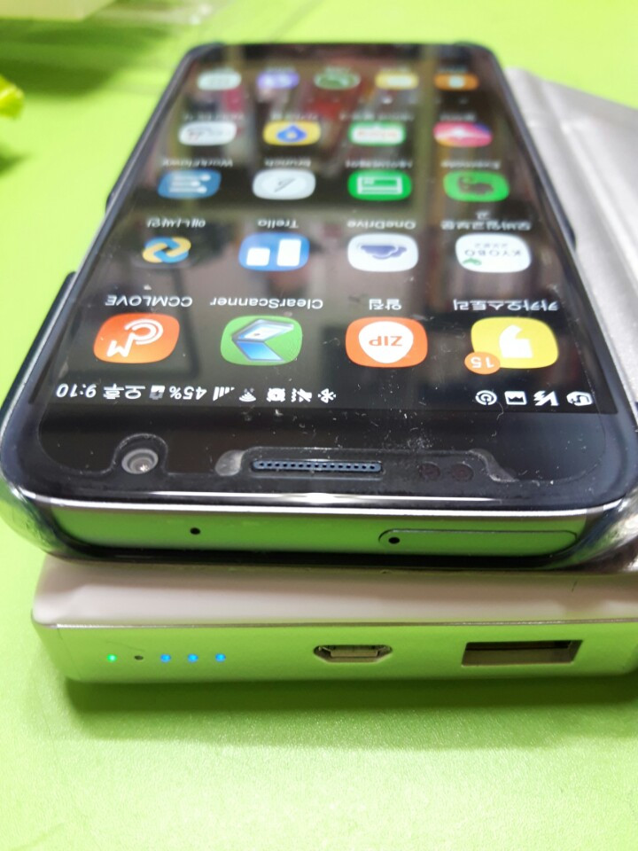 역시 이 한장의 사진를 위하여 기승전이 길었다. 바로 포터블 무선충전이 가능하다는 것이다. 바로 충전기 위에 스마트폰을 올려 놓으면 그만이다. 이것이 압권이다. 이것의 용도는 유용하다. 주렁 주렁 충전 케이블이 거슬리는것이 사실이다. 테이블이나 책상에 함께 올려놓으면 티도 안난다. 지인은 헤어밴드로 묶어서 손에 포개서 들고 다닌다.