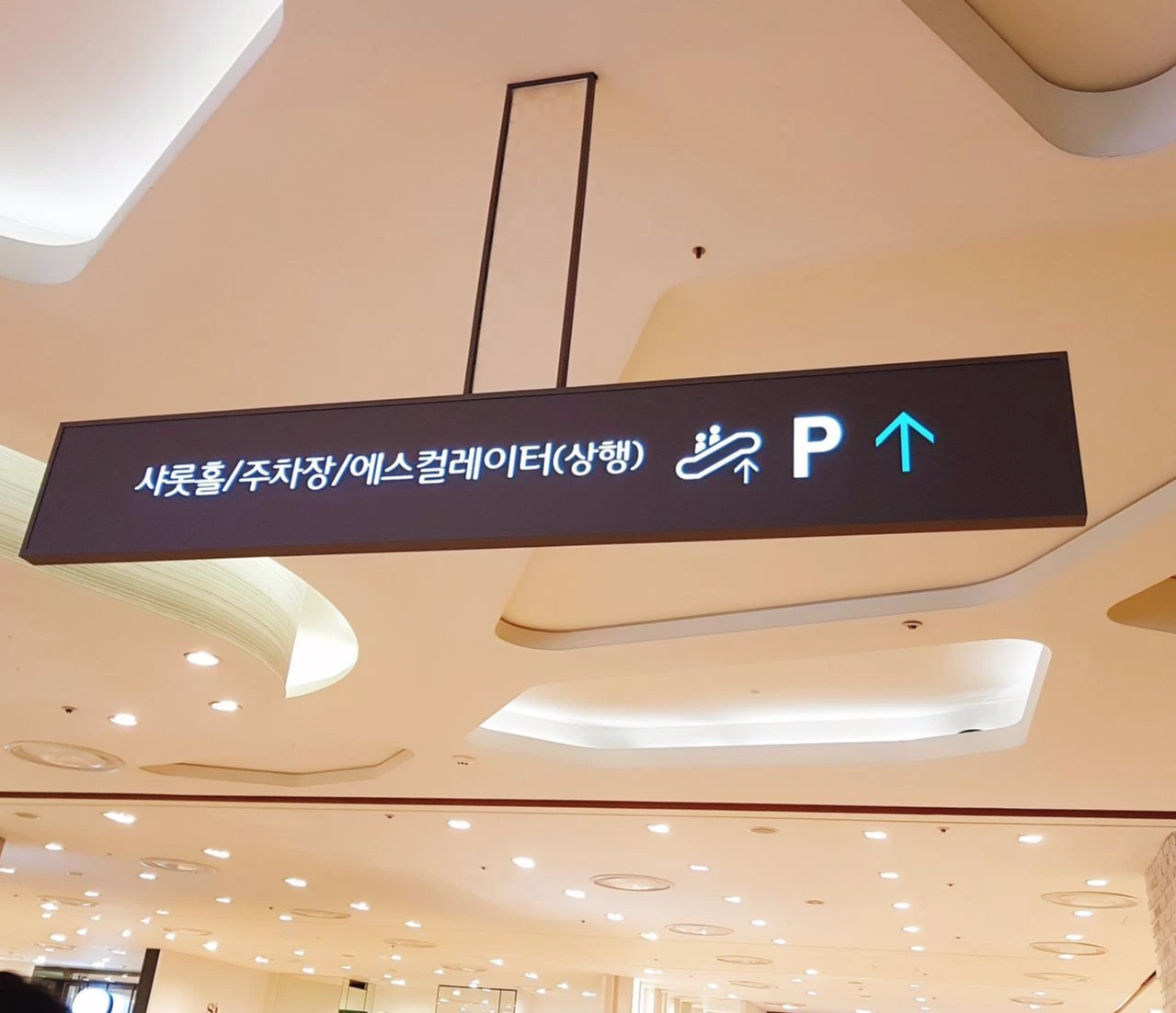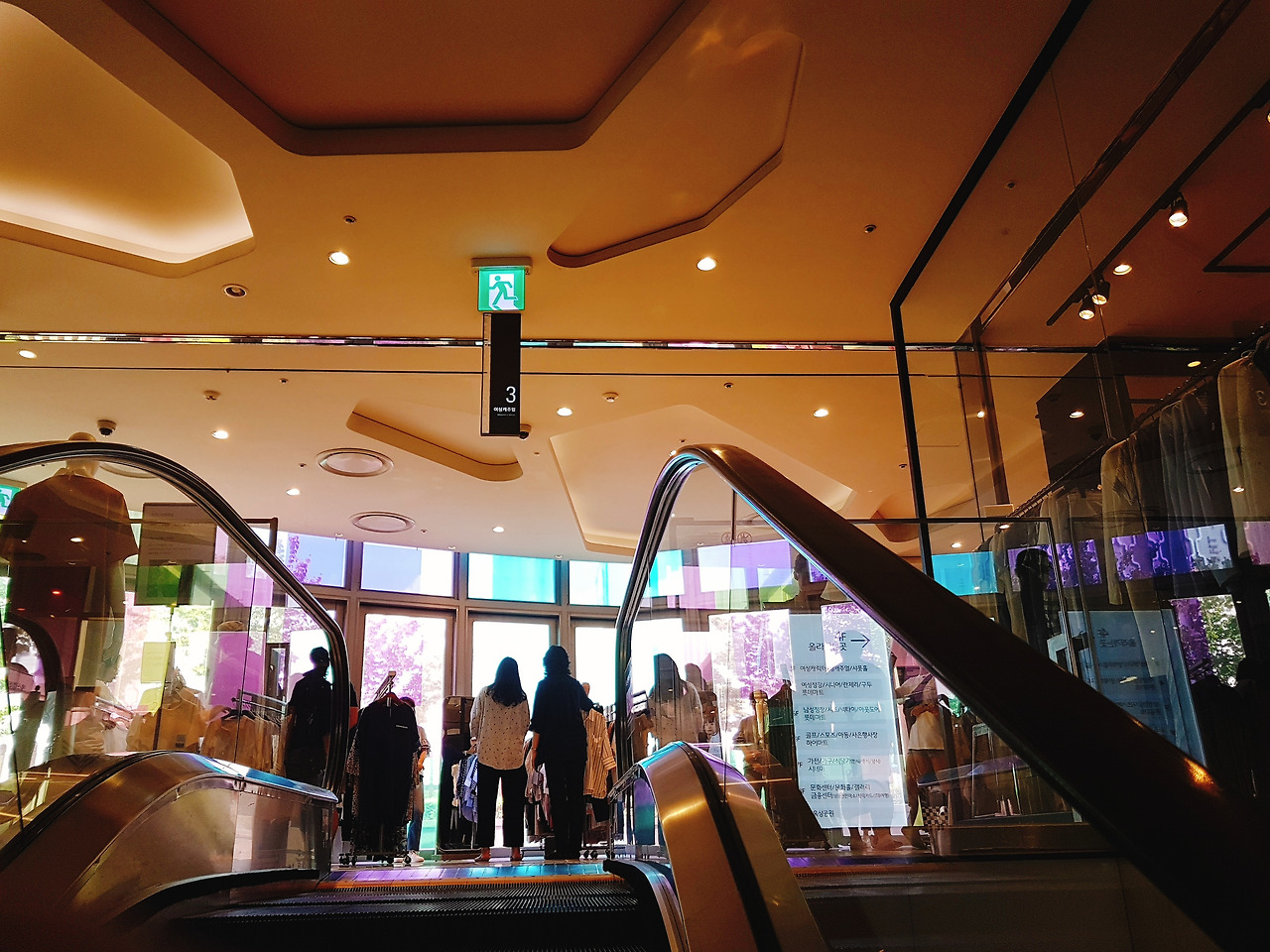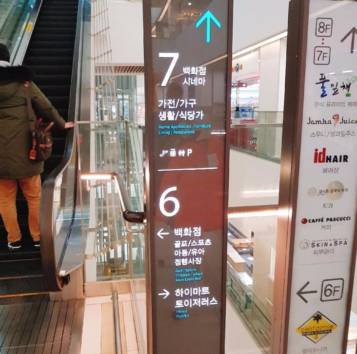 백화점이 커서 에스컬레이트를 3층에서 상행으로 한번 더 갈아타야 한다. 오른쪽으로 돌아가서 딕진하다. 이정표를 보고 왼편의 상행 에스컬레이트를 타면 된다. 버거럽다.