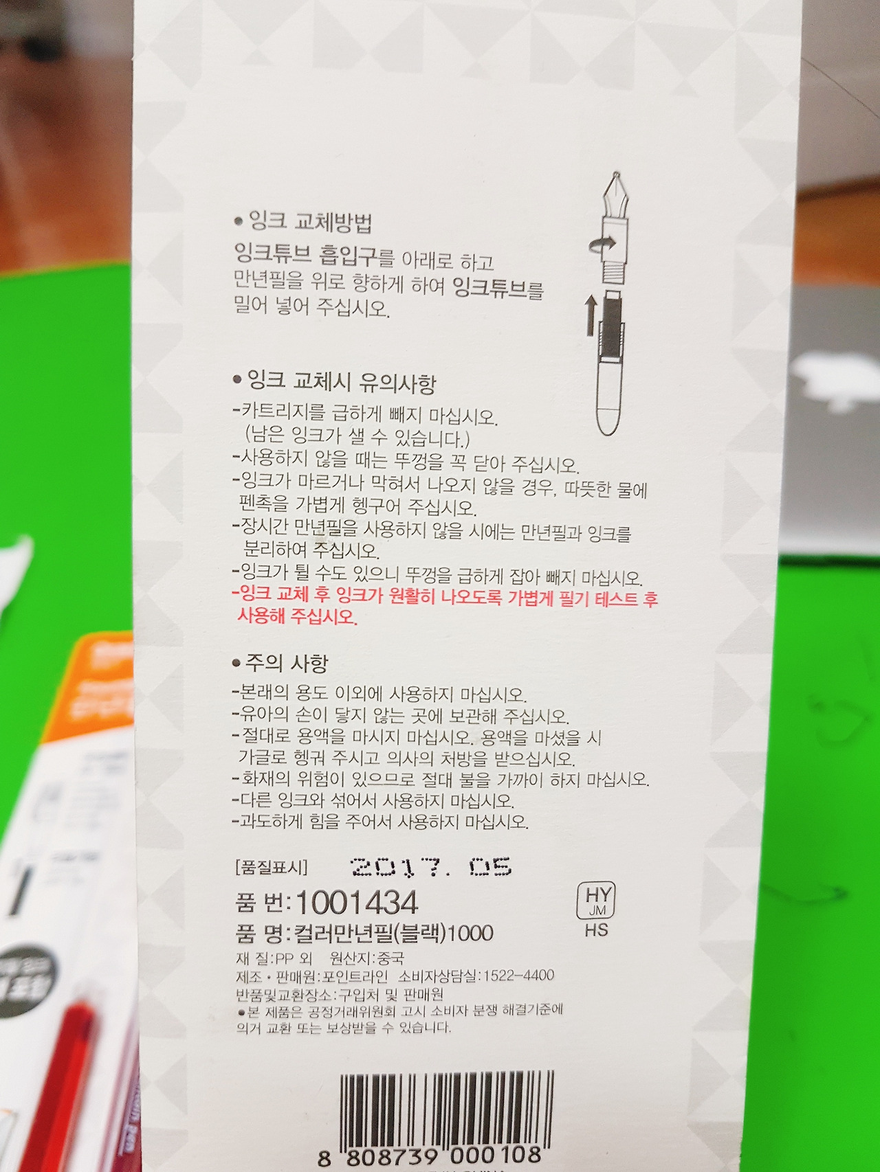 뒷면의 잉크 꽂는 방법이 설명되어 있다.