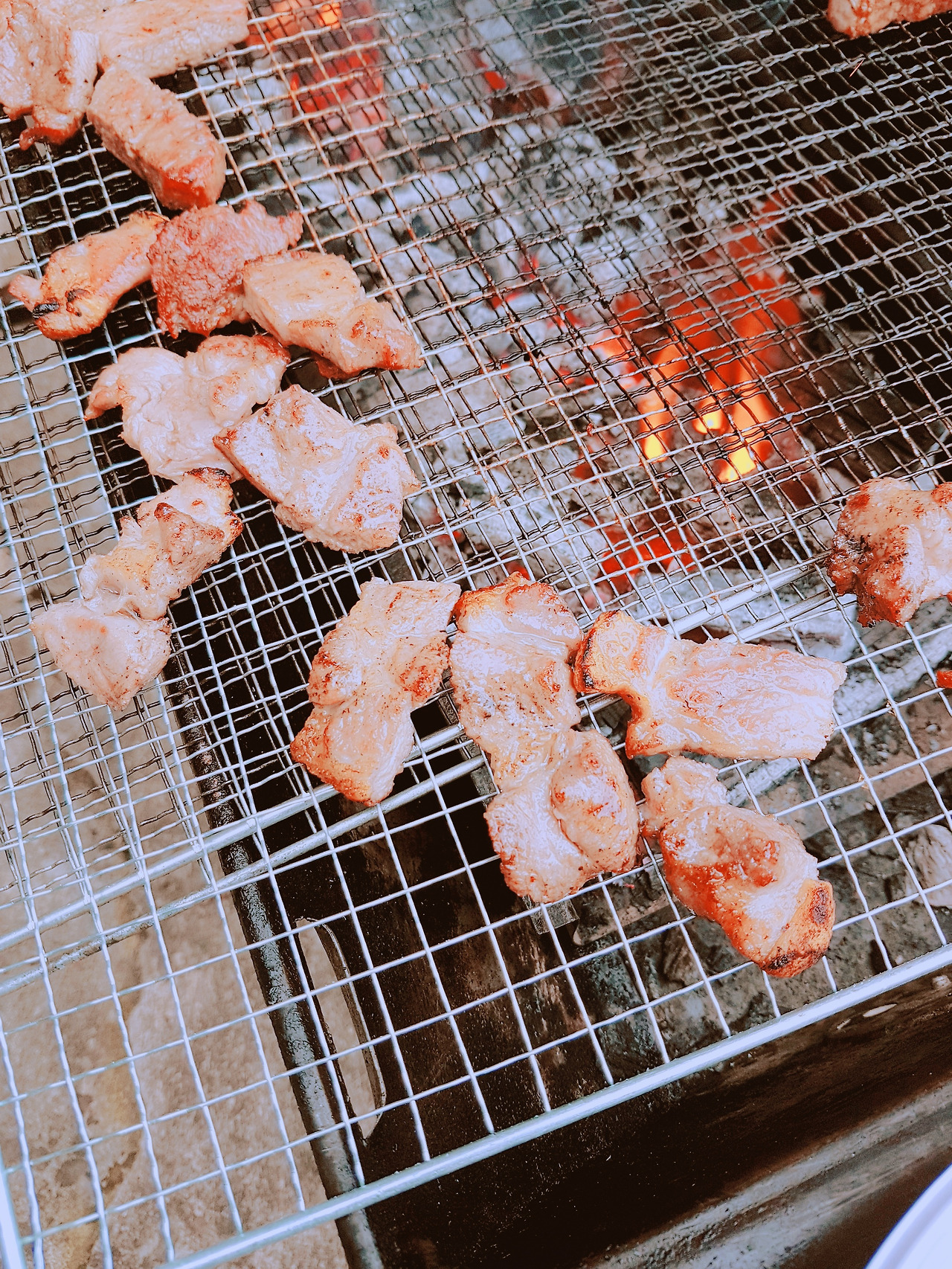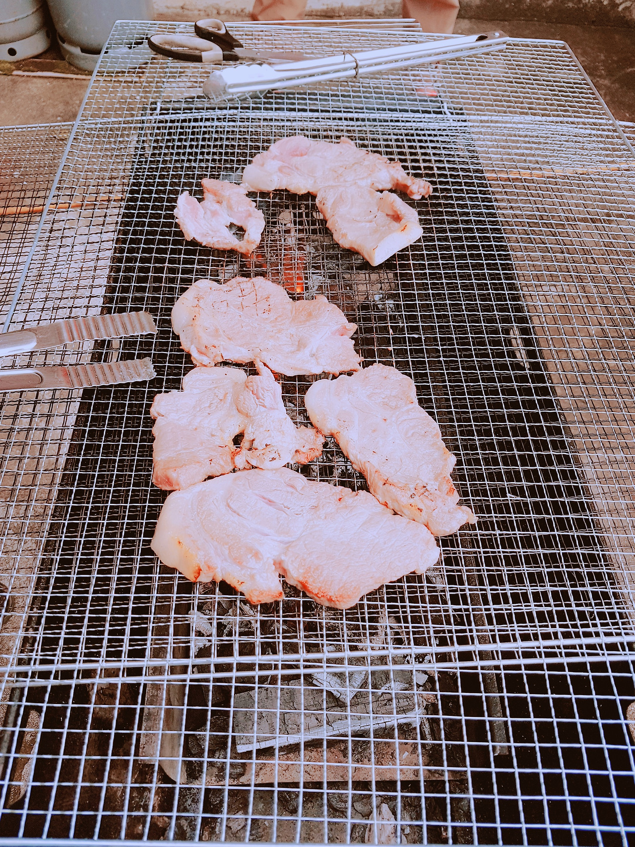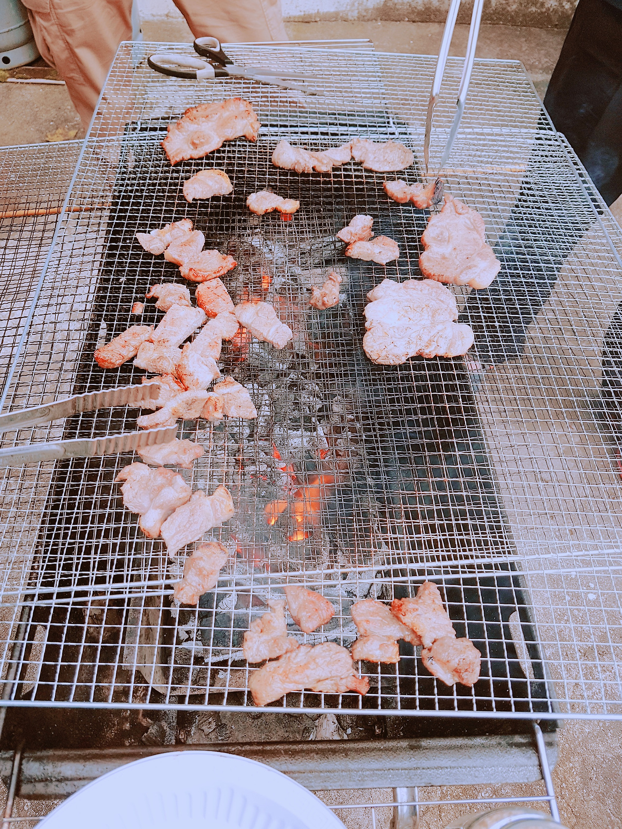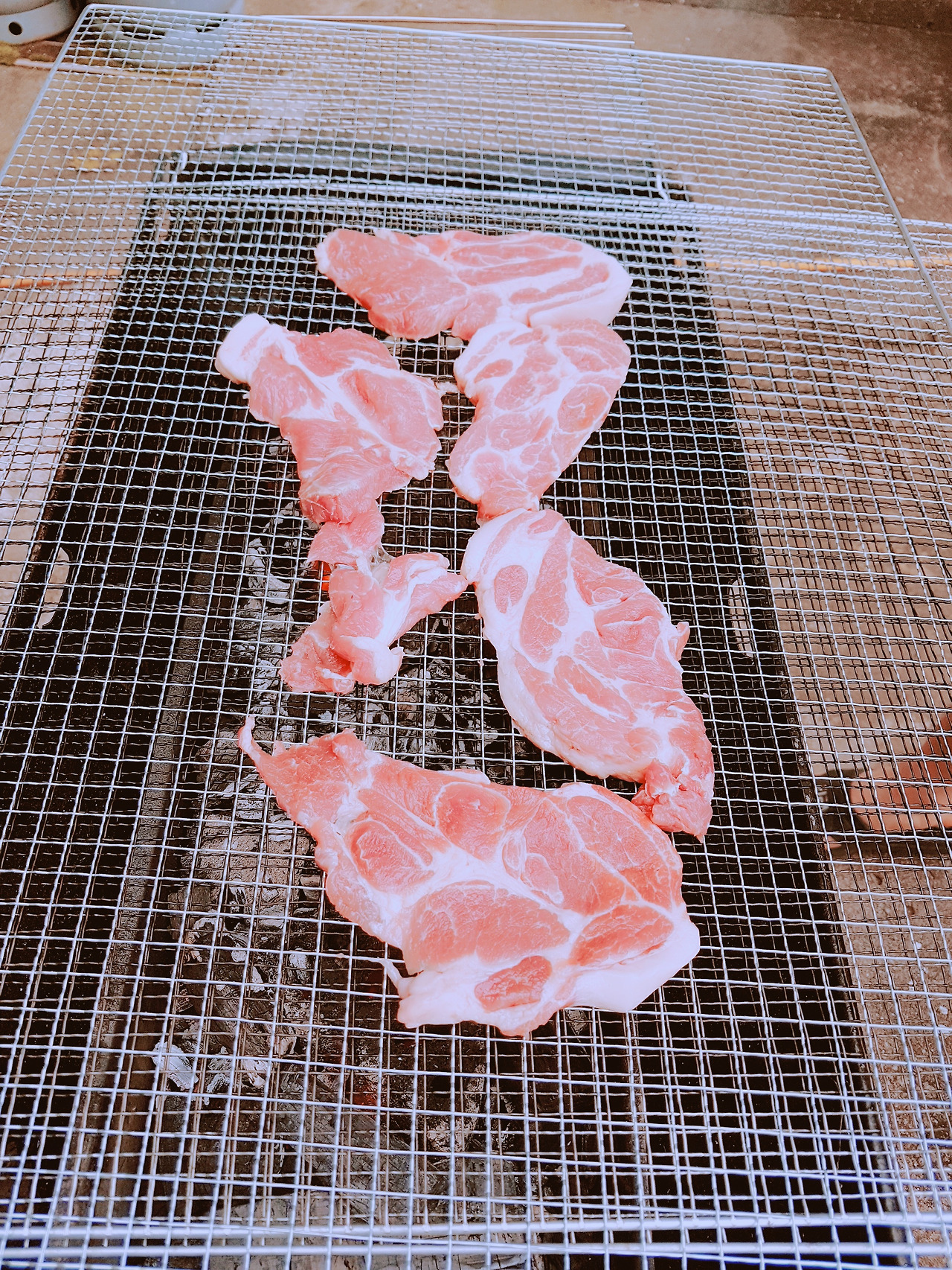 숯불과 번개탄 고기 굽기가 준비가 되었다. 바로 셋팅 완료, 그럼 삼겹살 투척과 고기굽는 이야기 시작된다. 일단 고기부터