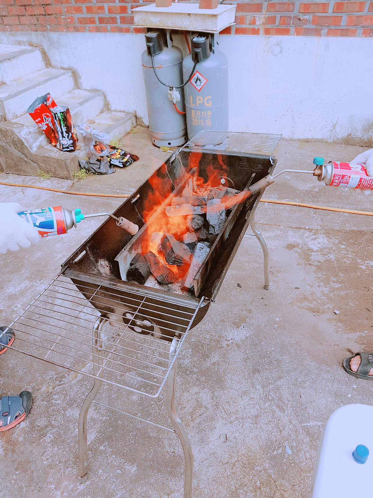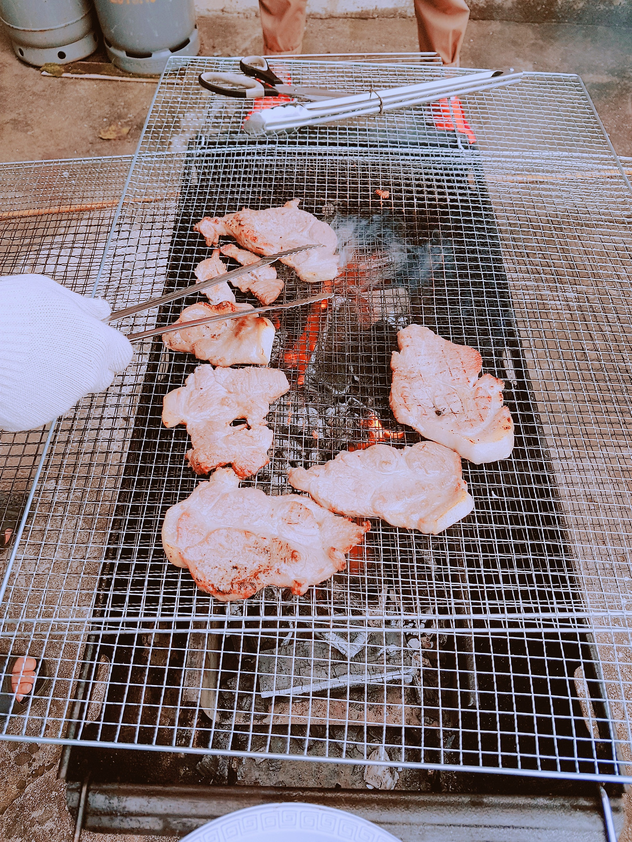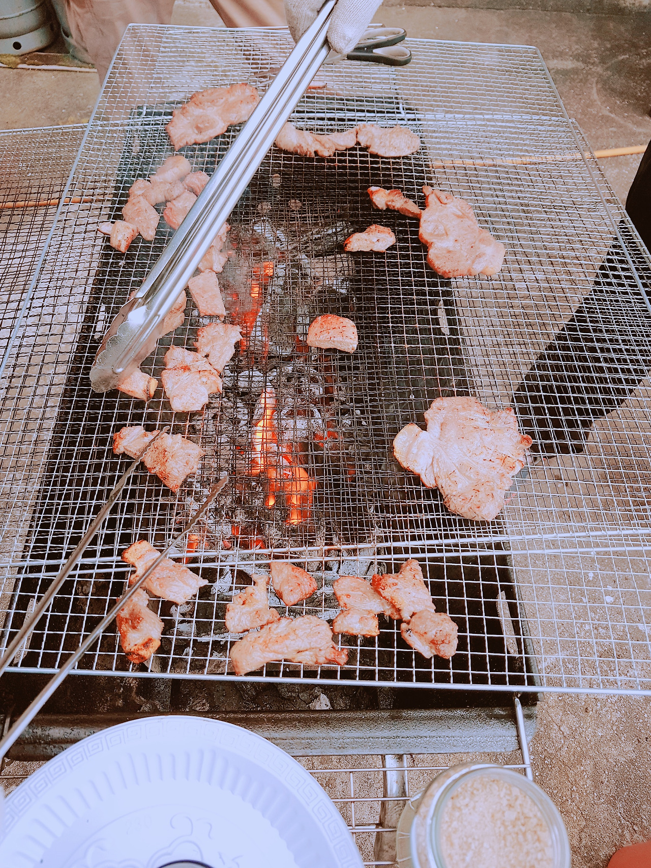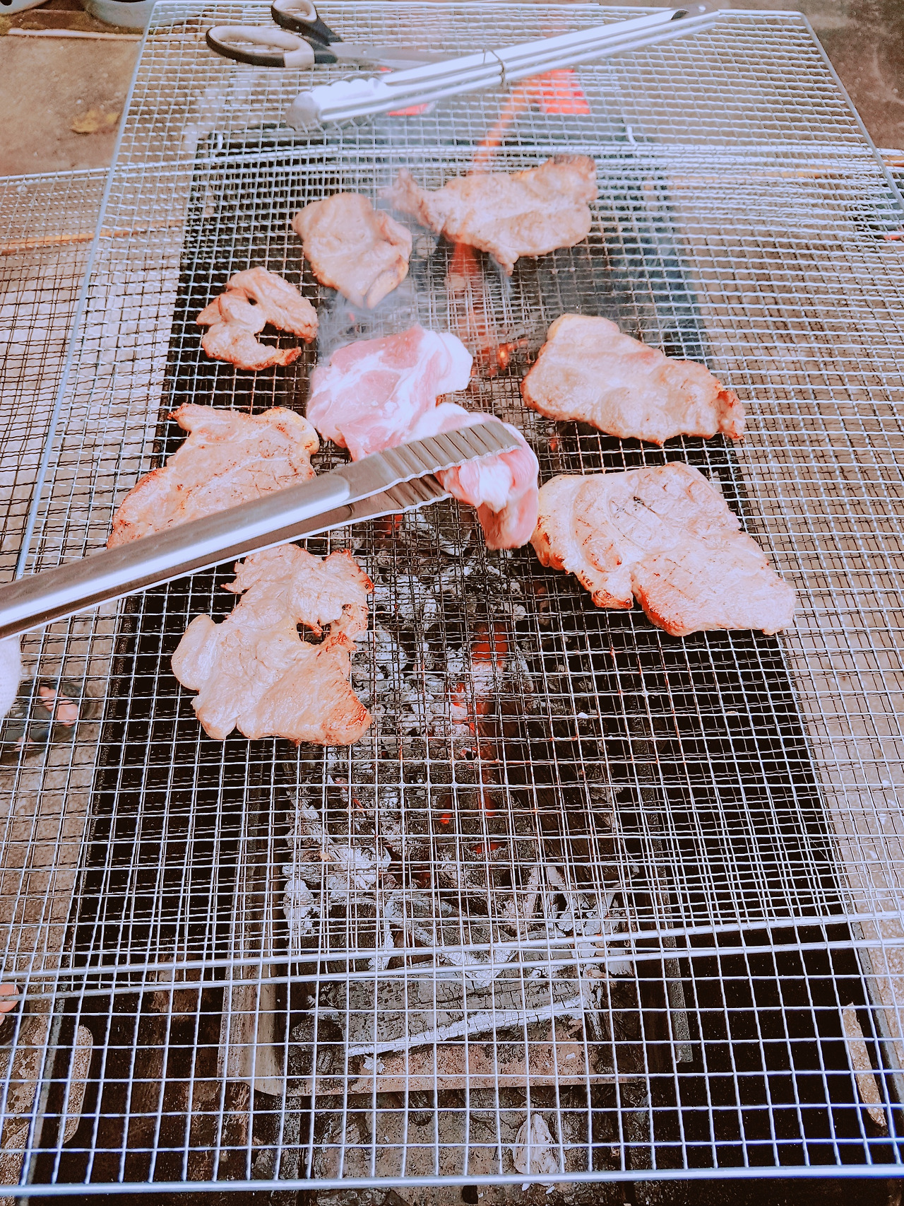 숯불과 번개탄 고기 굽기가 준비가 되었다. 바로 셋팅 완료, 그럼 삼겹살 투척과 고기굽는 이야기 시작된다. 일단 고기부터