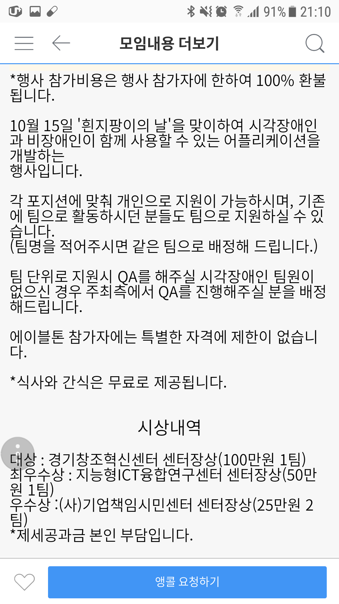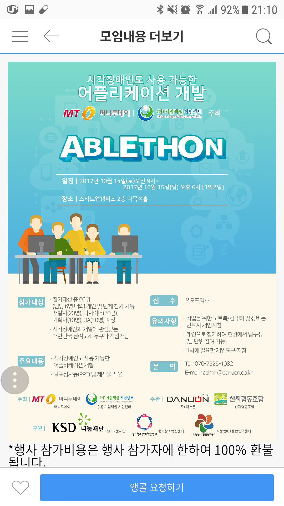 시각장애인도 사용 가능한 어플리케이션 개발 ABLETHON, 바로 해커톤이다. 토요일 오전부 1박2일 나에게는 낯익은 판교의 스타트업캠퍼스에 주말에 진행되었다.