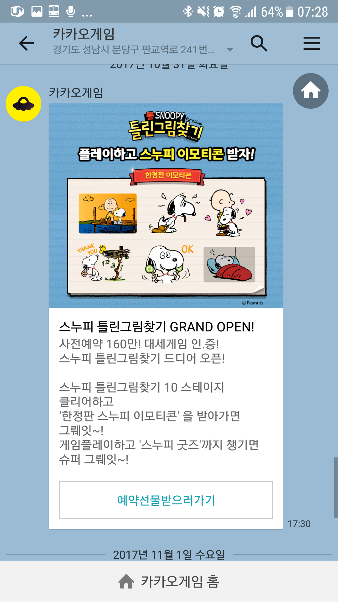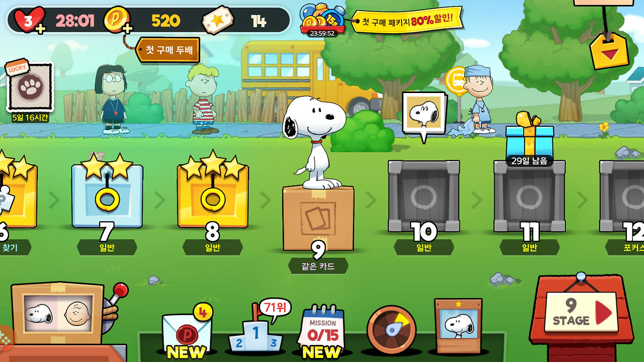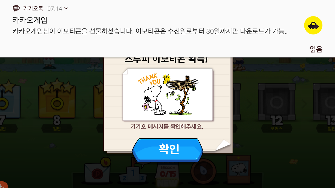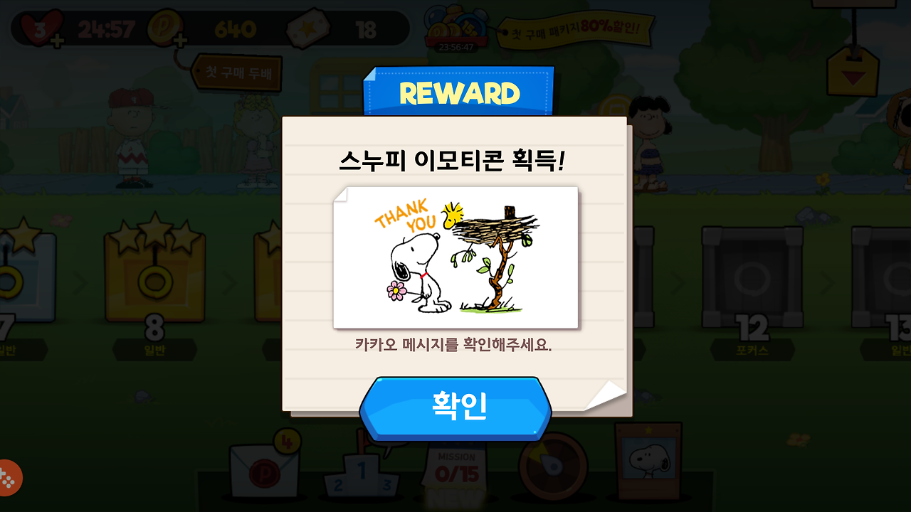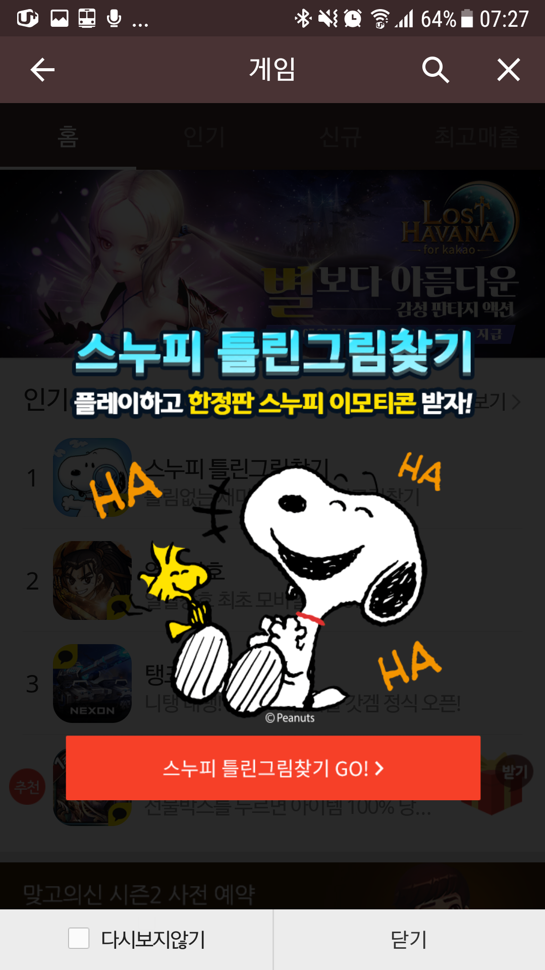 이모티콘과 아기자기한 캐릭에 빠지다. 게임의 고전 대마왕은 숨은그림찾기다. 별 설명이 필요없다. 게다가 스누피다. 작년인가 올핸가 몇주년 행사를 한거 같다. 친숙한 캐릭과 고전게임의 만남 그리고 무엇보다 이모티콘이다.