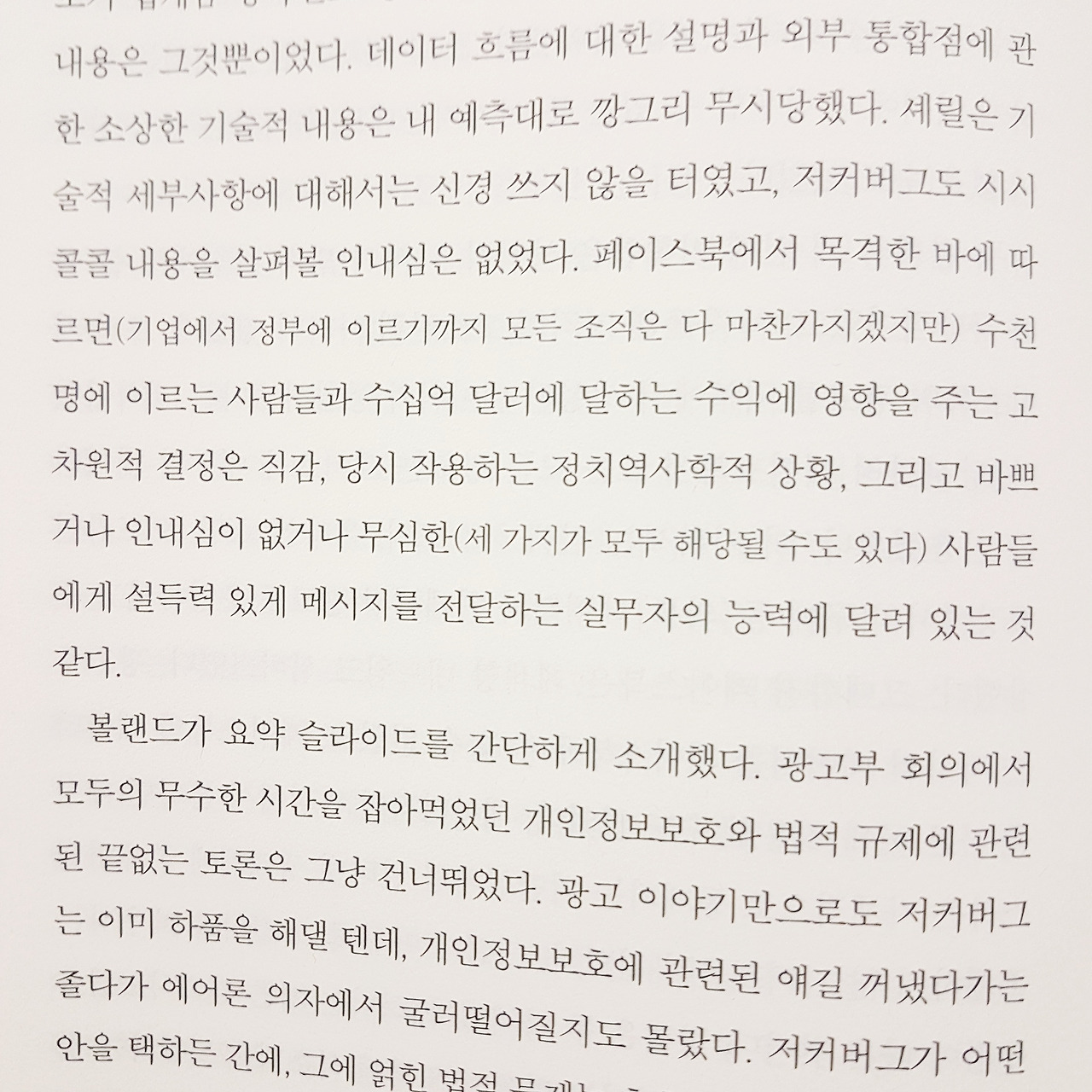 페이스북에서 목격한 바에 따르면(기업에서 정부에 이르기까지 모든 조직은 다 마찬가지겠지만) 수천명에 이르는 사람들과 수십억 달러에 달하는 수익에 영향을 주는 고차원 결정은 직감, 당시 작용하는 정치역사학적 상활, 그리고 바쁘거나 인내심이 없거나 무심한(세 가지가 모두 해당될 수도 있다) 사람들에게 설득력 있게