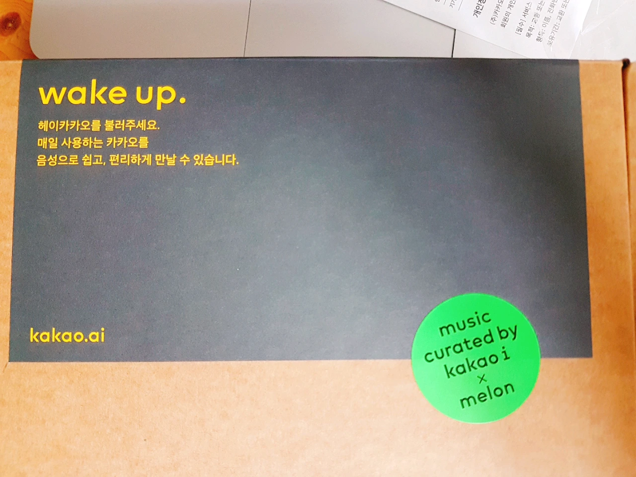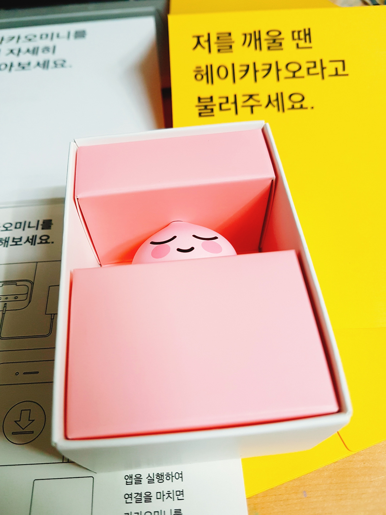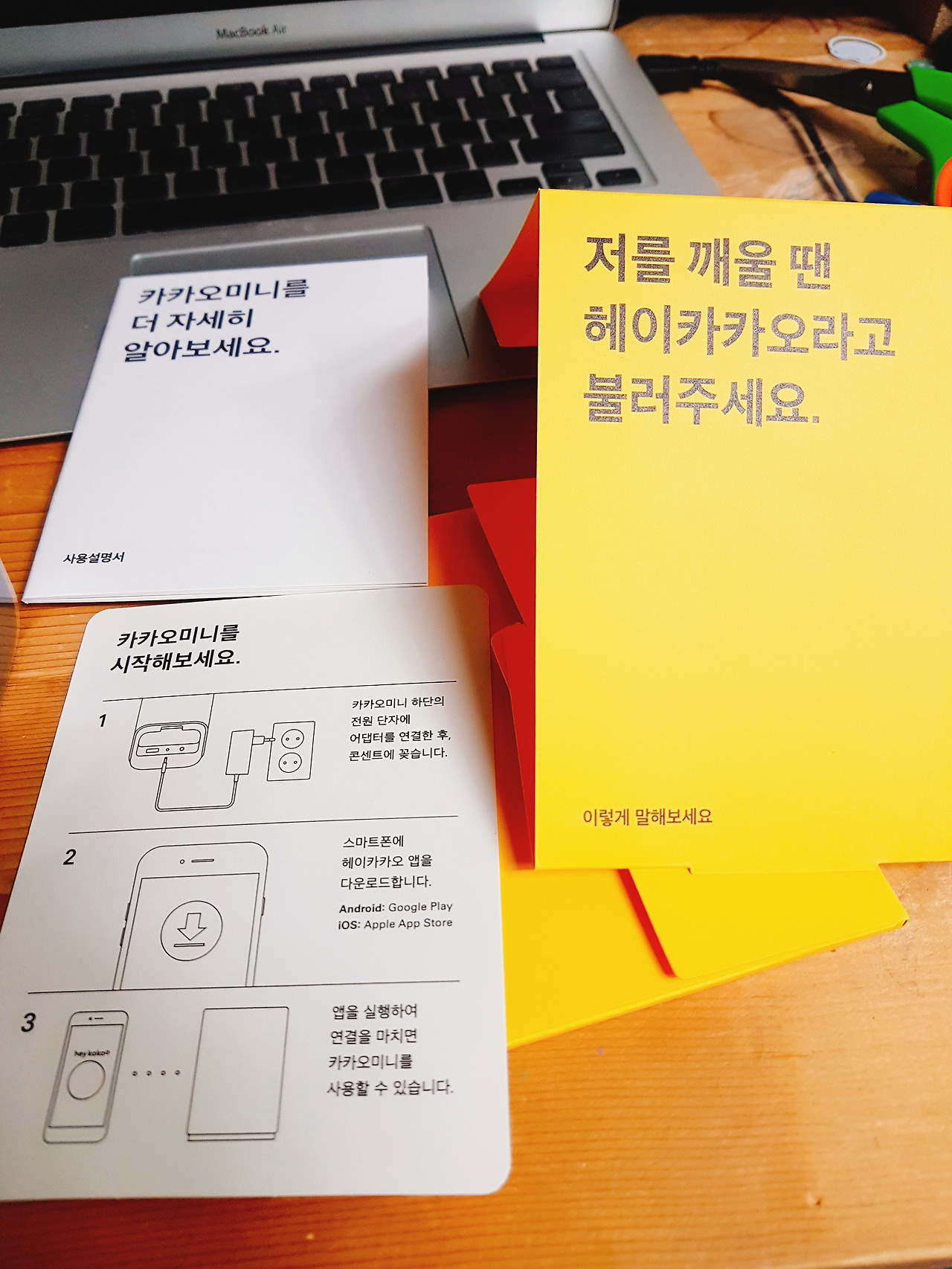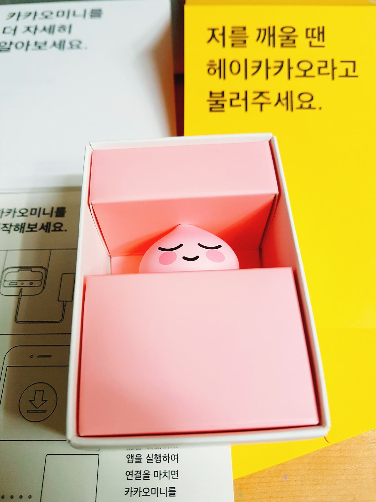 설명서다. 한장짜리 카타오미니 시작이면 충분하다. 큼직한 전원선을 꼽고, 카카오미니를 설치하고, 앱으로 카카오 미니를 연결하고 설정한다.