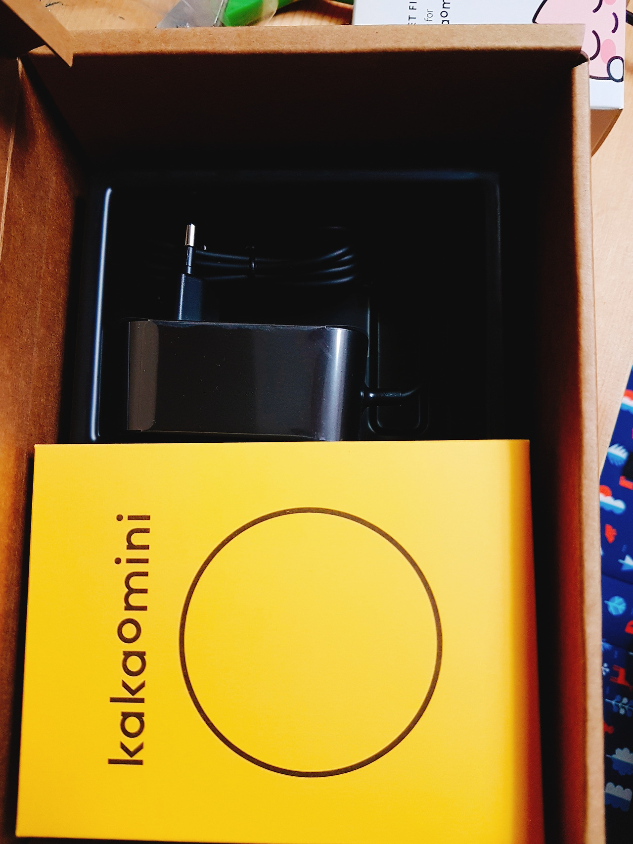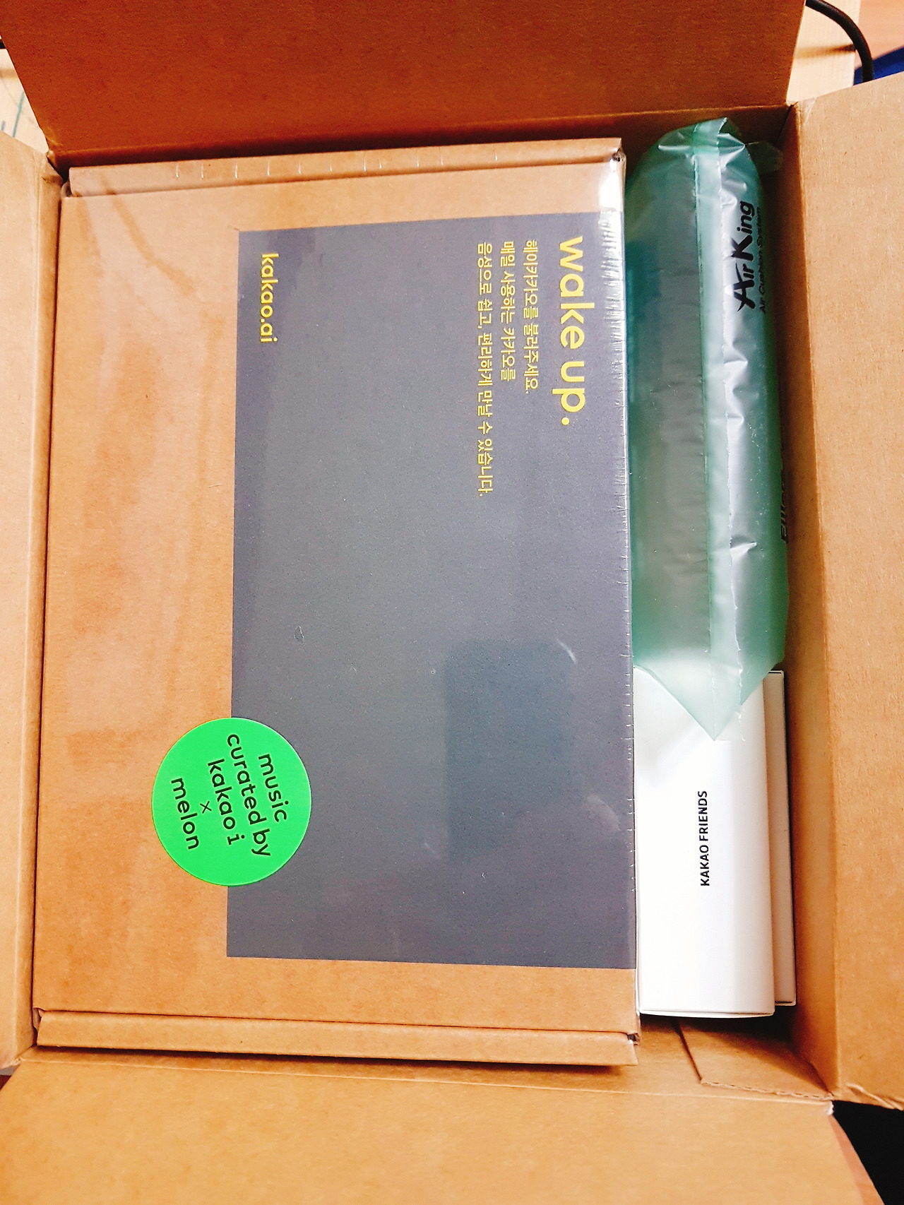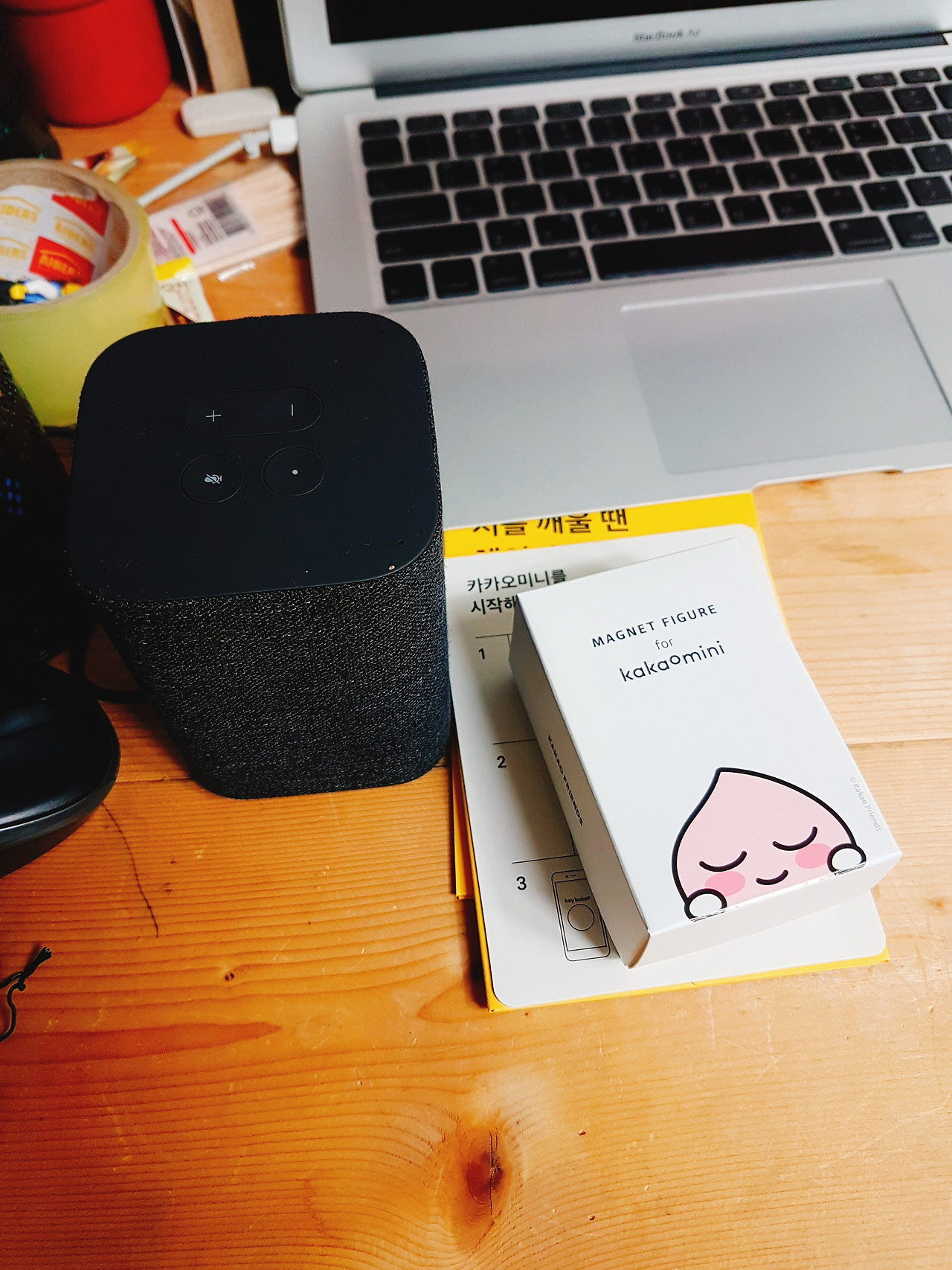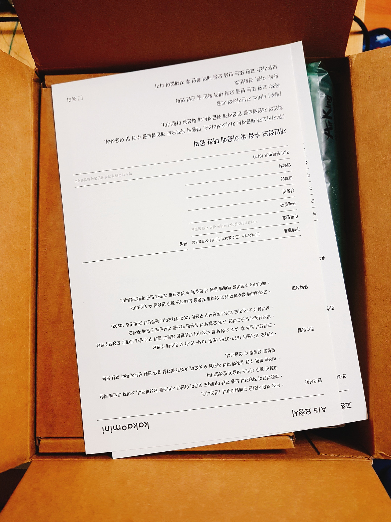 설명서다. 한장짜리 카타오미니 시작이면 충분하다. 큼직한 전원선을 꼽고, 카카오미니를 설치하고, 앱으로 카카오 미니를 연결하고 설정한다.