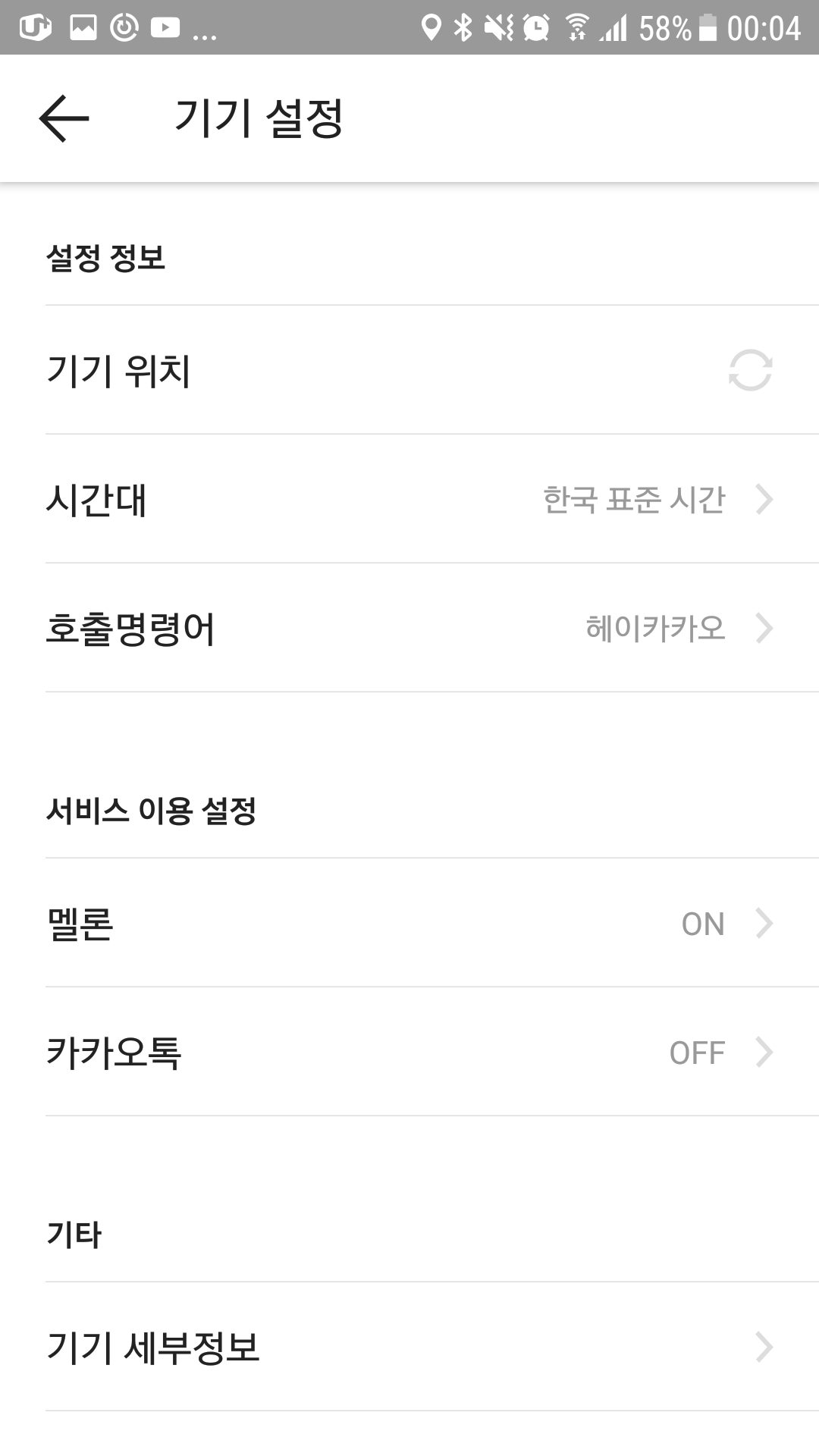 앱 연결은 스마트폰 앱, 카카오 미니를 통해 설정을 한다. Wi-Fi연결과 멜론, 카카오설정, 위치설정, 호출명령어도 옵션이 있다.