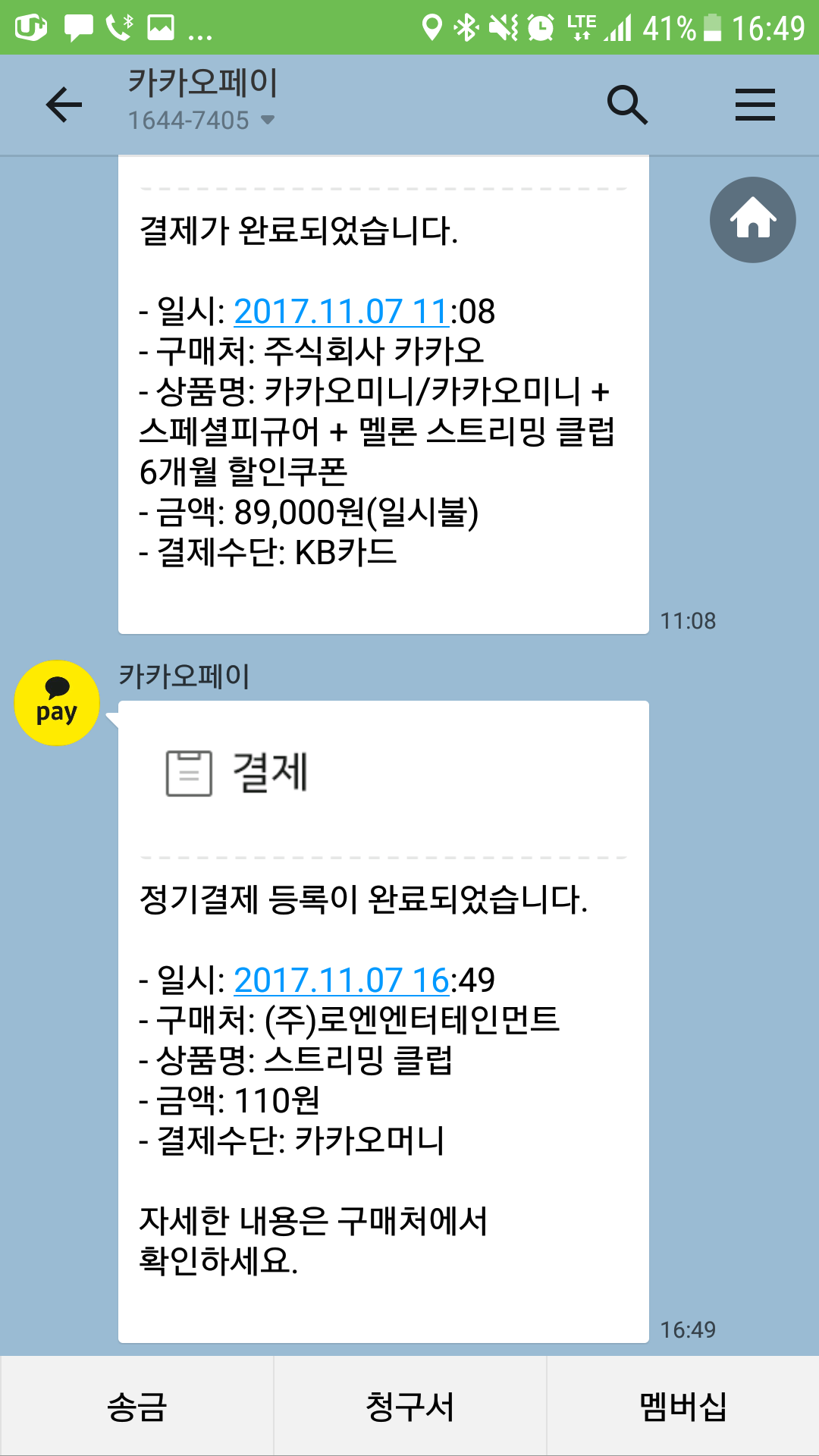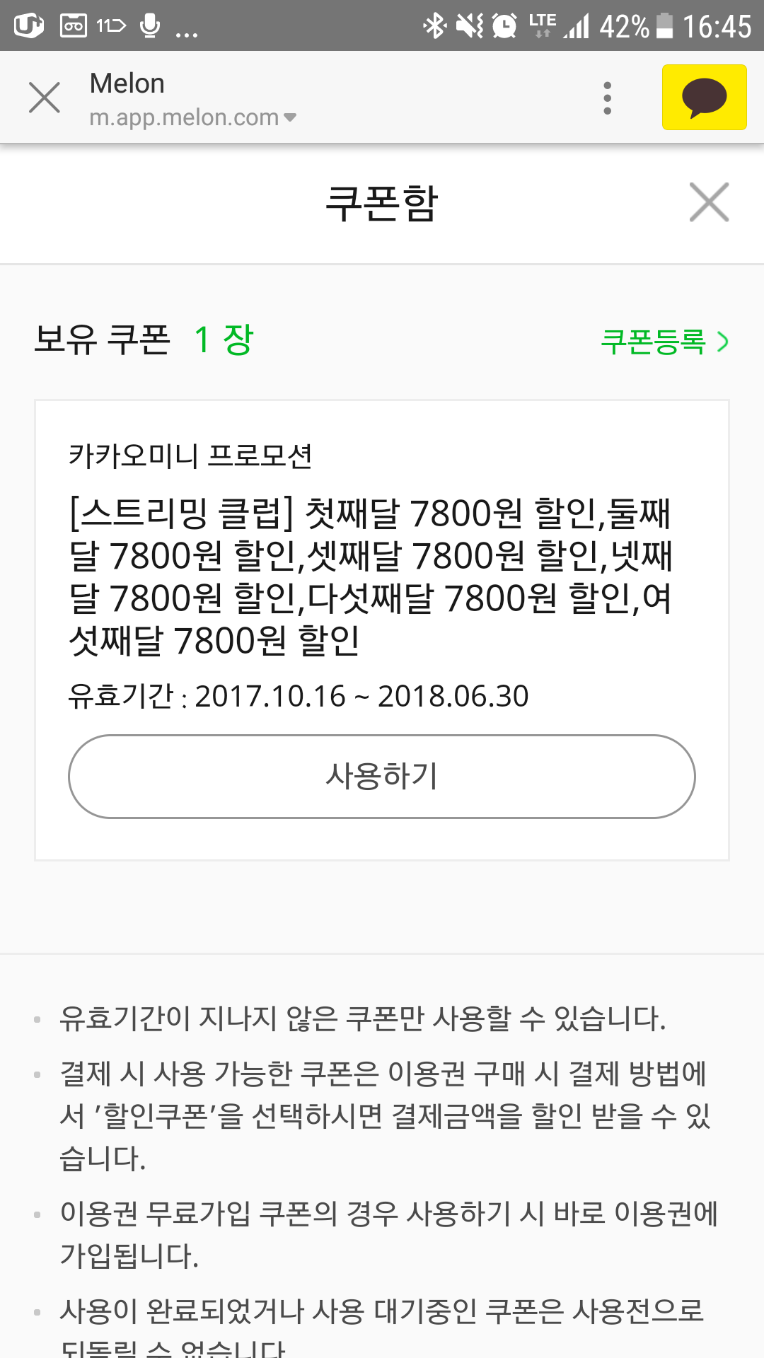 멜론쿠폰을 카톡으로 어제 받아 등록 완료