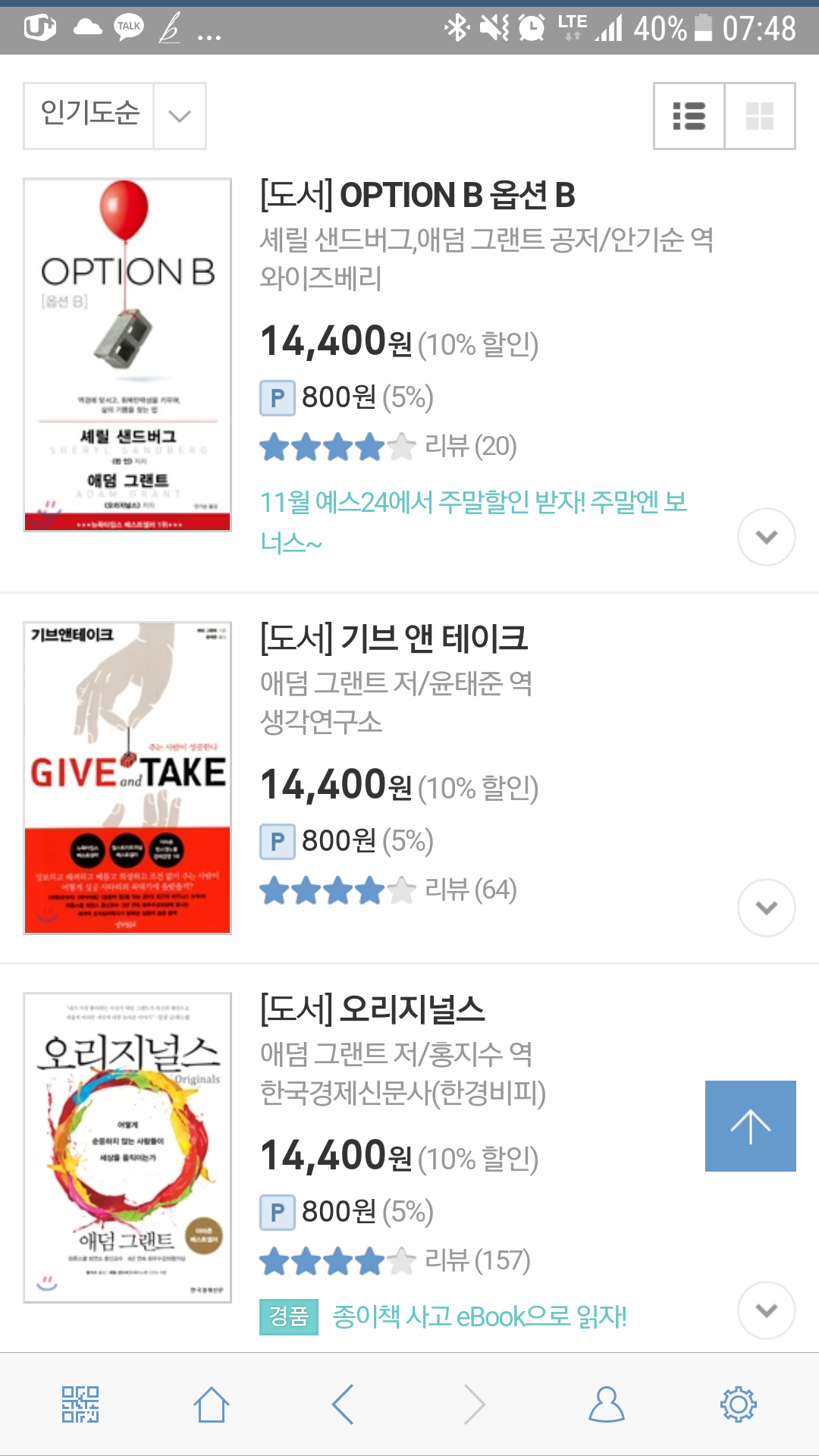 다시금 독서, 길게 깊게 읽기 도서군 두번째 책이다. 일단 신간이며, 셰릴 샌드버그와 애덤 그랜트 두 사람의 조합만으로도 분명 먹고 들어간다. 솔직히 제목과 신간 저자만을 보고 구매한터라 어떤 내용인지는 확인은 못했다. 비즈니스 자기관리 처세류일거라는 생각뿐이였다.
